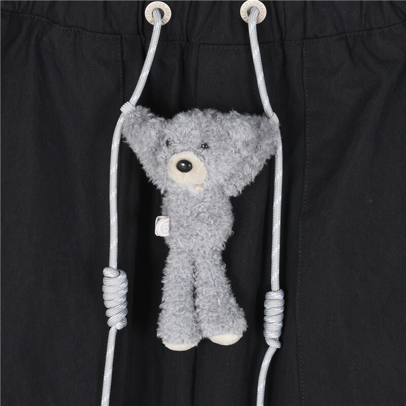 Embrace street-style with these black cargo pants featuring a unique double-waist design and multiple functional pockets for enhanced practicality. Crafted for comfort and durability, they’re accented with a charming plush doll pendant, adding a playful touch to this versatile piece.