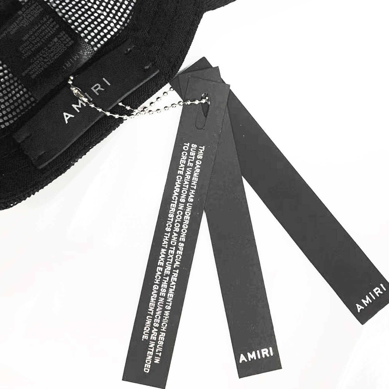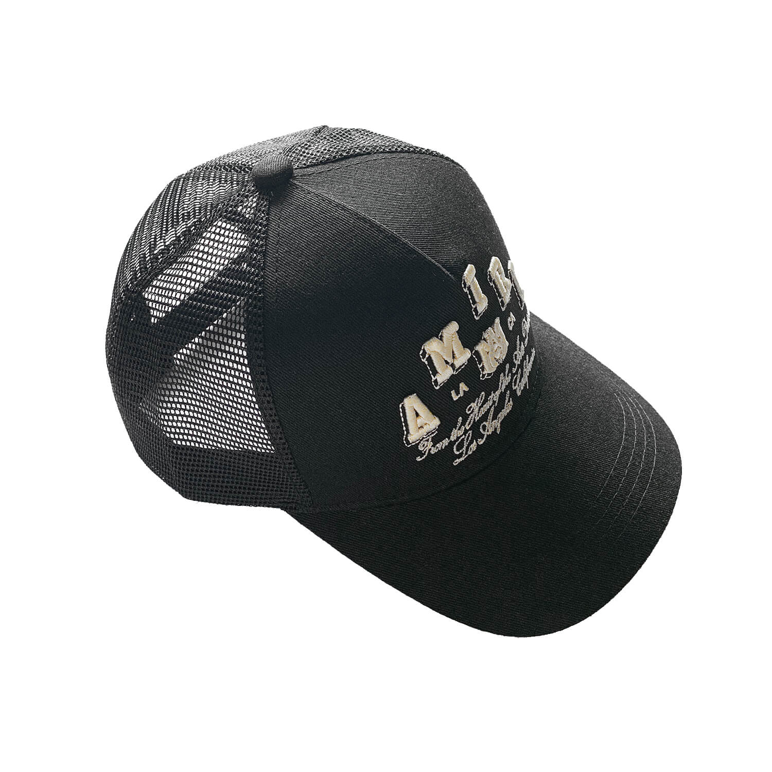 Black mesh cap with a statement. Features intricate gold embroidery referencing Amiri’s Los Angeles roots. A bold, luxe touch for your everyday look.