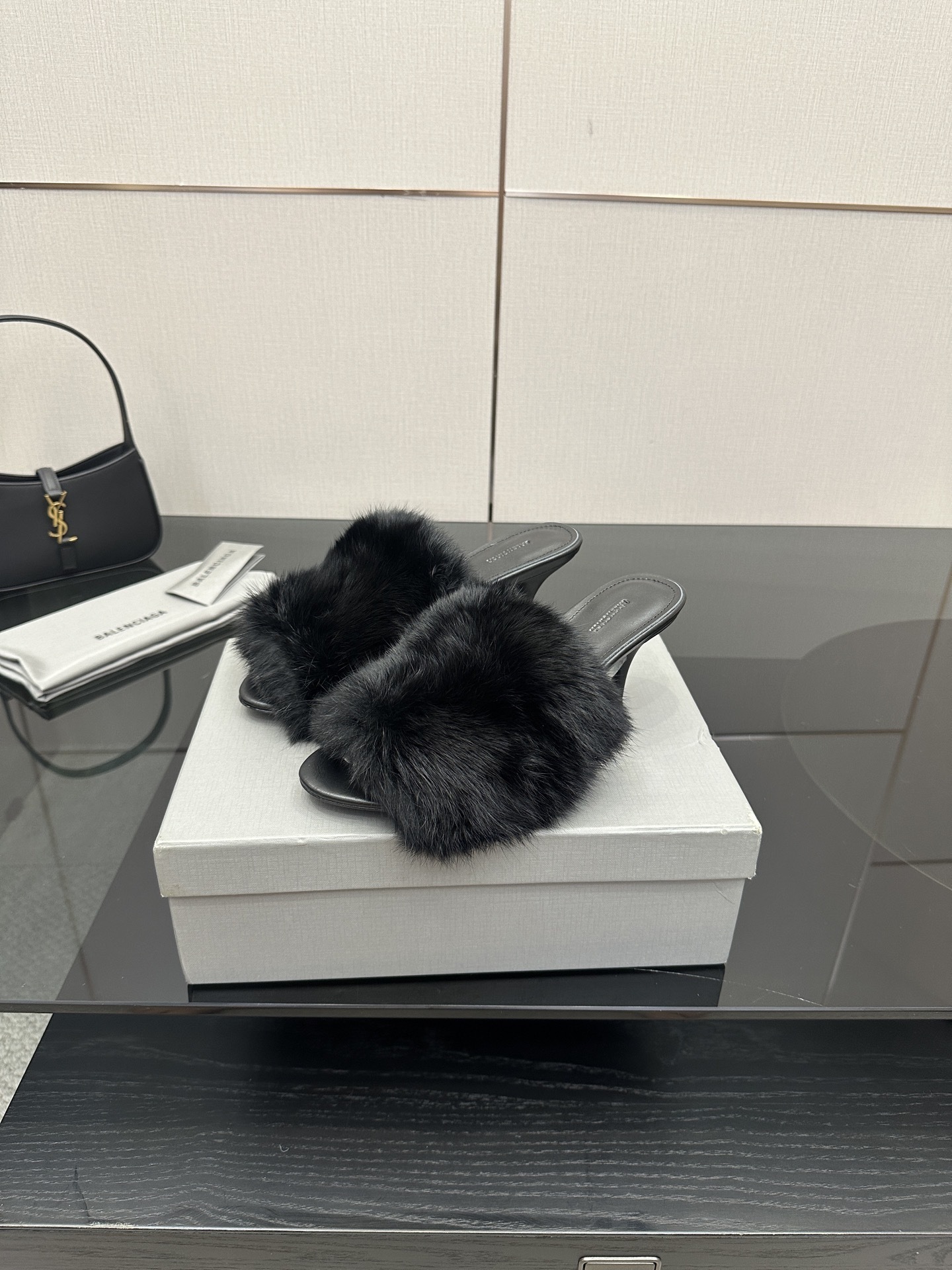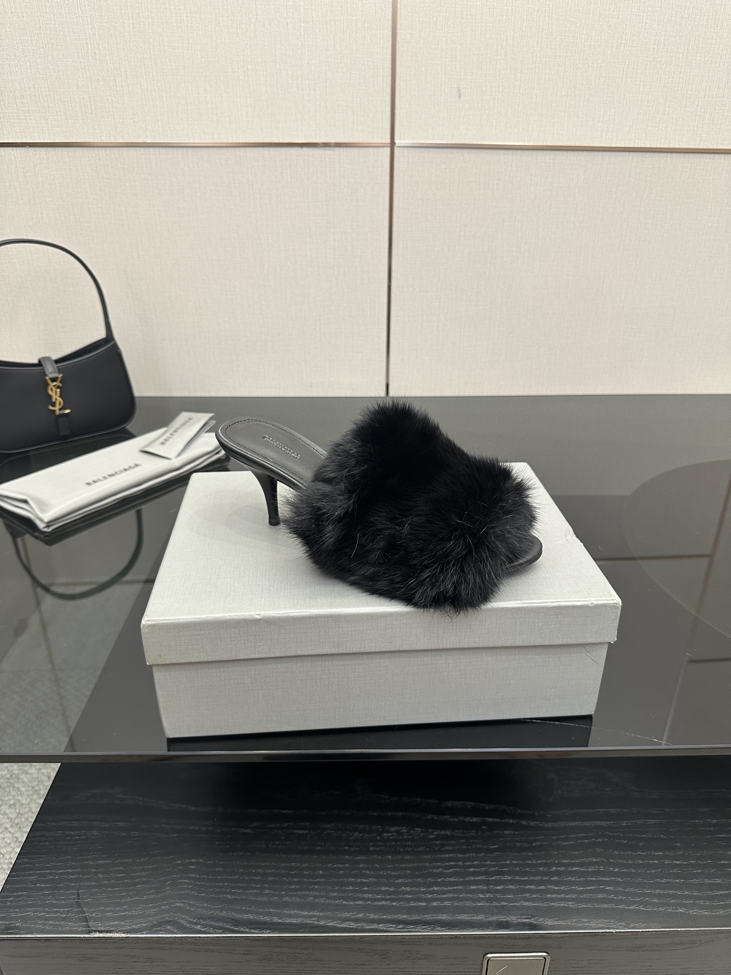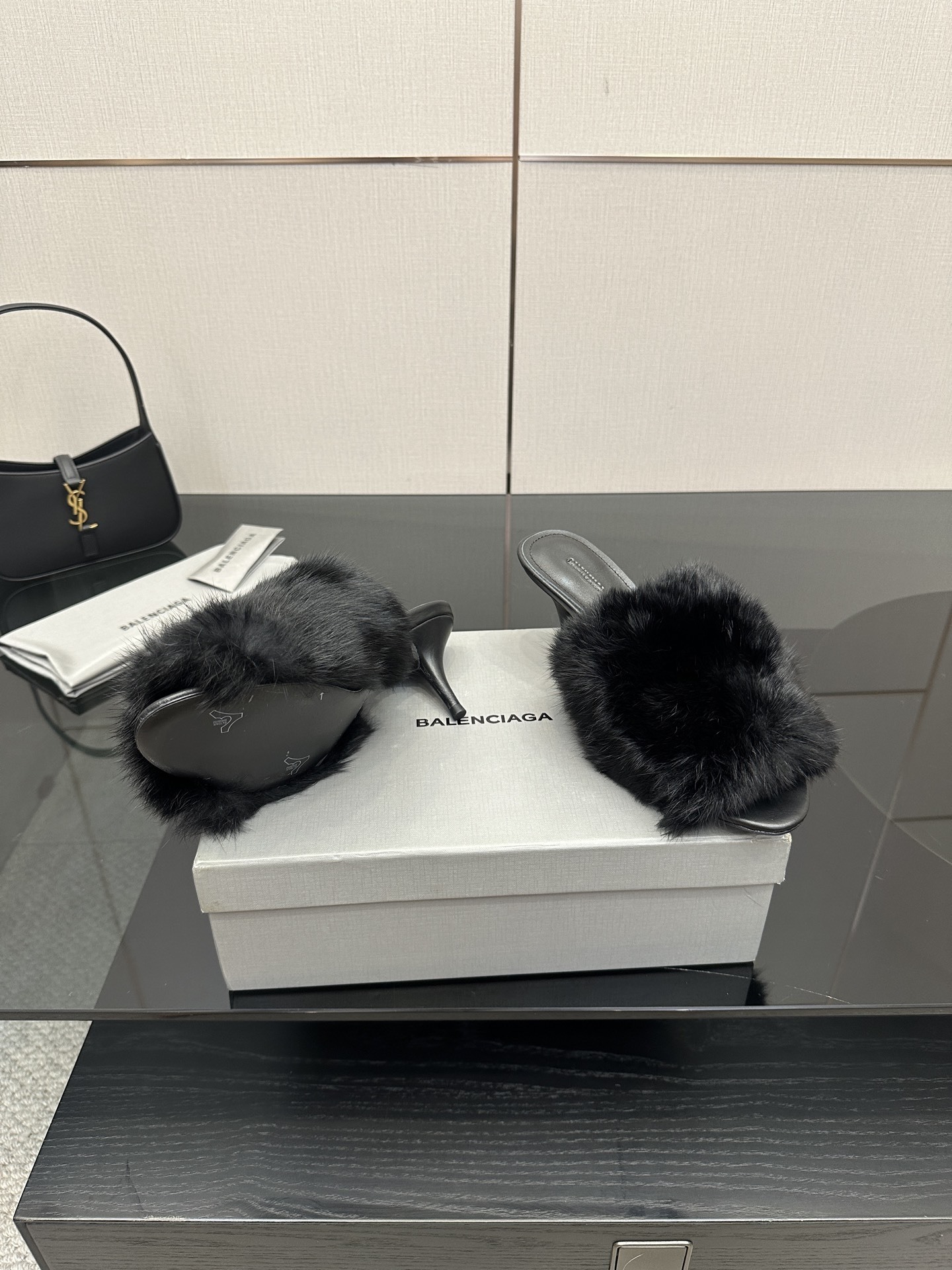 The Balenciaga Black Faux Fur Heels are a daring statement piece that blends luxury with playful sophistication. Crafted with sleek black leather soles and adorned with plush faux fur uppers, these heels showcase Balenciaga’s bold, fashion-forward aesthetic.