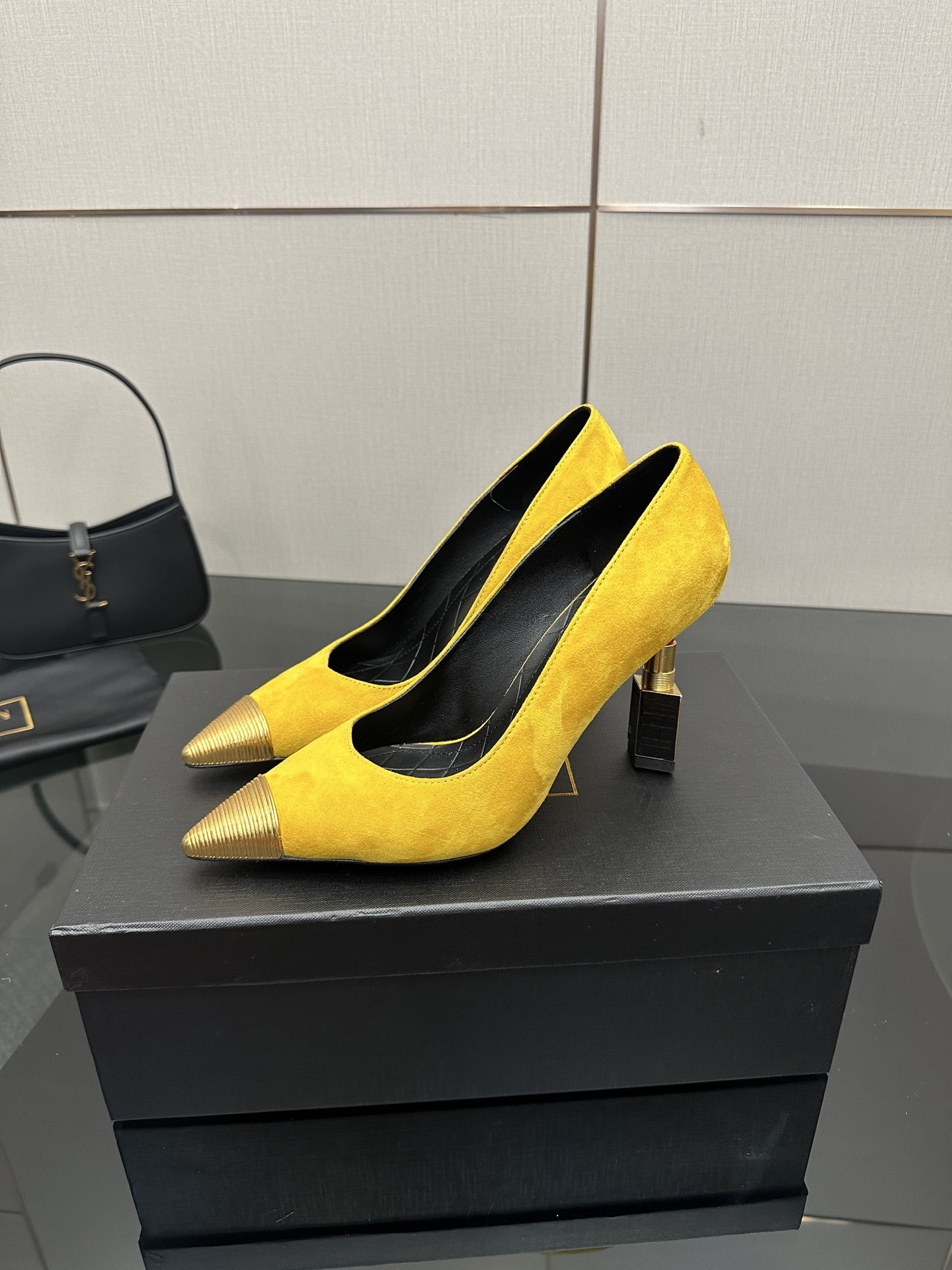 The standout feature, a lipstick-inspired block heel, embodies the brand’s innovative spirit and transforms these heels into wearable art.