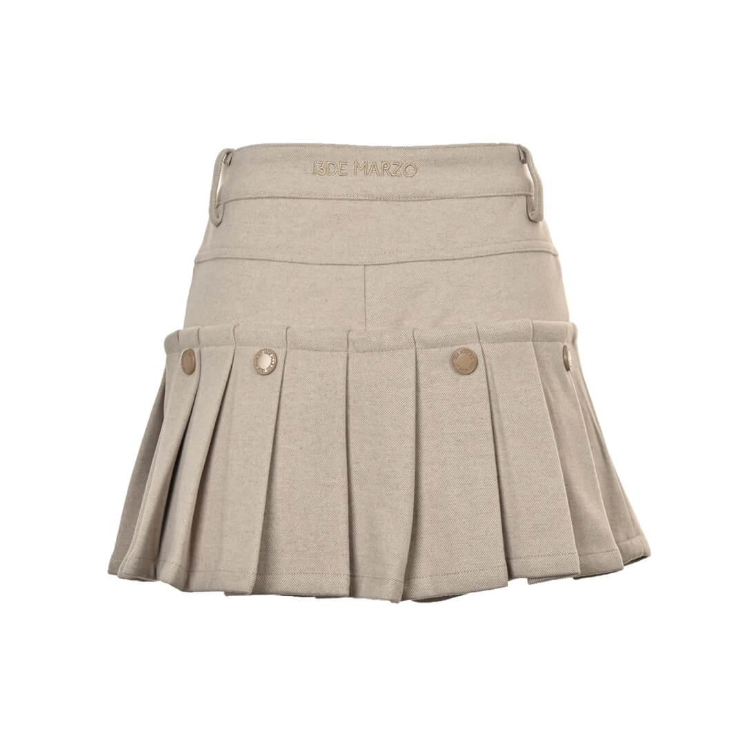 Embrace playful versatility with this beige multifunctional garment, featuring a clever button design that allows for easy conversion between a stylish pleated mini-skirt and comfortable shorts. Designed with a high-waist and accented by an adorable plush charm, it offers both retro elegance and modern practicality.