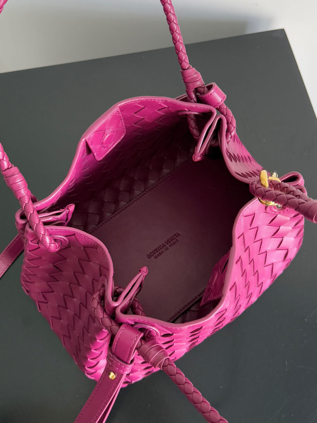 Add a pop of luxury to your wardrobe with the Bottega Veneta Intrecciato Small Wallace Shoulder Bag. The bag is meticulously crafted from supple leather, featuring the signature Intrecciato weave that has become synonymous with Bottega Veneta’s timeless style. The eye-catching magenta hue is both bold and sophisticated, adding a modern touch to this classic design.