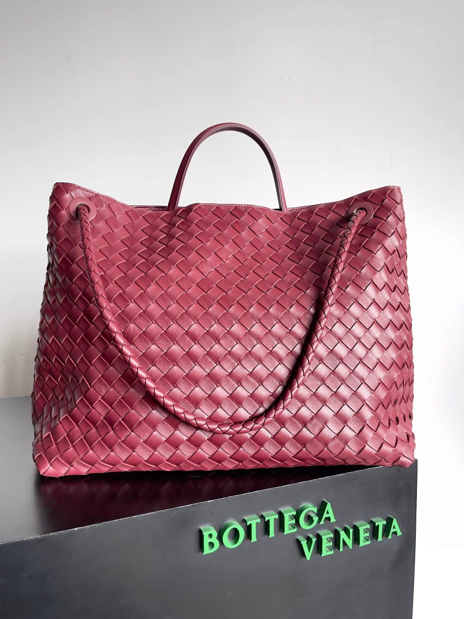 Experience the art of refined luxury with the Bottega Veneta Large Andiamo Tote Bag in burgundy Intrecciato leather. This iconic piece from Bottega Veneta showcases impeccable craftsmanship, with its signature Intrecciato weaving that provides not only aesthetic elegance but long-lasting durability.