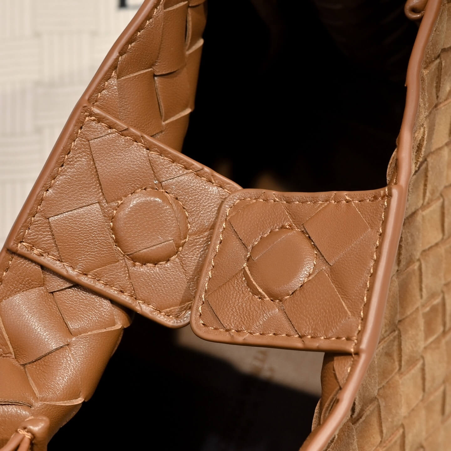 Premium Intrecciato suede in Tan, showcasing the iconic Bottega Veneta weave
