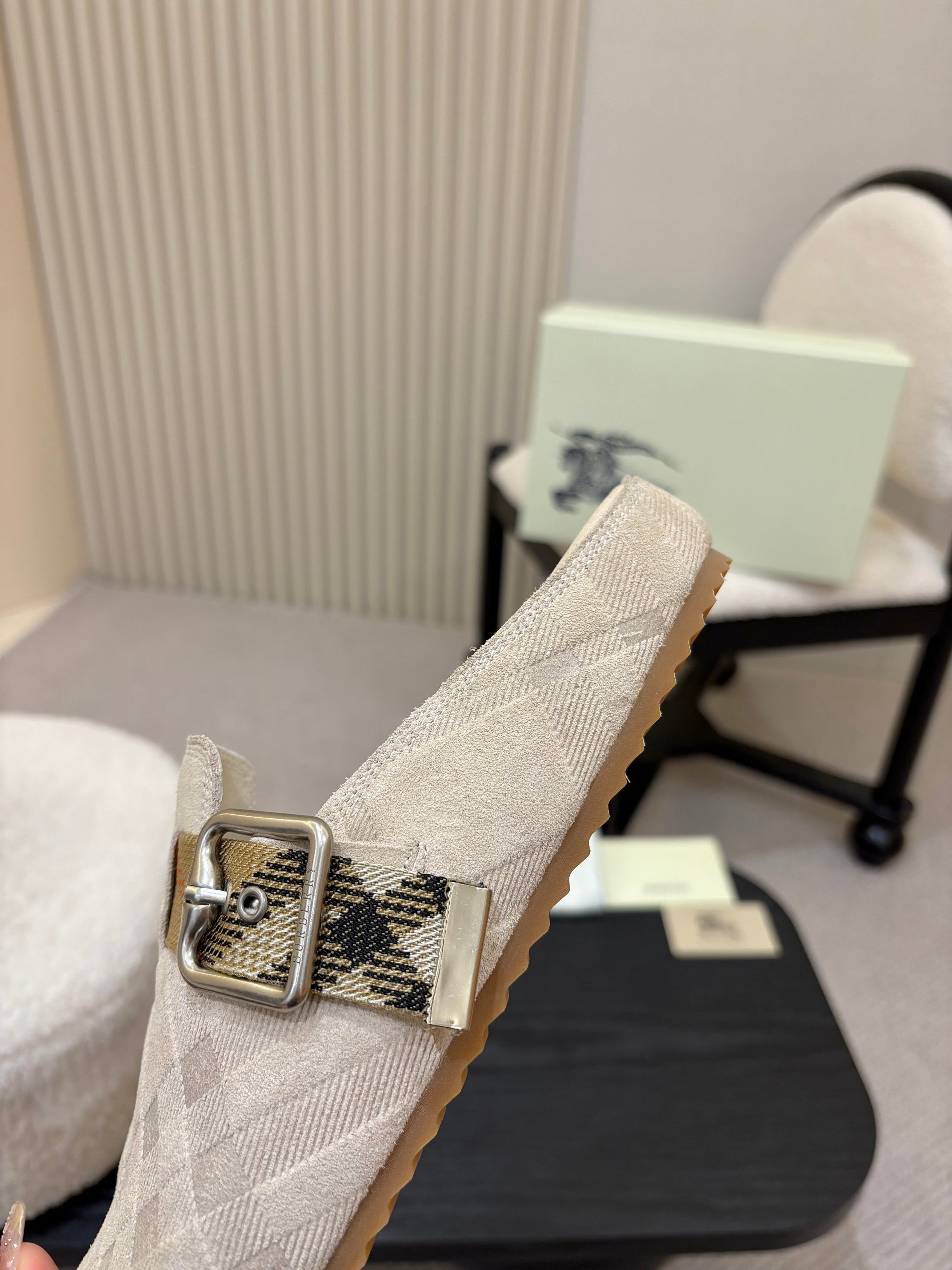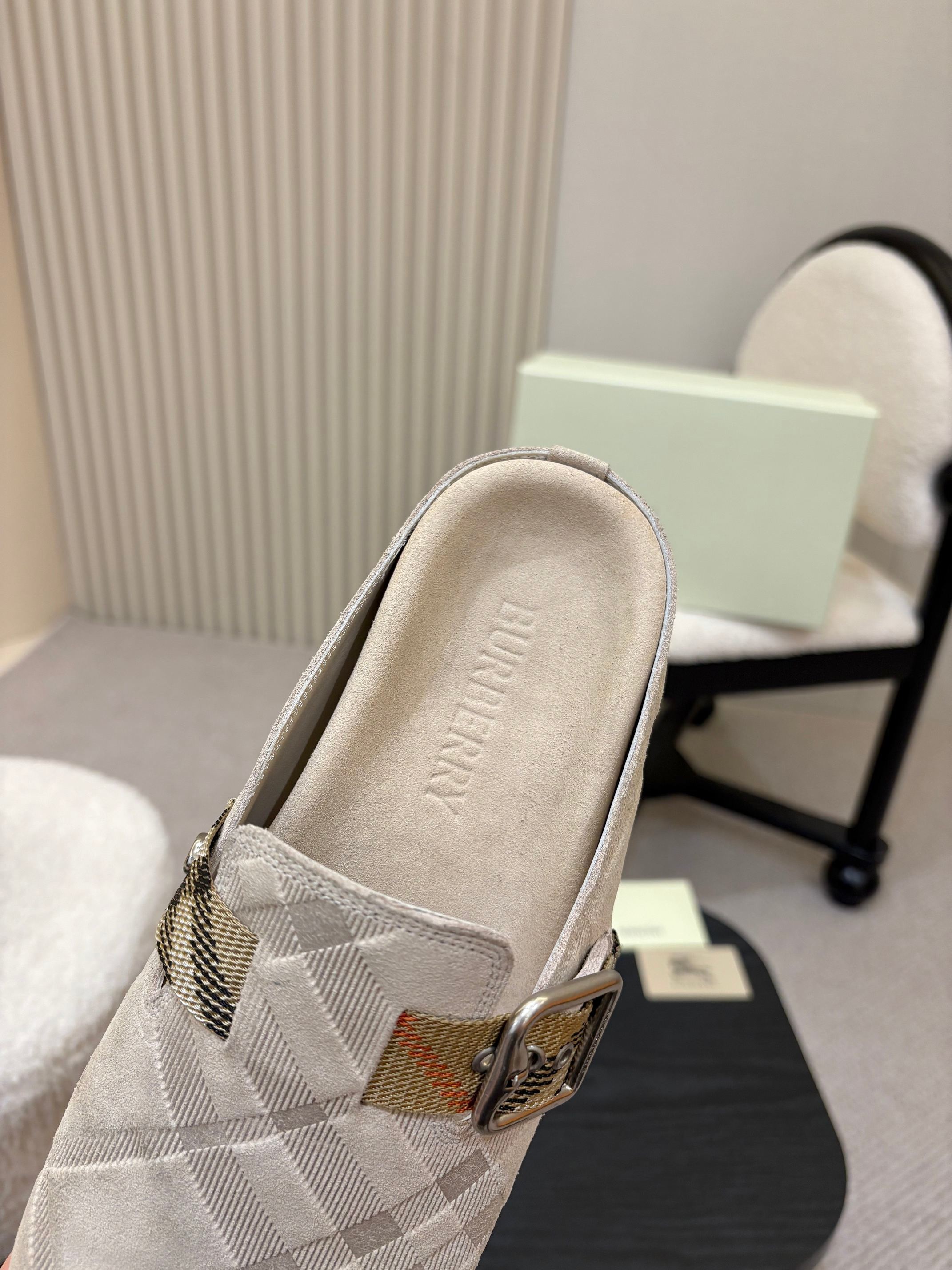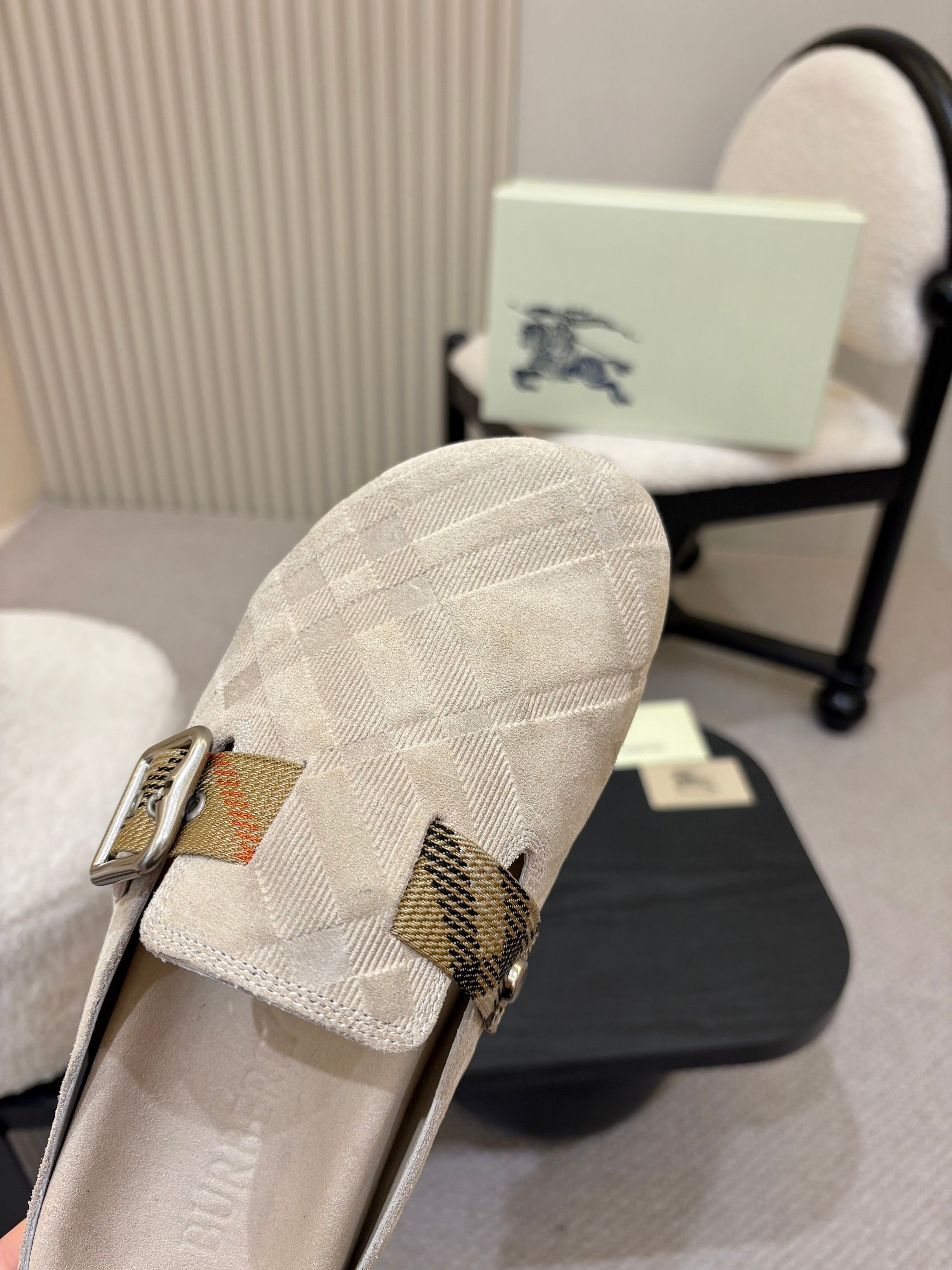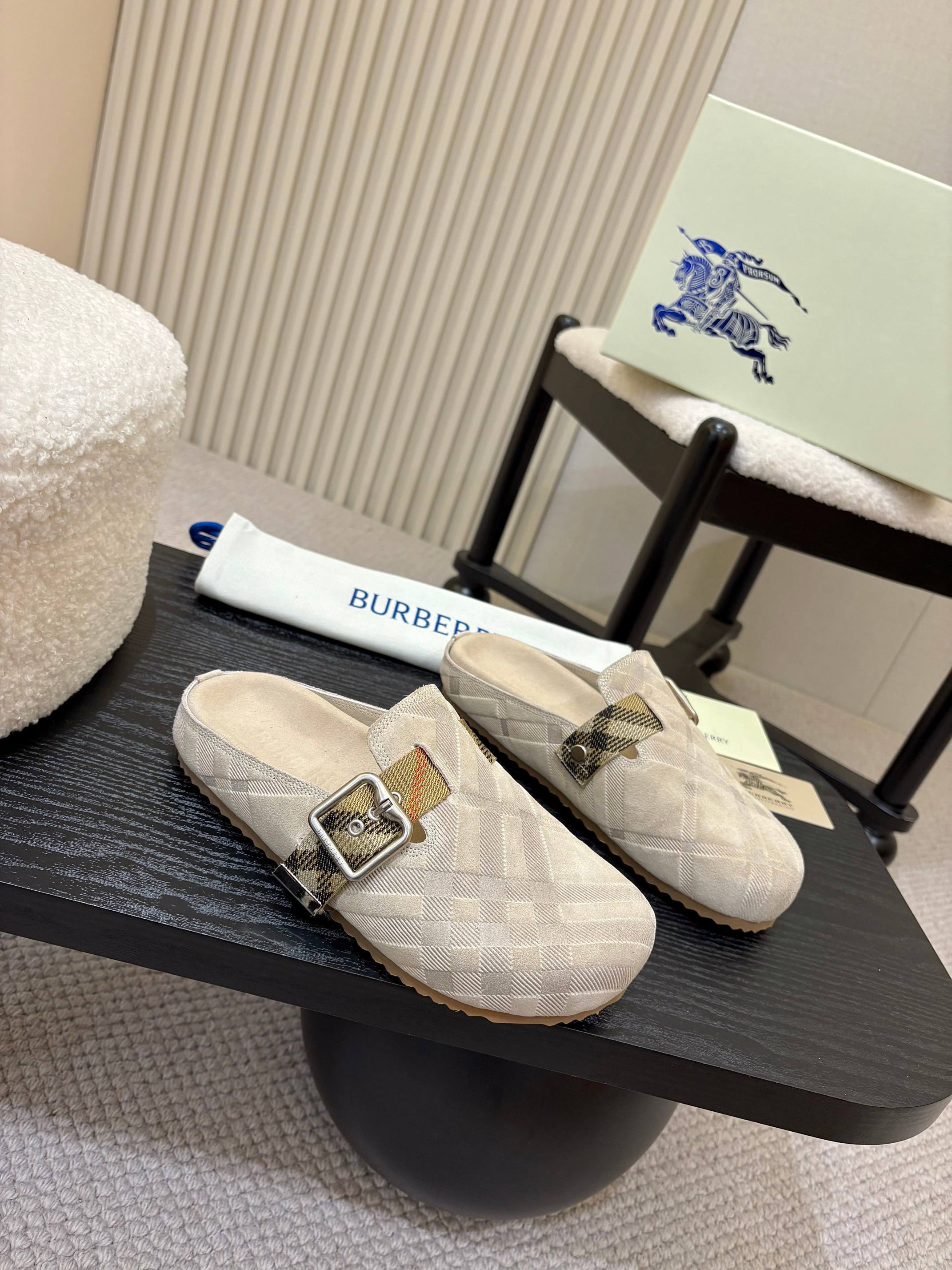 The Burberry Beige Check Pattern Buckle Clog Slides capture refined British heritage through a soft, neutral palette. Cloaked in a tonal beige Burberry-style check, these slides embody understated elegance while offering a modern interpretation of the classic clog silhouette.