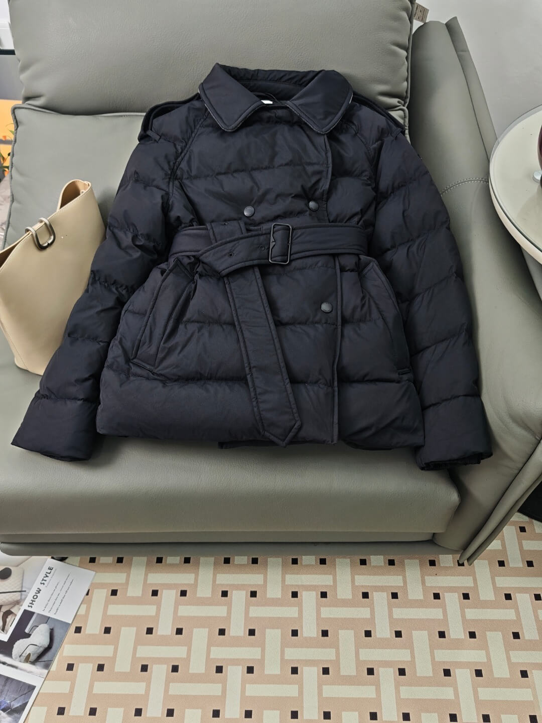 Q: Is the belt removable? A: The belt is designed as a key part of the jacket’s silhouette and is not intended to be removed.
