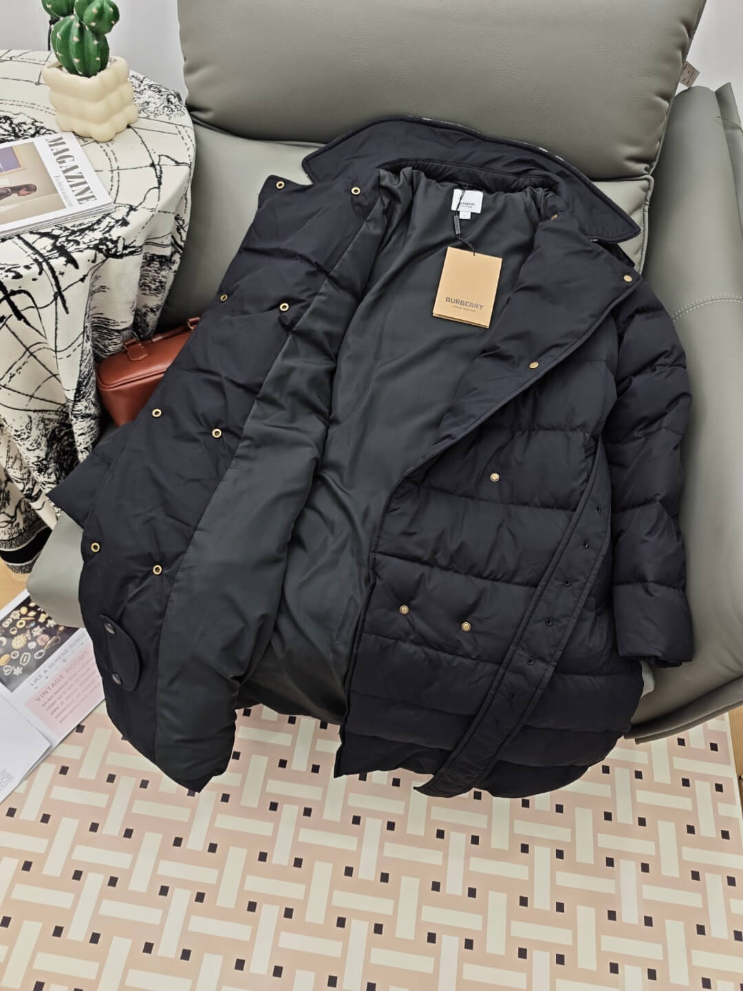 Embrace the chill of winter with this Burberry-inspired black belted puffer down coat, a perfect fusion of sophisticated style and luxurious warmth. The long, elegant silhouette provides a powerful and streamlined look against the cold. Its plush, quilted texture is filled with a generous layer of down, creating a warm and insulating shield while maintaining an effortlessly chic form. This coat is a statement piece that ensures you remain both insulated and impeccably styled in a timeless color.
