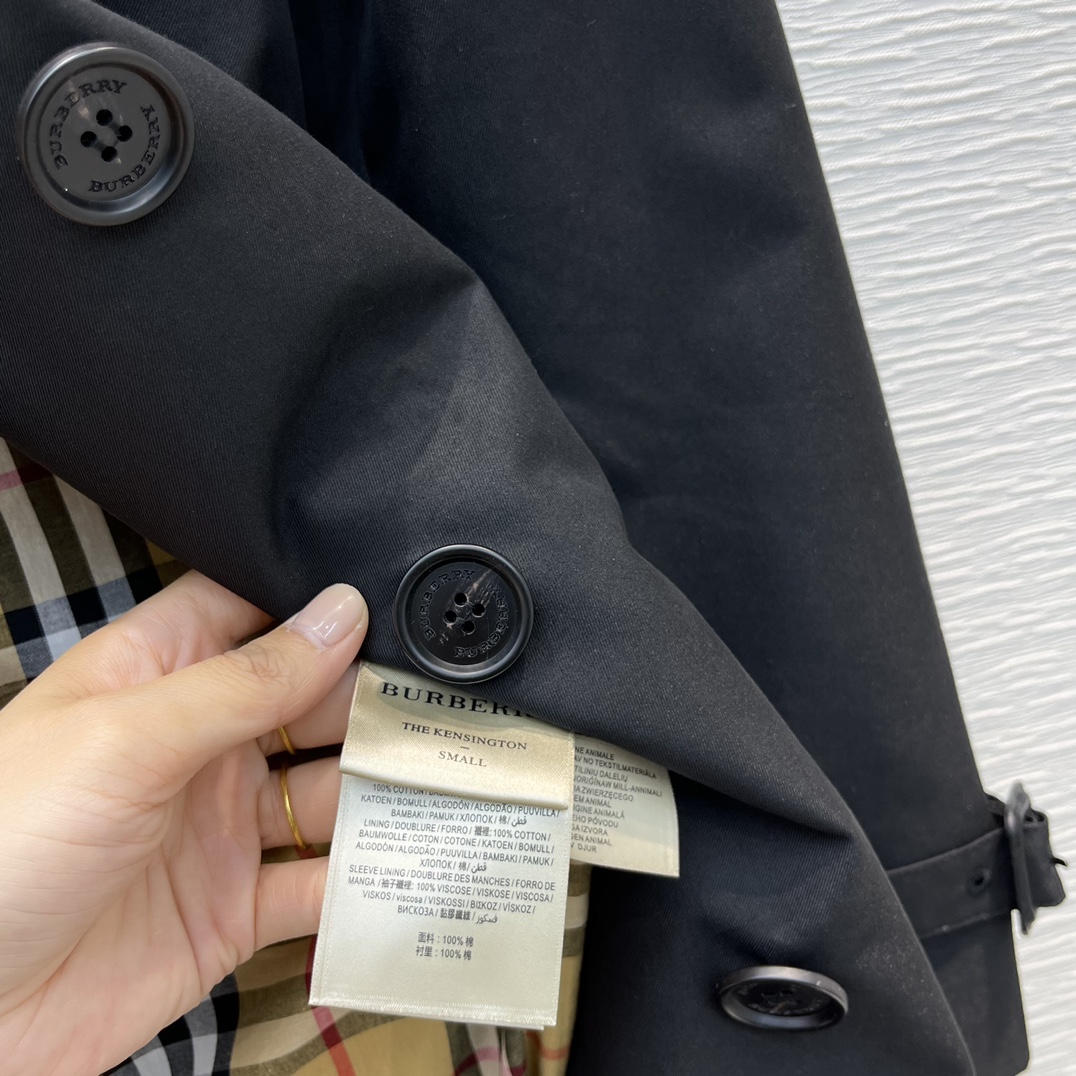 A double-breasted front with signature horn buttons for classic trench detailing.