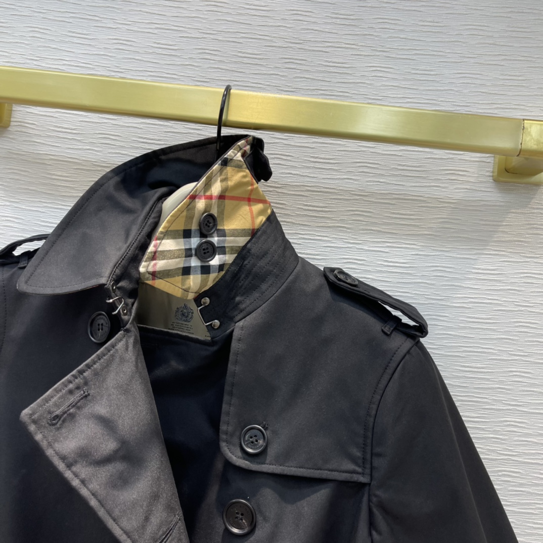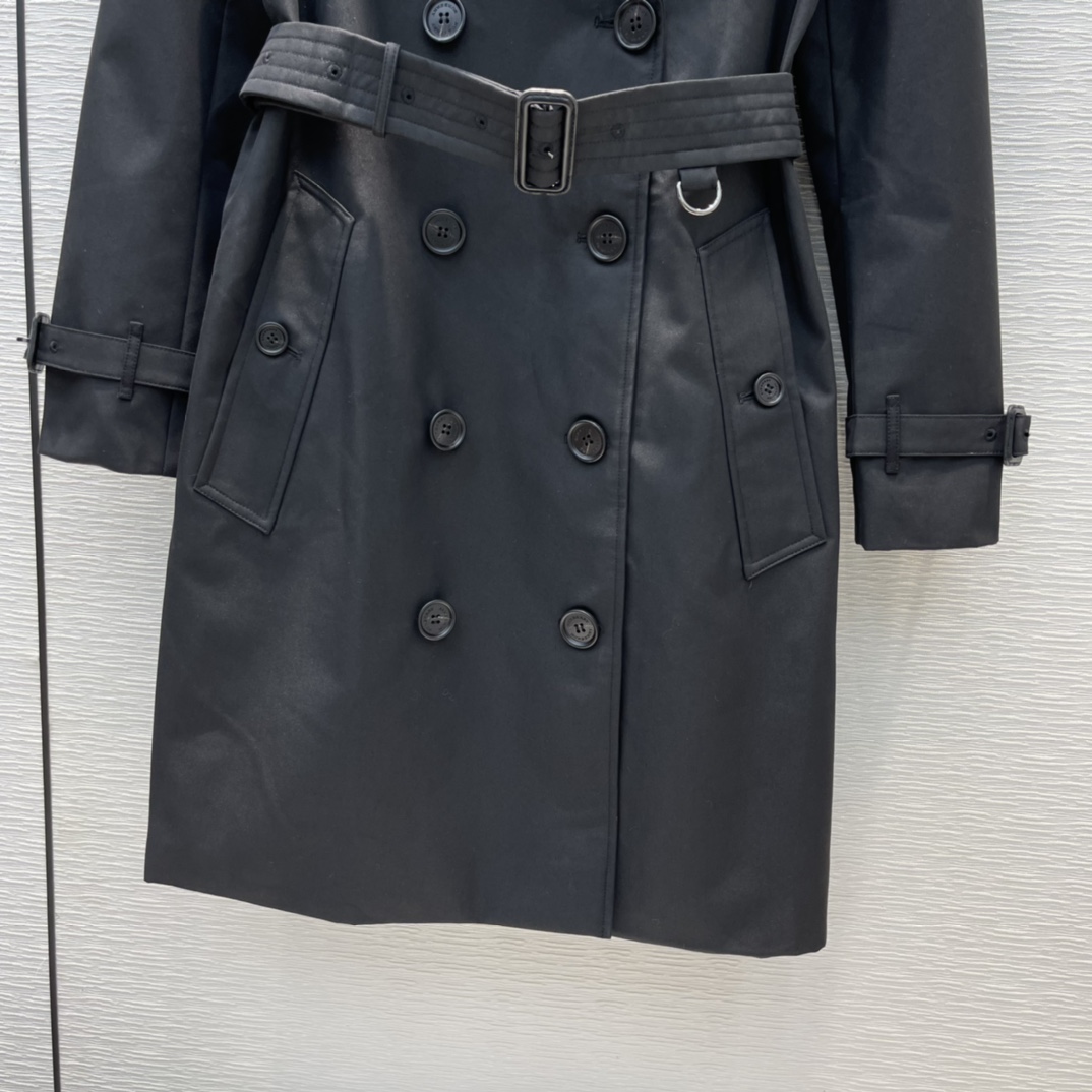 The Burberry Black Mid-Length Kensington Heritage Trench Coat embodies timeless sophistication and modern craftsmanship.