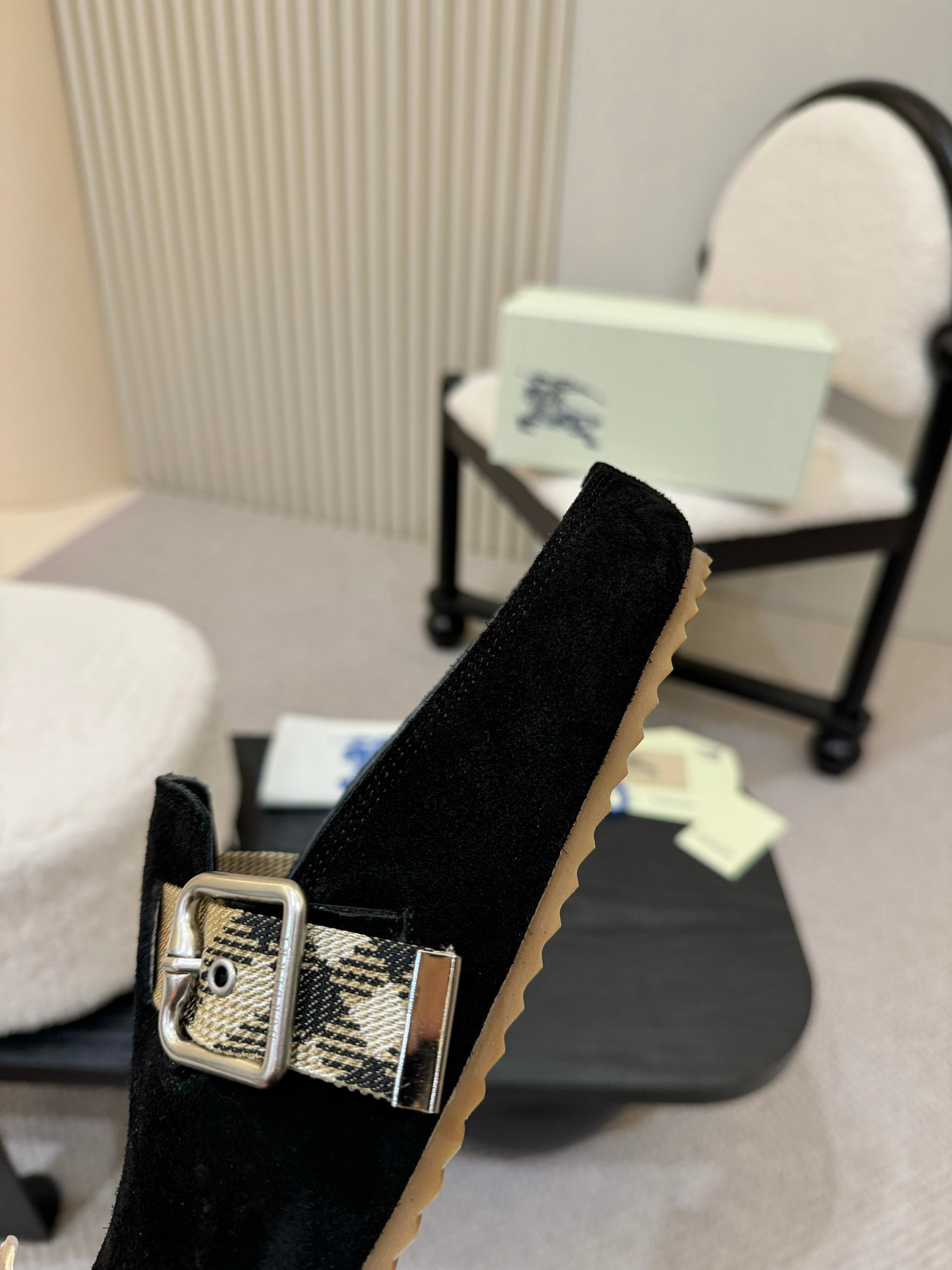 A signature Burberry heritage-check strap accents the upper, contrasted beautifully against the dark suede for a striking visual balance. The polished metal buckle allows for a customized fit while enhancing the crafted, luxury feel. Inside, a smooth suede-lined footbed delivers soft cushioning, ensuring comfort with every step.
