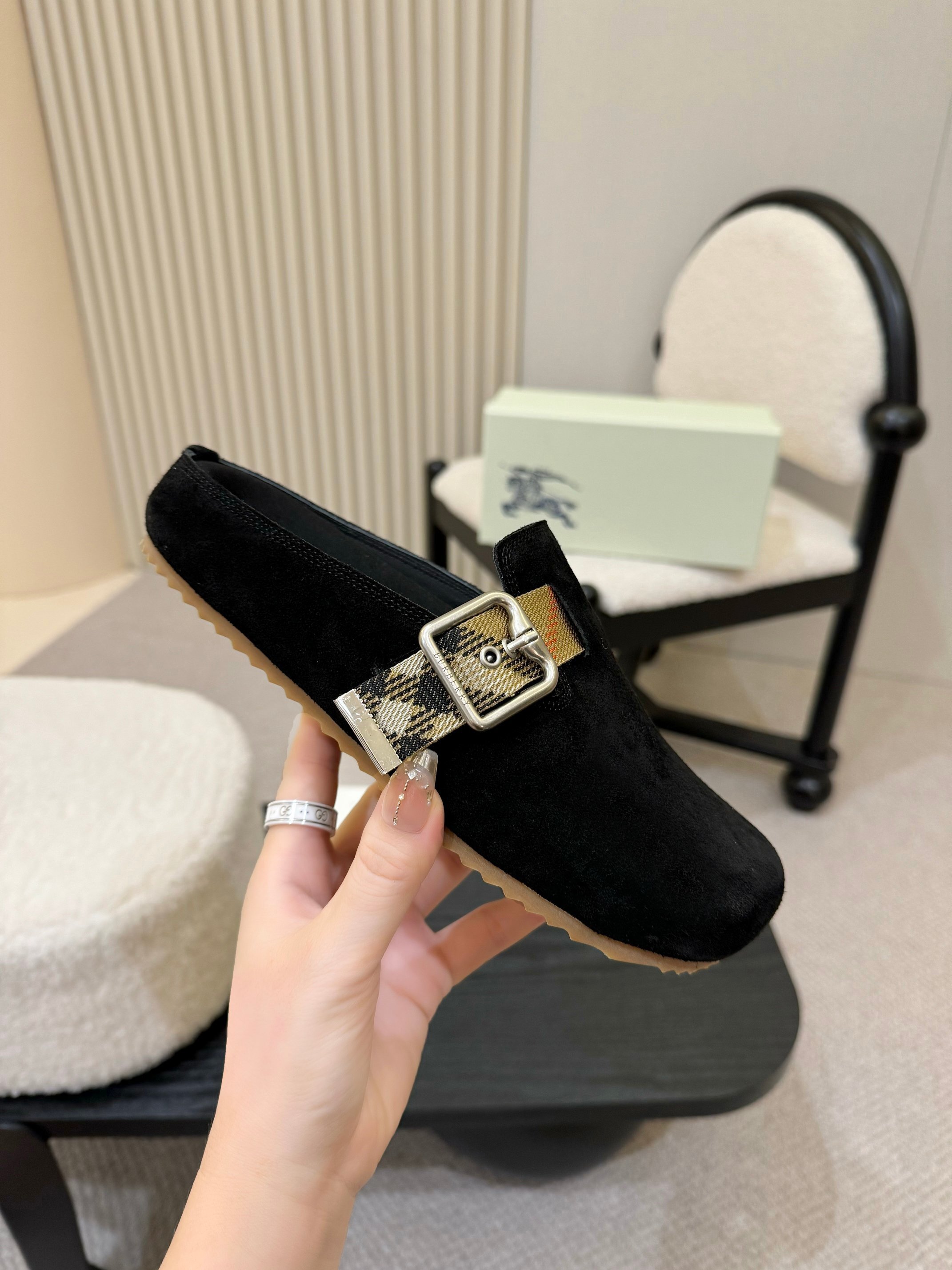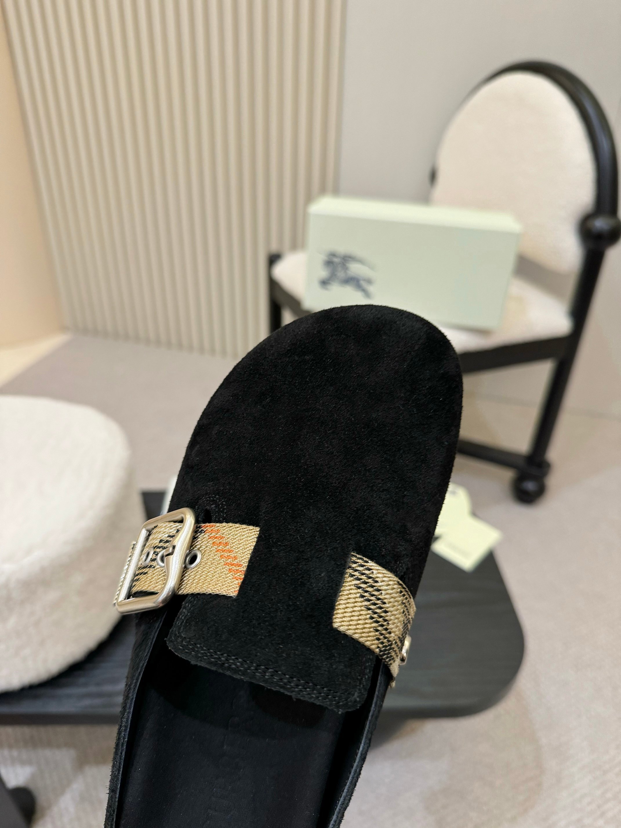 Model: Black Suede Check Buckle Clog Slides