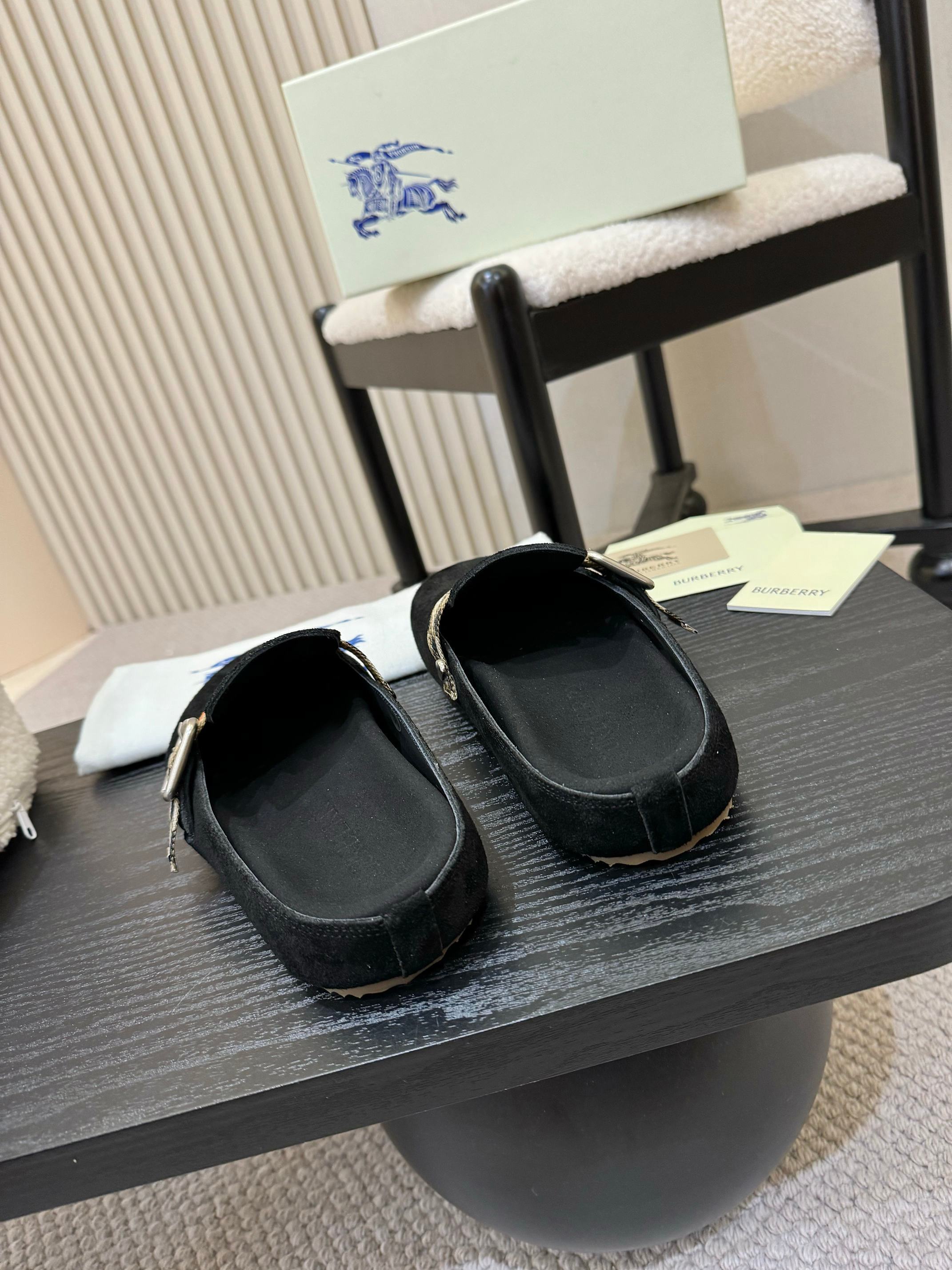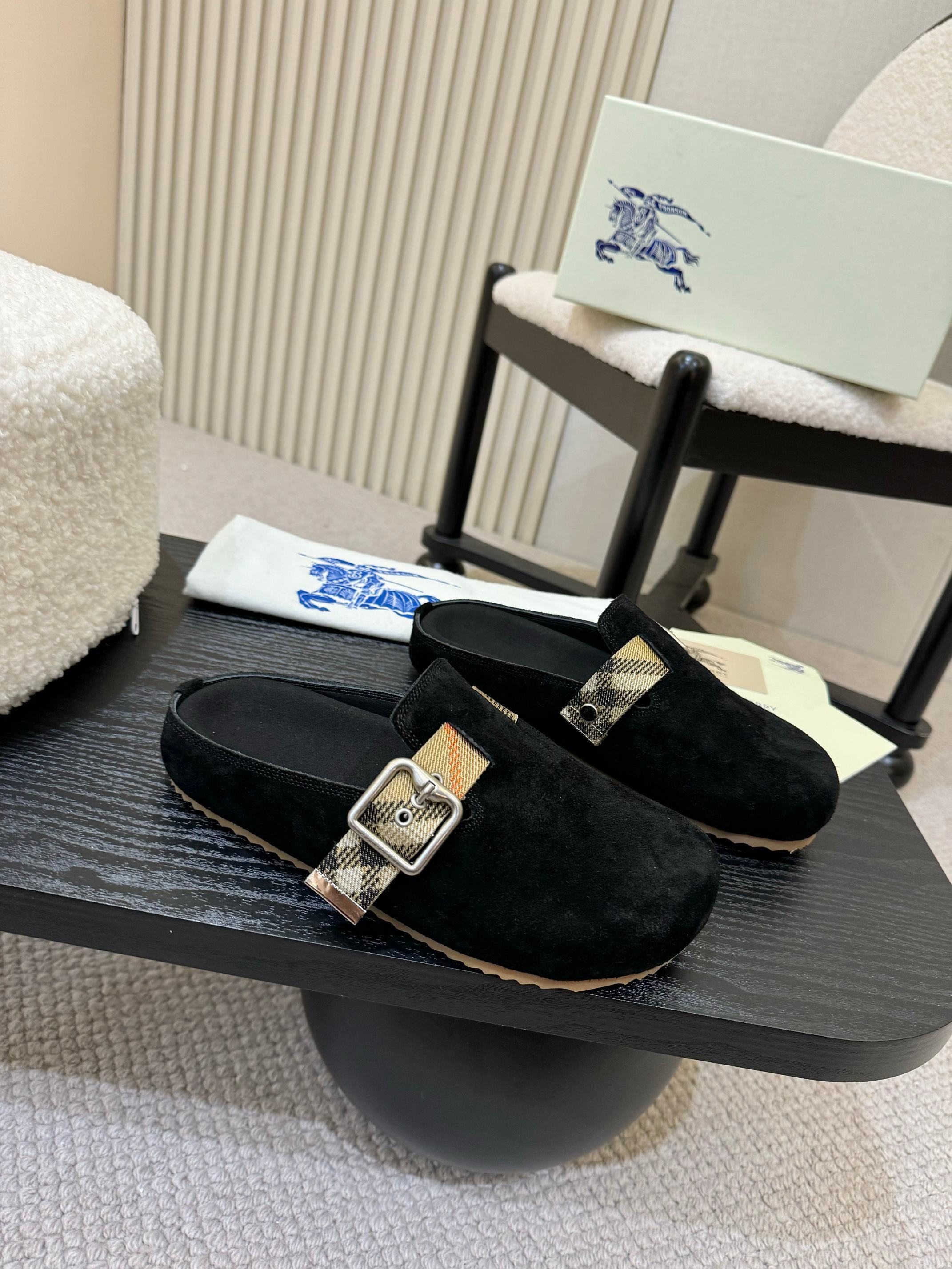 The Burberry Black Suede Check Buckle Clog Slides reinterpret a classic house aesthetic with a sleek, contemporary edge. Wrapped in deep black suede, this clog-style silhouette offers a refined minimalism that transitions effortlessly from casual daytime looks to polished off-duty styling.