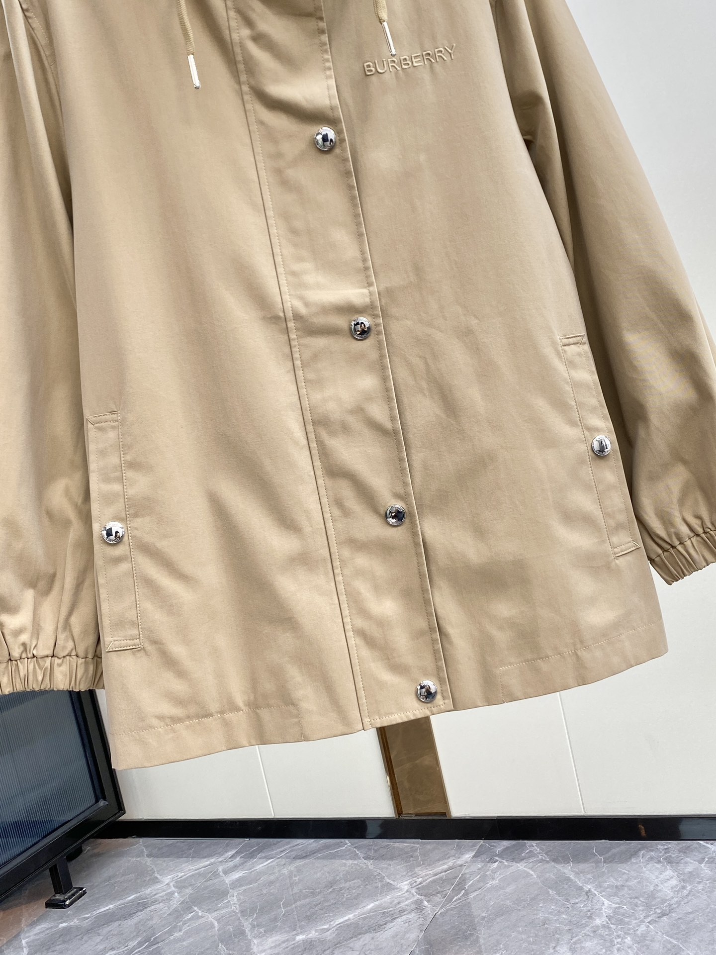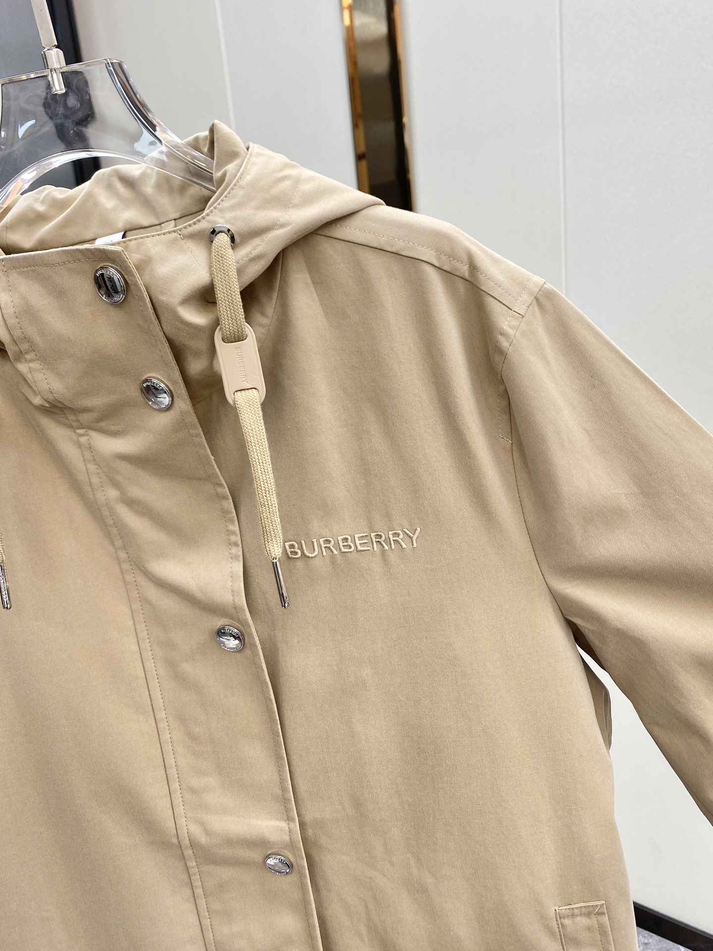Featuring a subtle Burberry logo embroidery, snap-button placket, and adjustable drawstring hood, this versatile piece merges heritage craftsmanship with contemporary ease.