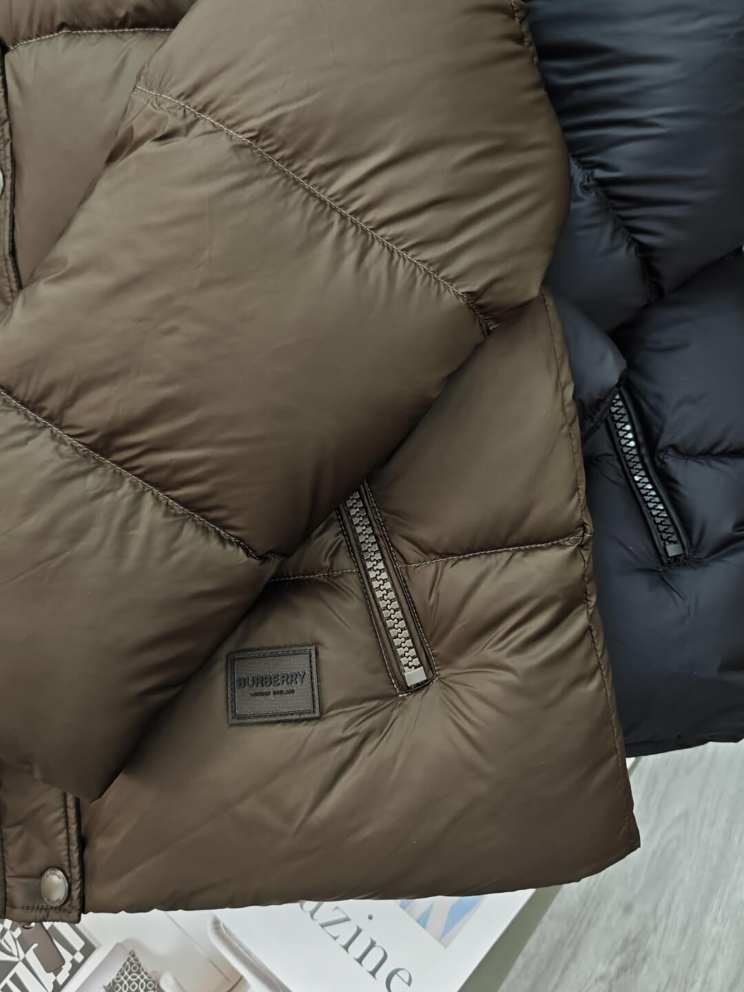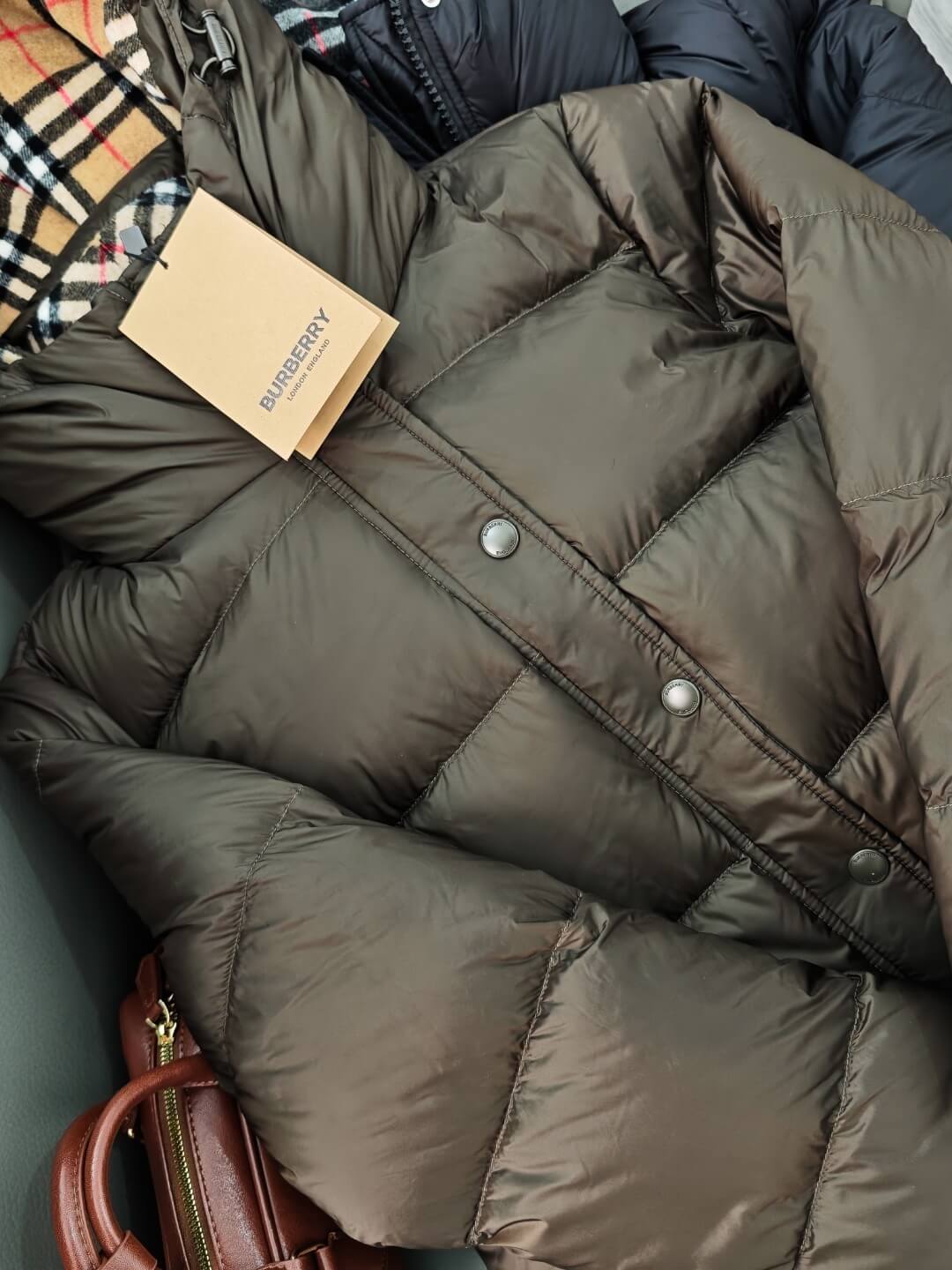 This jacket is a classic piece that combines the warmth of a down puffer with Burberry’s signature style. The jacket features a clean, horizontal quilting pattern that provides a modern and minimalist look, while the hood is lined with the recognizable Burberry check pattern, a subtle yet unmistakable mark of the brand’s sophisticated style. The neutral jungle green color makes it a versatile staple for any cold-weather wardrobe.