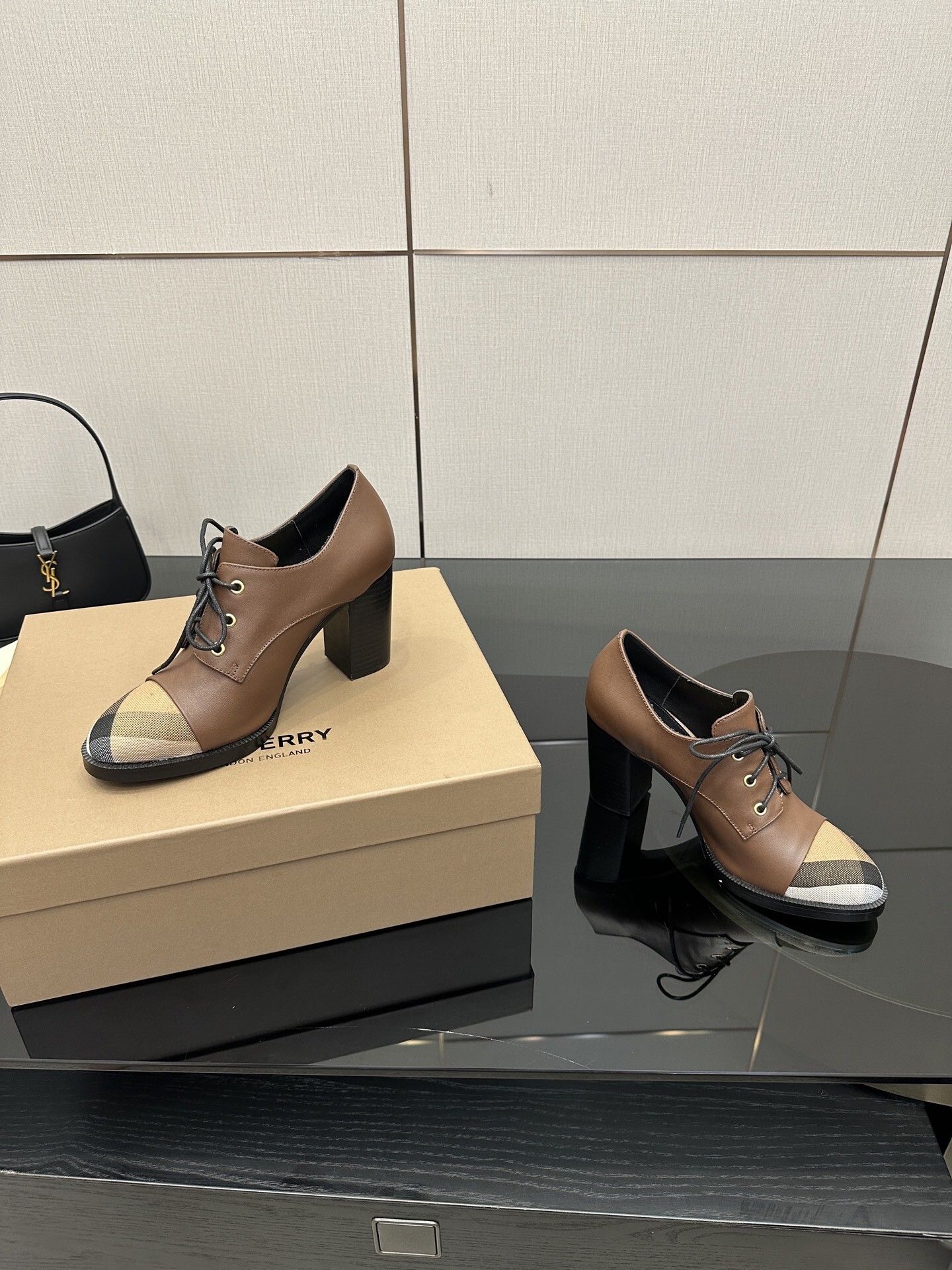 The Burberry Vintage Check Cap-Toe Leather Lace-Up Pumps combine classic British elegance with a modern edge.