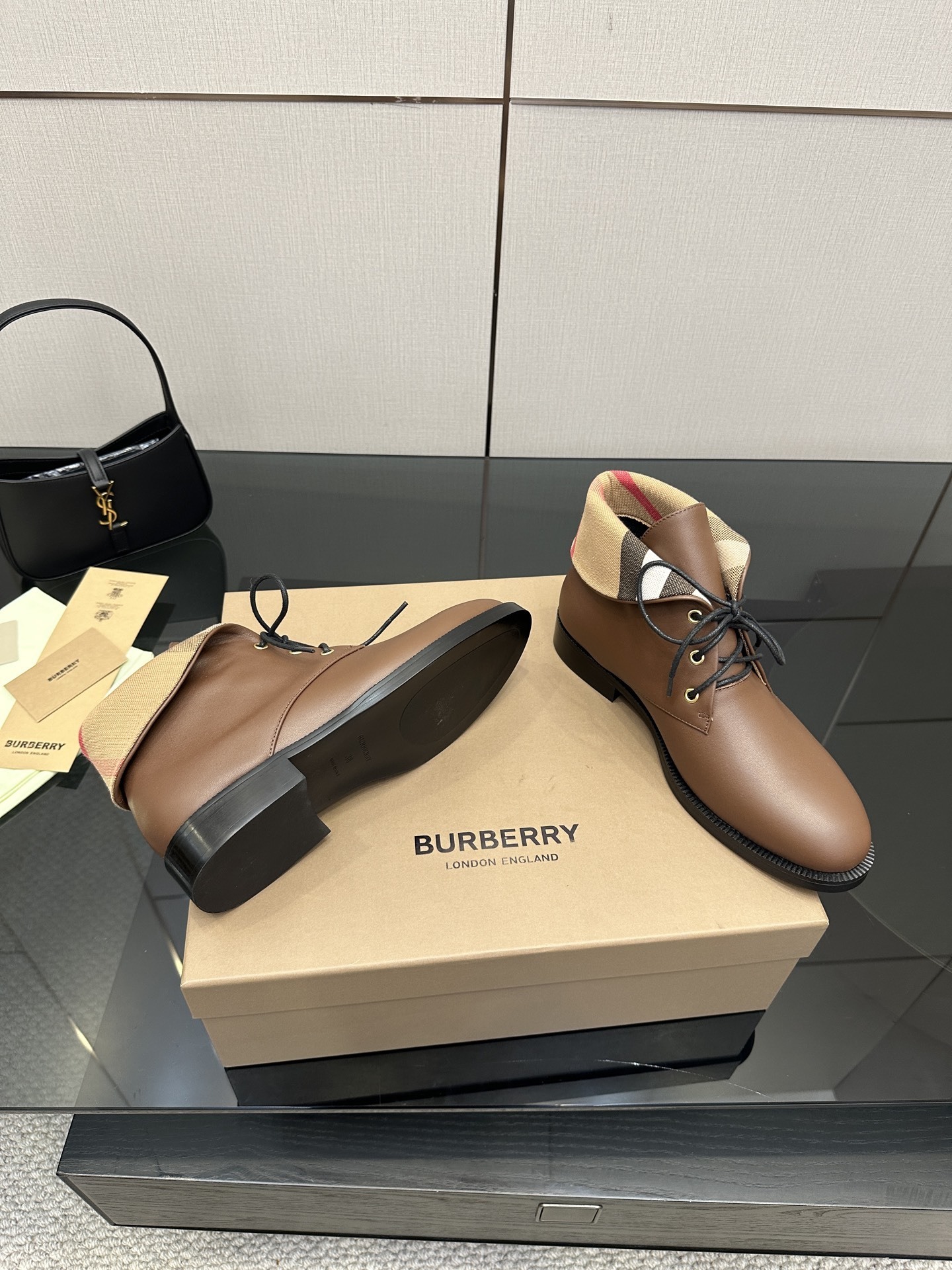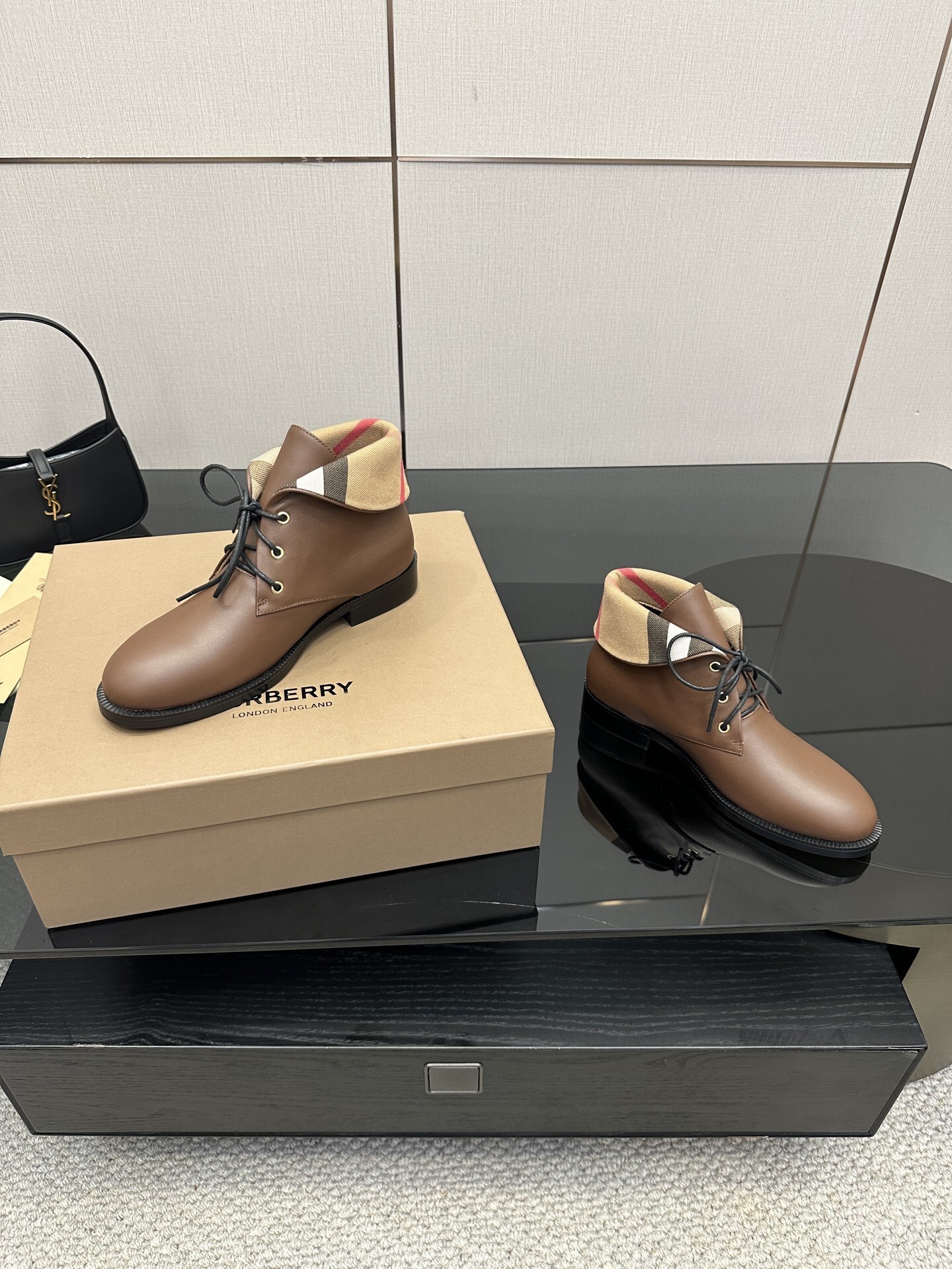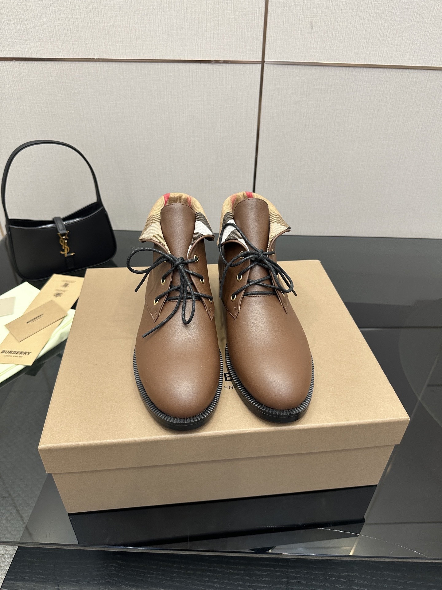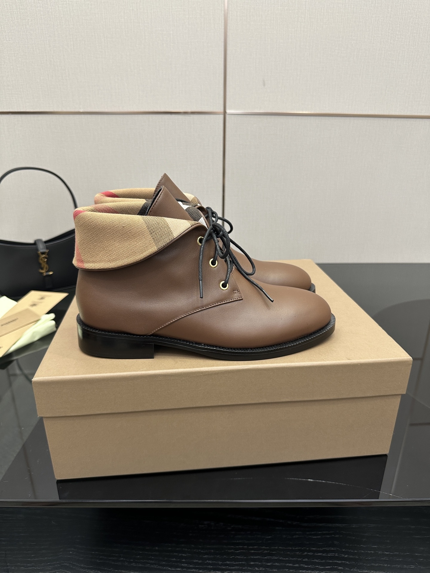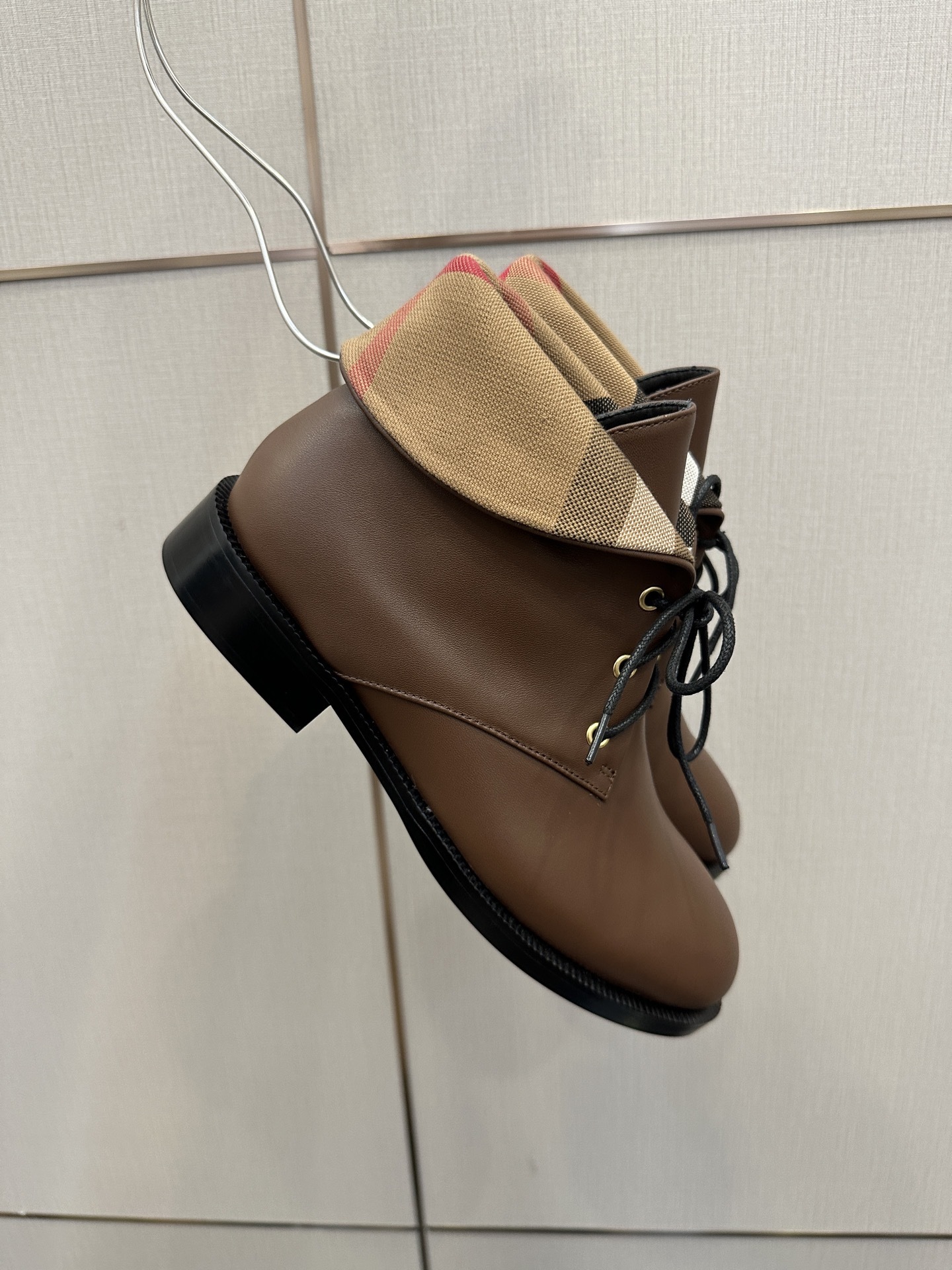The Burberry Vintage Check Fold-Over Brown Leather Ankle Boots deliver everyday elegance with a signature heritage touch.