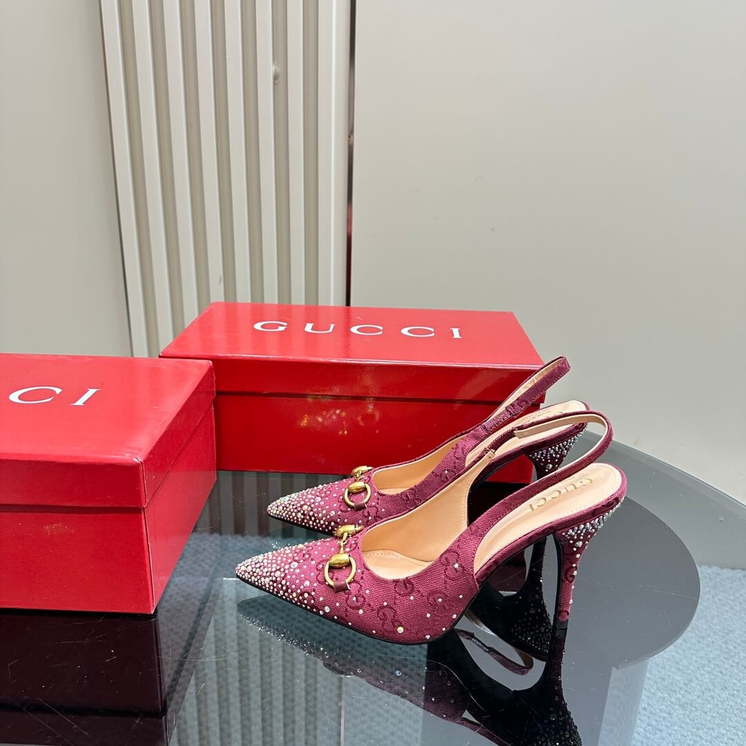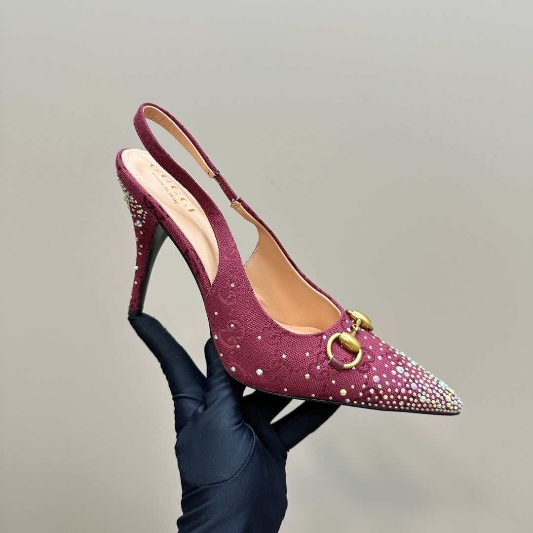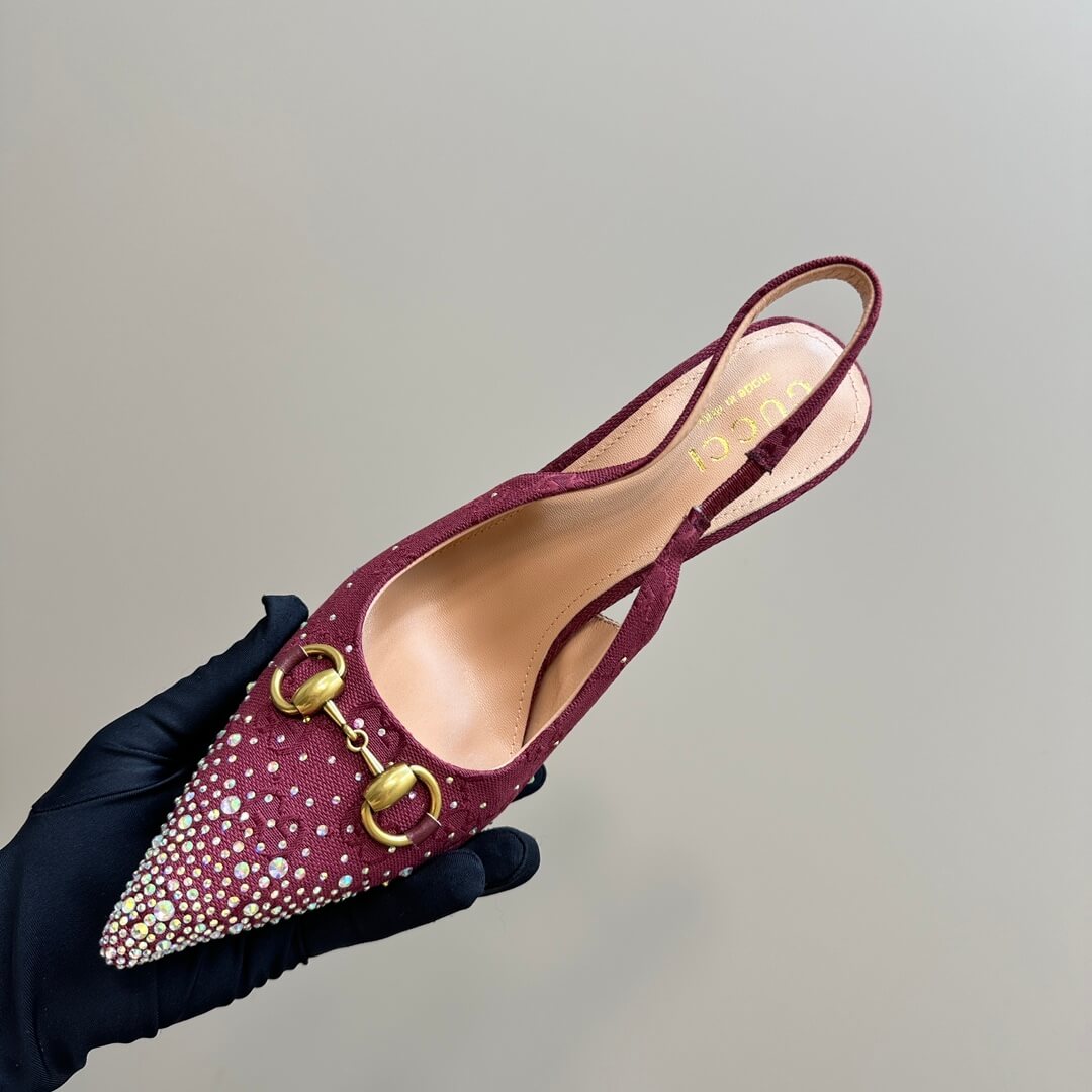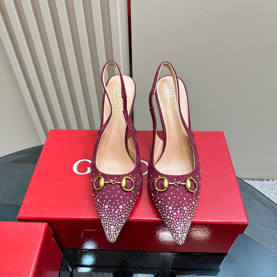 Make a statement with these Burgundy Gucci GG Crystal Embellished Slingback Stiletto Heels, a perfect blend of elegance and bold sophistication. Wrapped in Gucci’s iconic GG monogram canvas, these heels feature shimmering crystal embellishments that add an undeniable touch of glamour. The pointed toe elongates your silhouette, while the gold-tone horsebit detail enhances the luxury aesthetic. Designed with a slim stiletto heel and a sleek slingback strap, they offer both style and comfort for any upscale occasion. Whether it’s a gala, cocktail night, or a high-end event, these heels ensure you step out with confidence and grace.