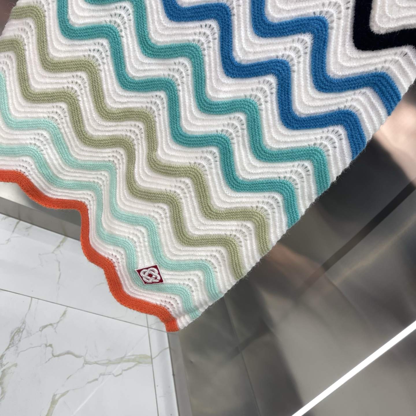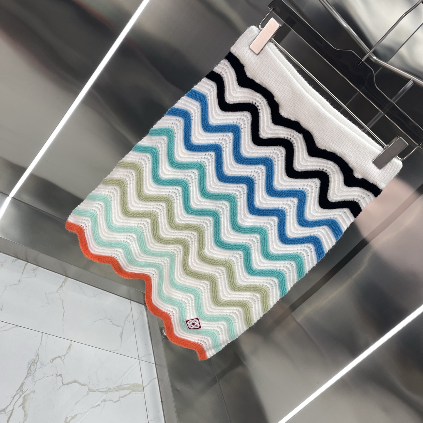 The coordinating skirt continues the undulating motif, finished with a scalloped hem and Casablanca’s signature diamond monogram patch — a symbol of spirited leisure and refined wanderlust.