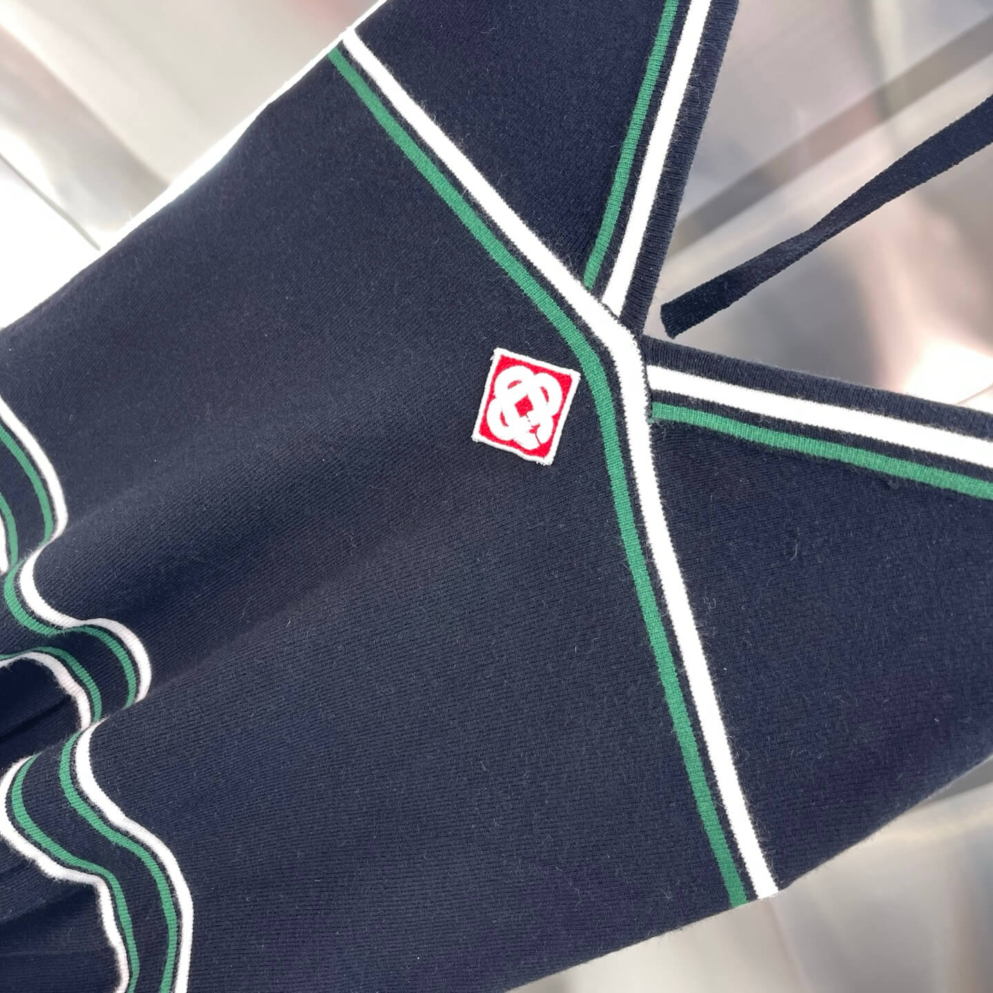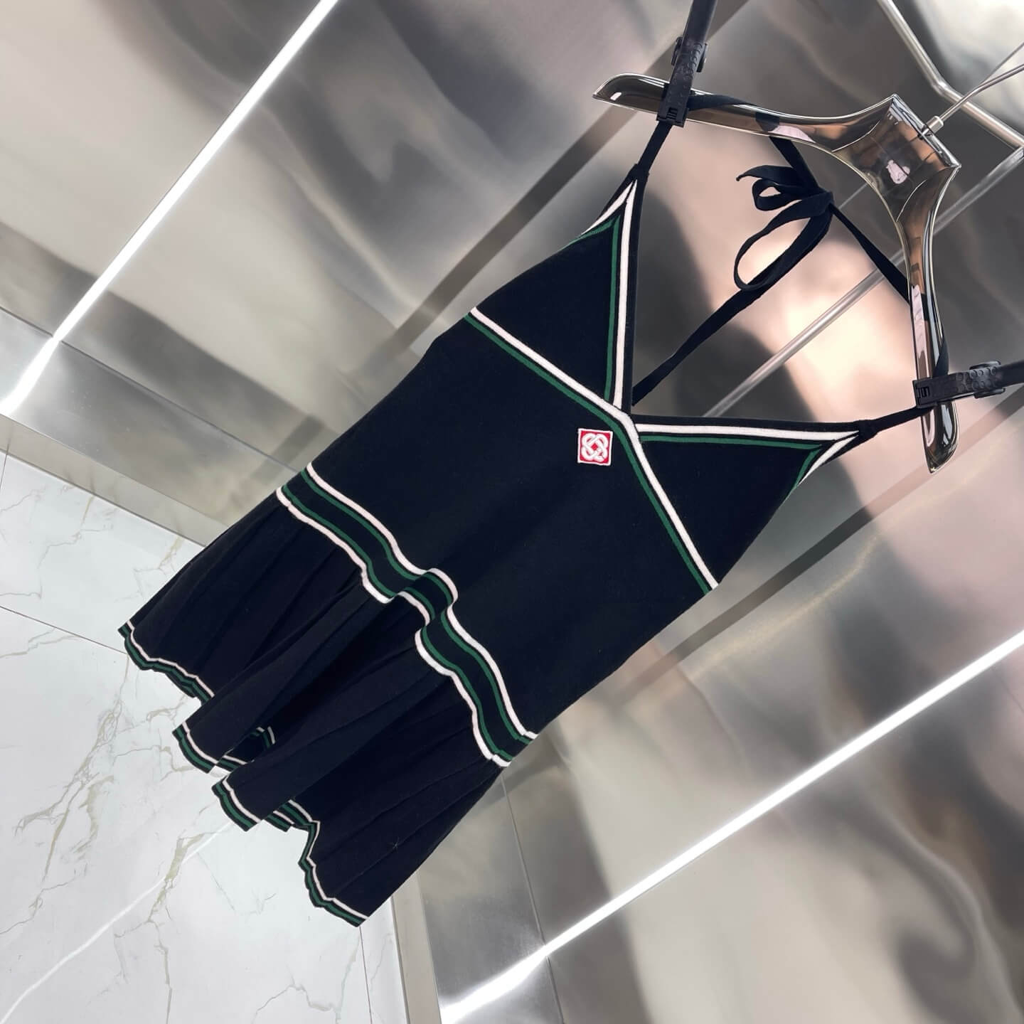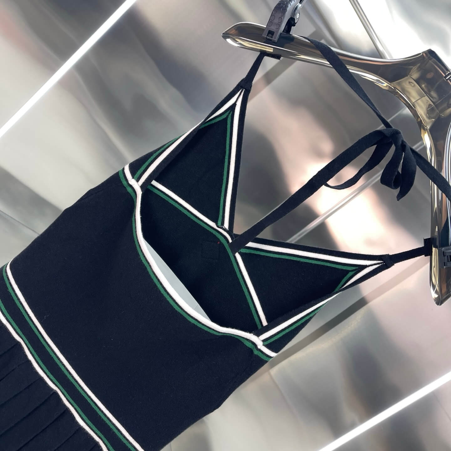 Embrace the chic allure of the French Riviera with this stunning black knit day dress. Featuring delicate white and green trim, a flattering pleated skirt, and an elegant halter neckline, it’s perfect for sophisticated daytime style.