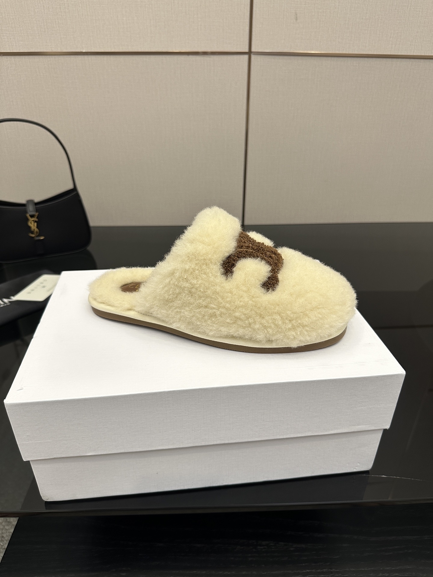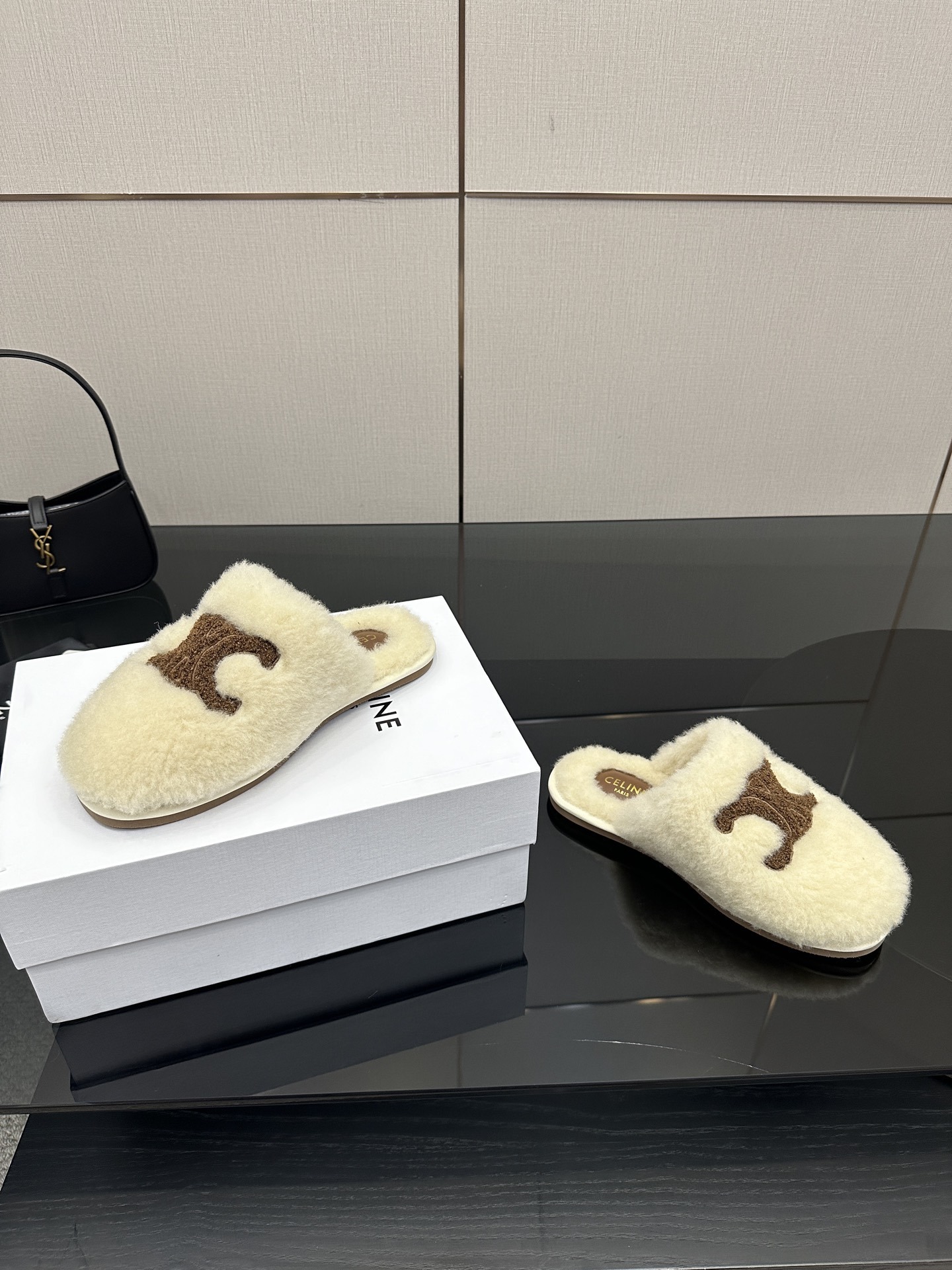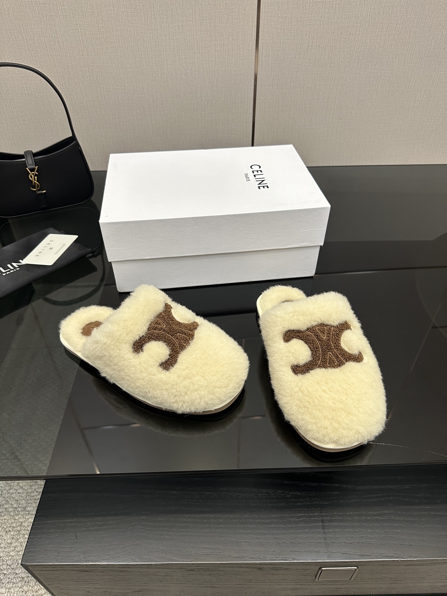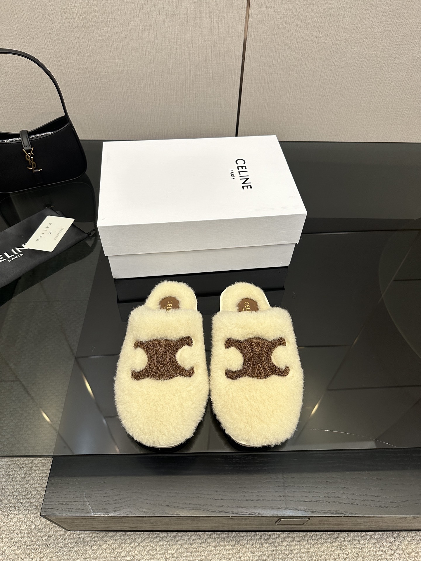 The Celine Beige Triomphe Furry Slides are a luxurious fusion of comfort and iconic Parisian style.