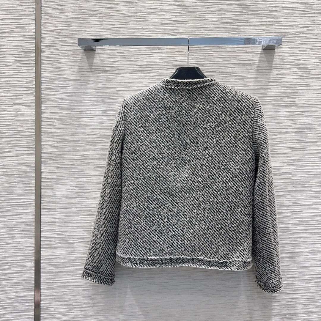 Lustrous Gold-Tone Hardware: Adorned with polished metal buttons along the front placket, providing a warm, jewelry-like contrast to the cool grey tweed.