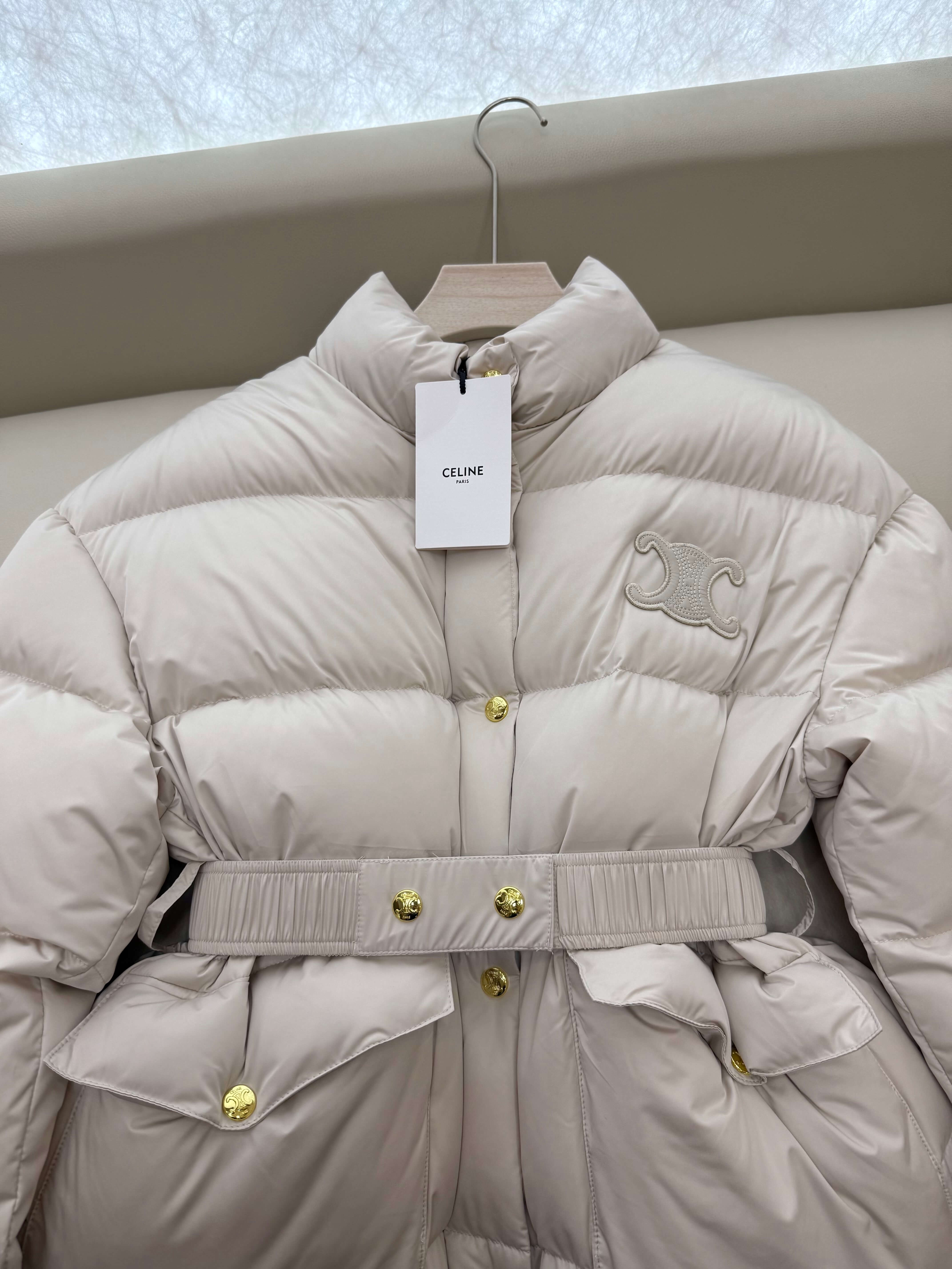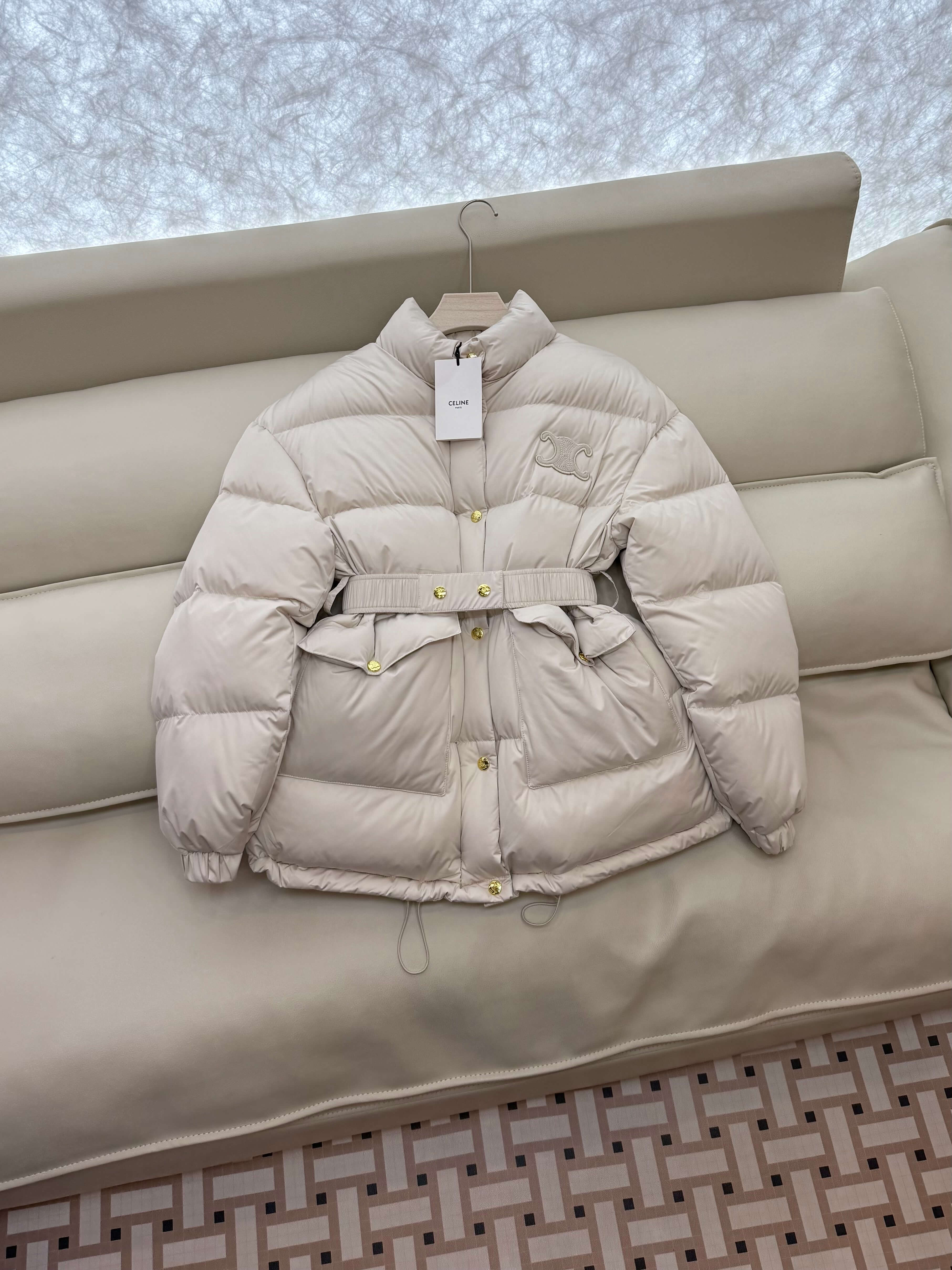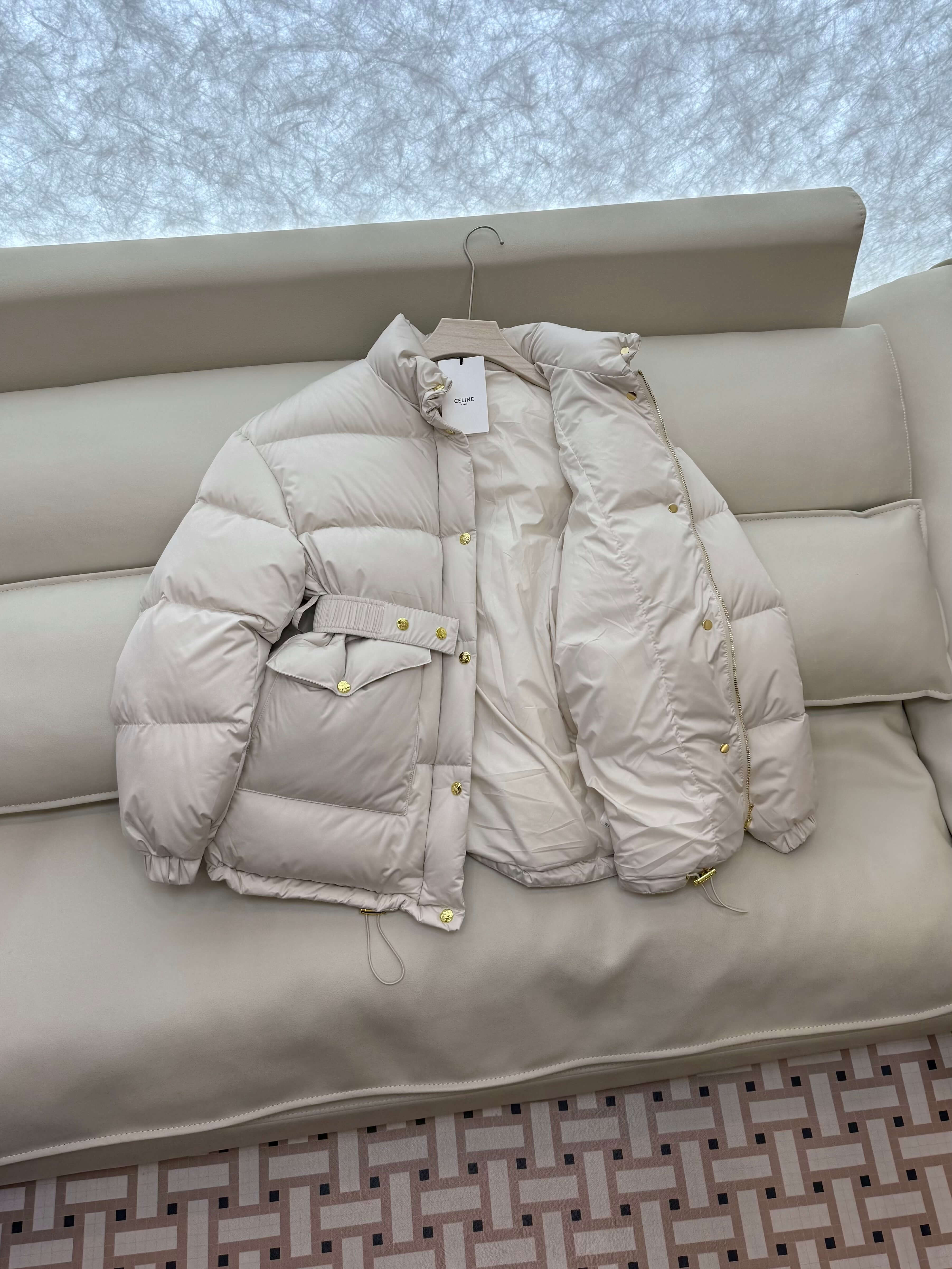 Step into the winter season with the sophisticated and chic Celine Puffer Jacket. This isn’t just a jacket; it’s a piece of art that seamlessly blends high fashion with practical warmth. The light beige color is soft and elegant, a refreshing choice that brightens up gloomy winter days. The jacket’s plush, padded material, filled with luxurious down, creates a feeling of being wrapped in a cozy cloud, providing unparalleled comfort and warmth. The design is a masterclass in modern femininity, using a defining belt to create a beautiful and structured silhouette.