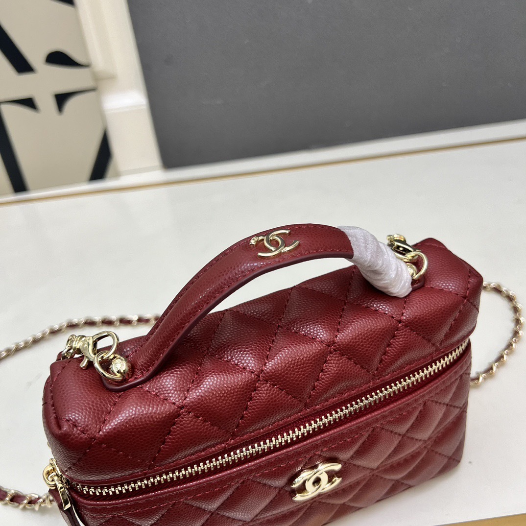 The Chanel Burgundy Caviar Quilted Small Vanity Case with Gold-Tone Hardware is a chic and modern handbag that combines the elegance of Chanel’s iconic quilting with the practical structure of a vanity-style bag. Crafted from premium imported caviar cowhide leather, the bag features the signature diamond quilted pattern, offering durability and a luxurious textured finish.