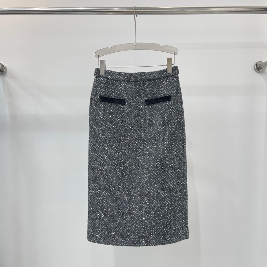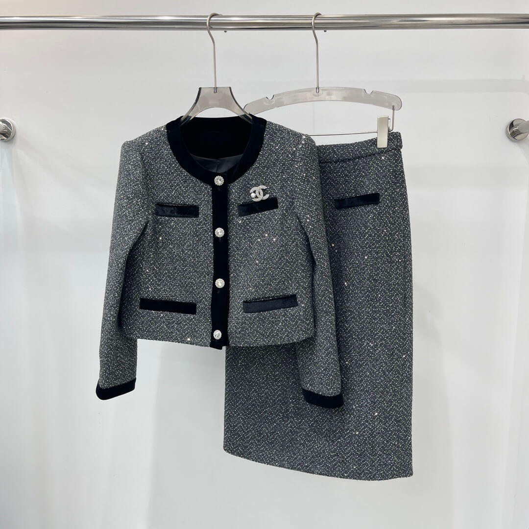 The Chanel Tweed Jacket and Skirt Set in Grey/Black embodies the timeless elegance the maison is known for. Designed for women who appreciate refined simplicity, this coordinated set provides an effortlessly polished appearance suitable for workdays, social luncheons, cultural outings, or elevated daily wear. Its harmonious silhouette removes the guesswork from styling, while its craftsmanship and thoughtful detailing create an enduring, luxury-forward impression in any setting.