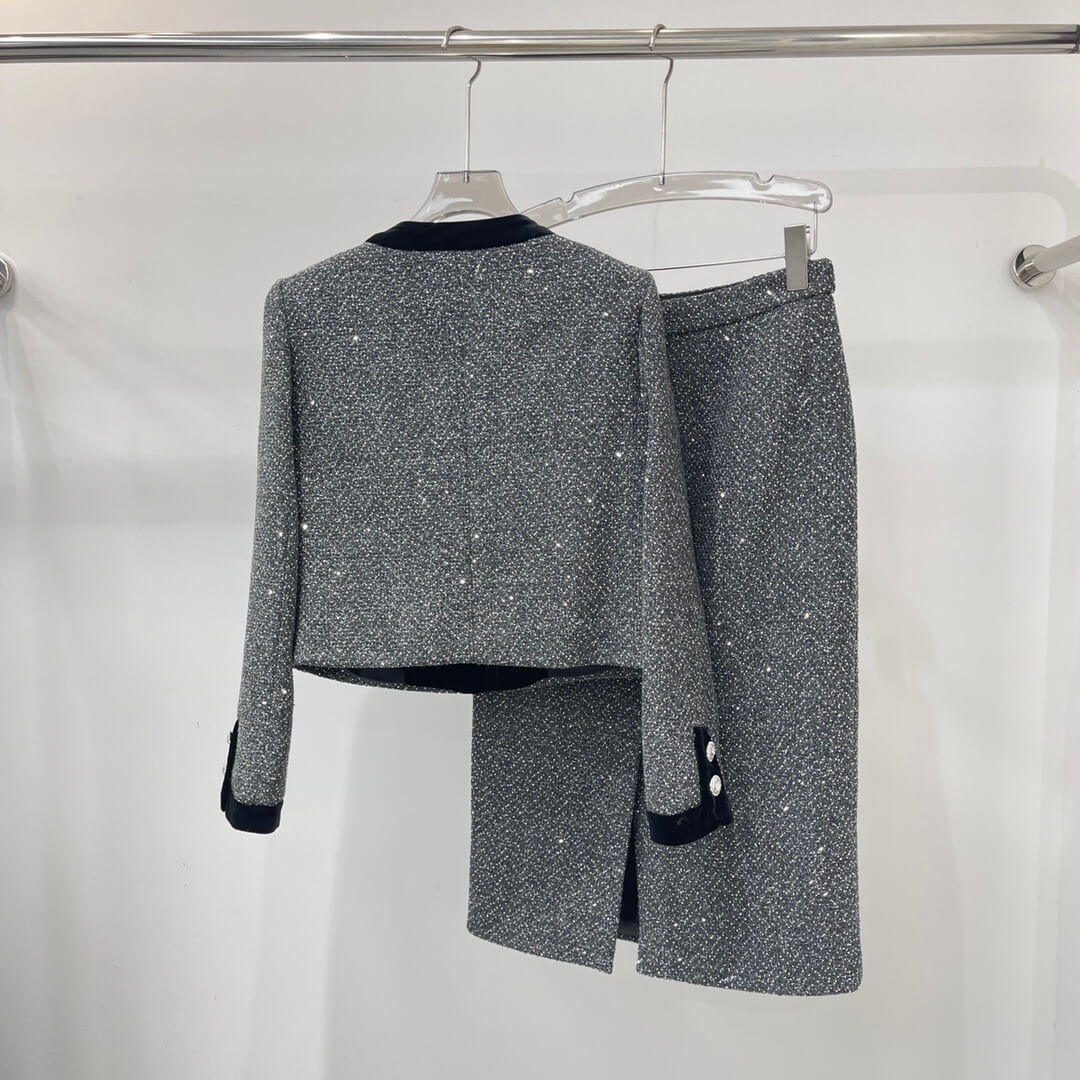 Polished Two-Piece Coordination — The matching jacket and skirt create a cohesive, ready-made outfit that simplifies luxury dressing.
