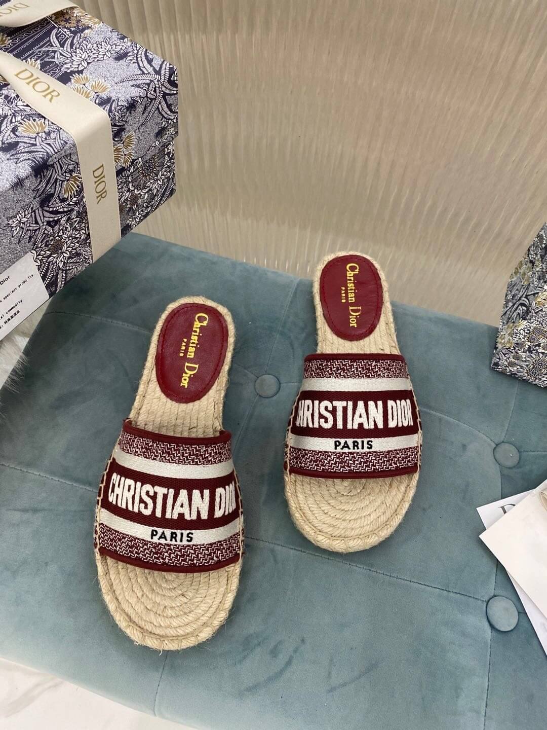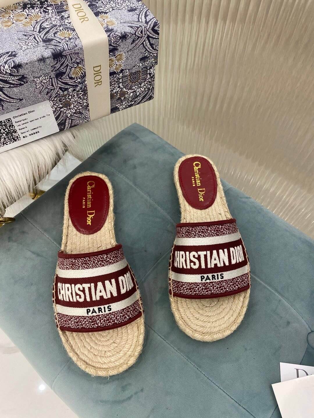 Crafted for both style and comfort, these flat slide sandals feature a rich red canvas strap, subtly adorned with the “CHRISTIAN DIOR PARIS” logo embroidered in a matching hue. The sandals are set on a classic braided jute espadrille sole, offering a rustic yet refined touch. Perfect for sunny days, they effortlessly complement any casual or summer ensemble, making them a versatile and timeless addition to your wardrobe.