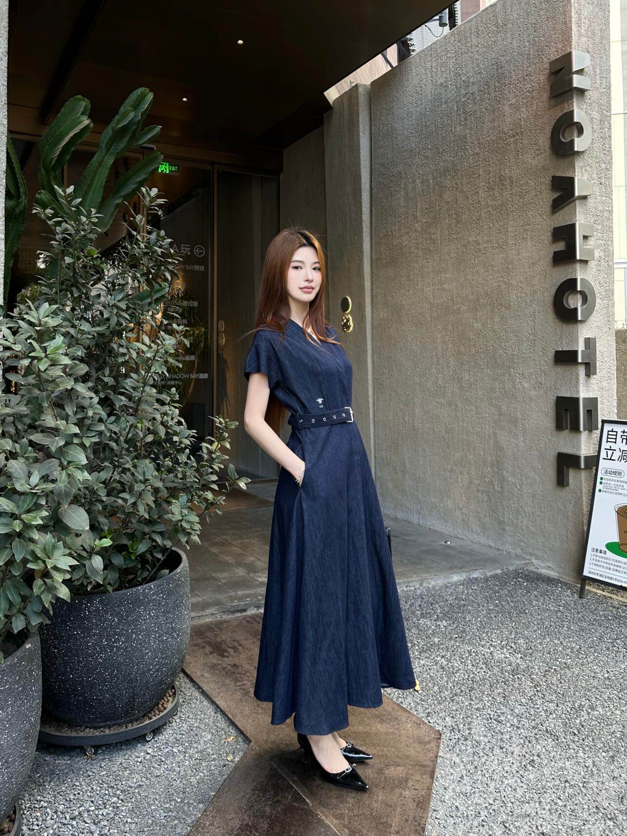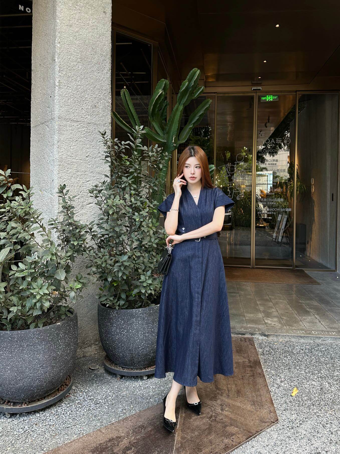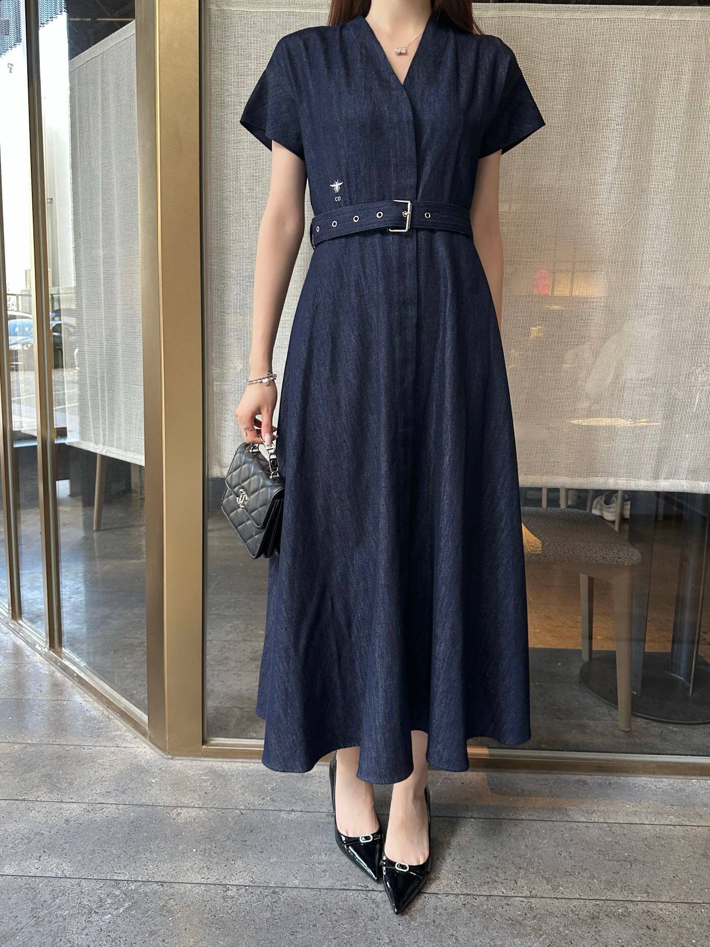 This sophisticated midi dress is crafted from rich indigo denim, offering a blend of casual comfort and refined style. It features a flattering V-neckline, short sleeves, and a matching denim belt with a sleek buckle to define the waist, creating a polished A-line silhouette.