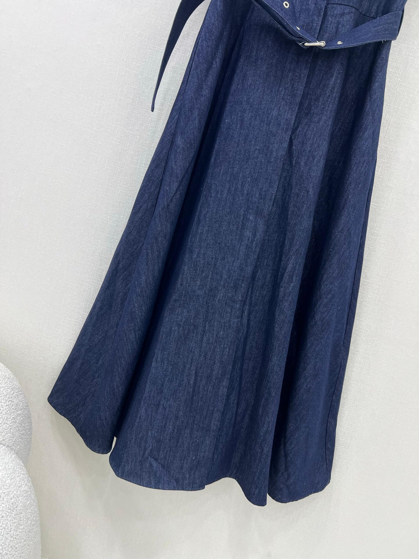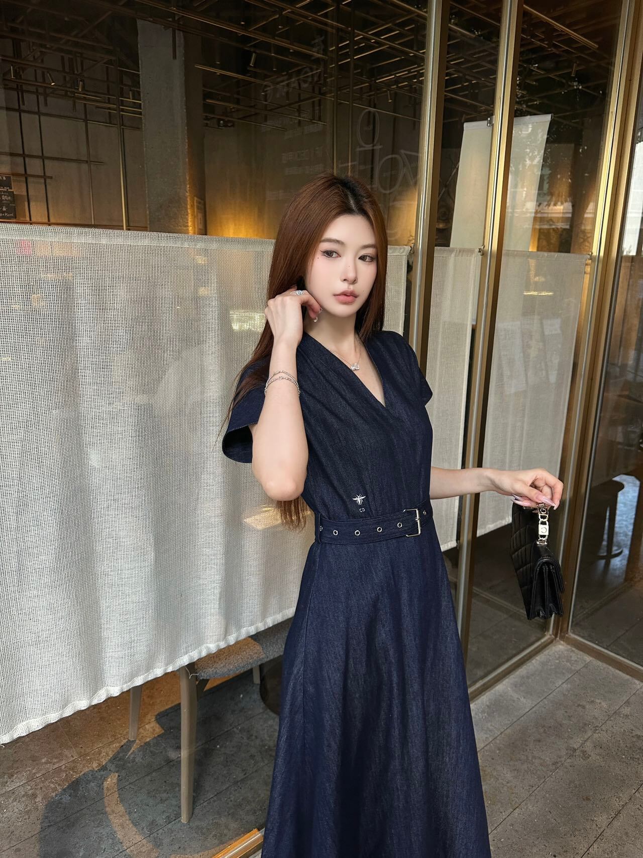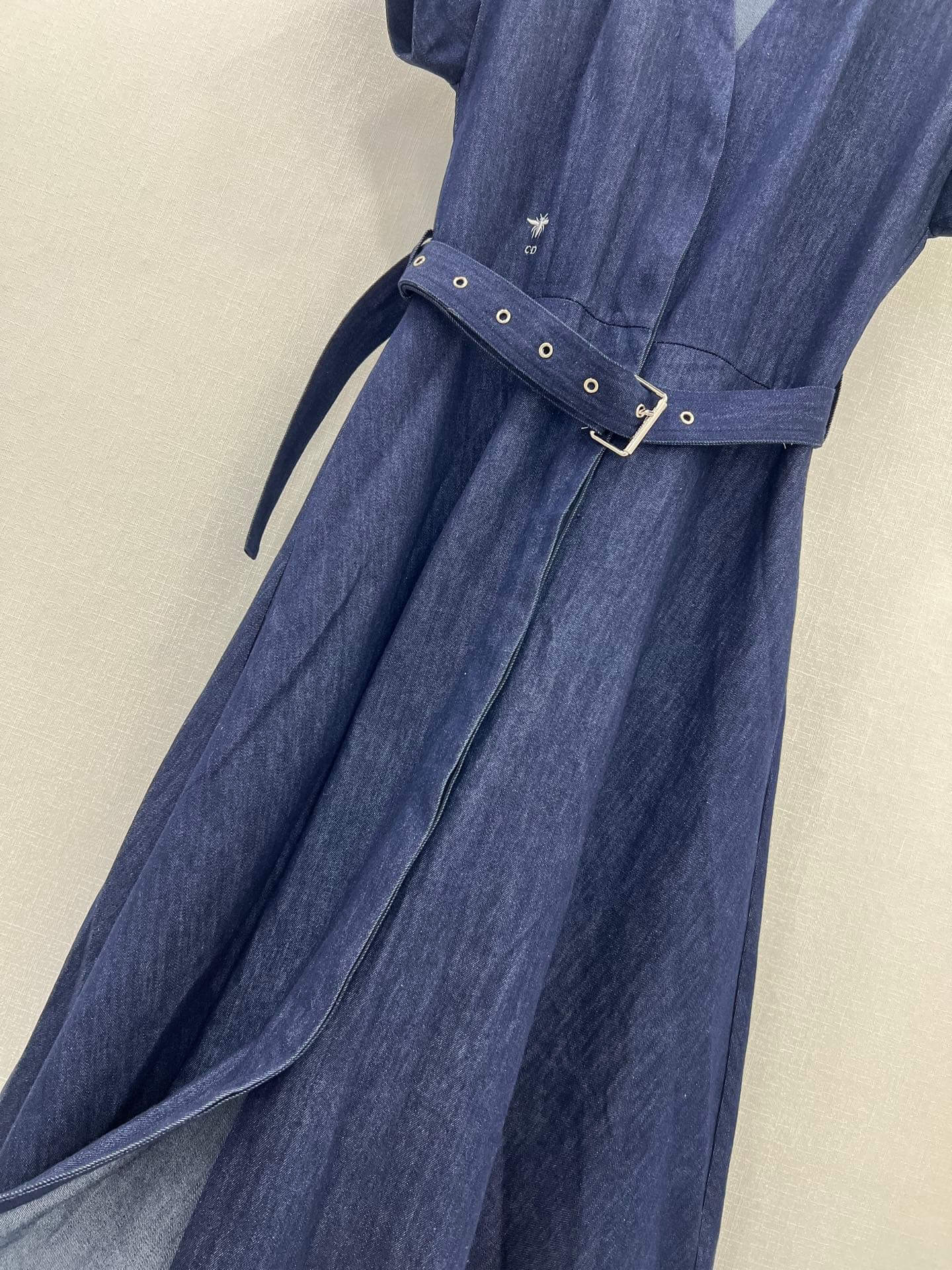 This sophisticated midi dress is crafted from rich indigo denim, offering a blend of casual comfort and refined style. It features a flattering V-neckline, short sleeves, and a matching denim belt with a sleek buckle to define the waist, creating a polished A-line silhouette.