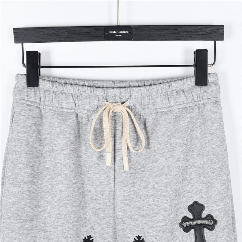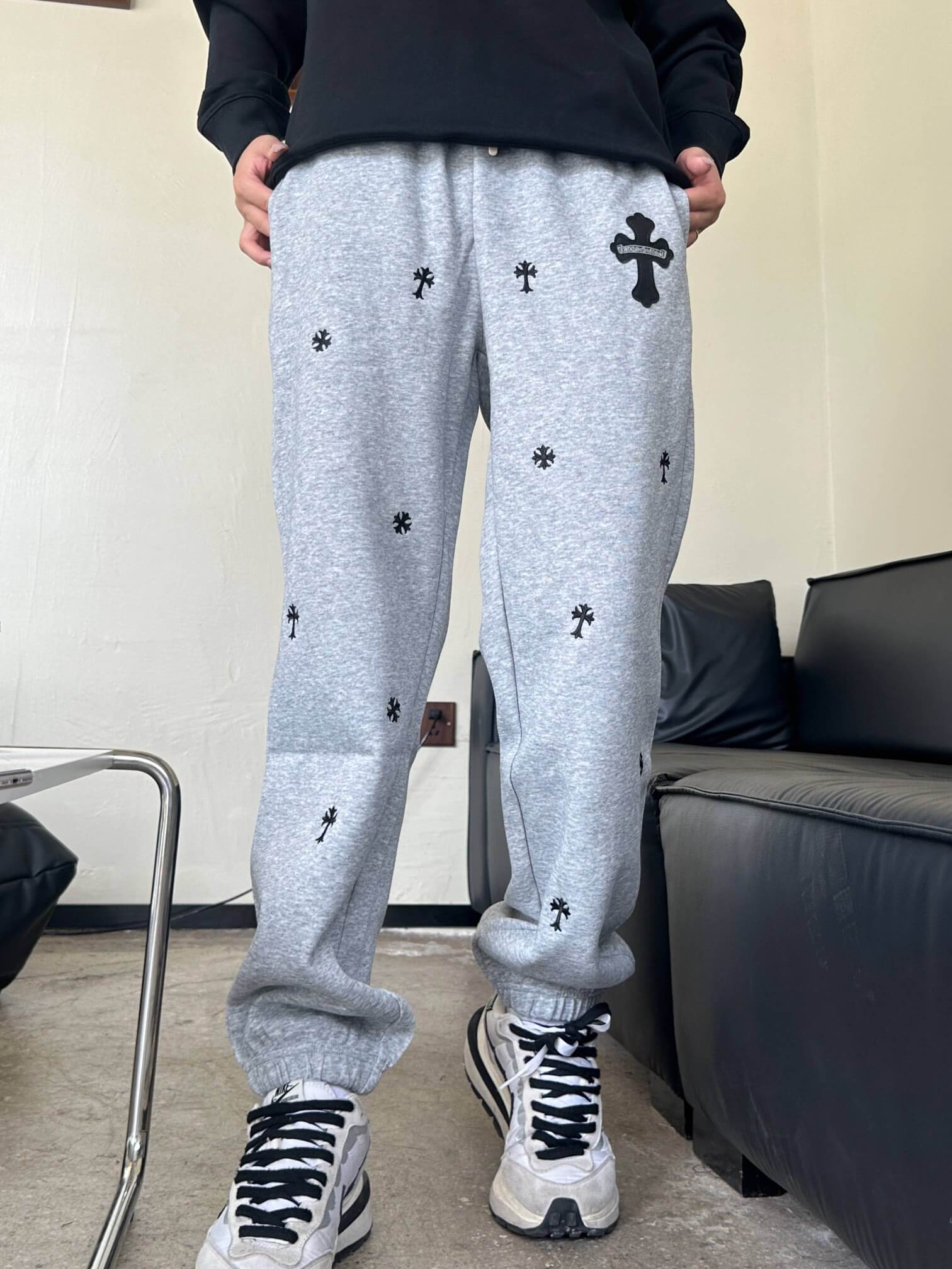 Elevate your streetwear with these grey cotton sweatpants, featuring an all-over embroidered cross motif and a distinctive pressed leather cross detail on the upper thigh. Crafted from a soft, high-quality composite fabric with excellent drape, these pants offer both comfort and a bold, personalized style.