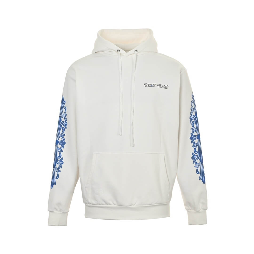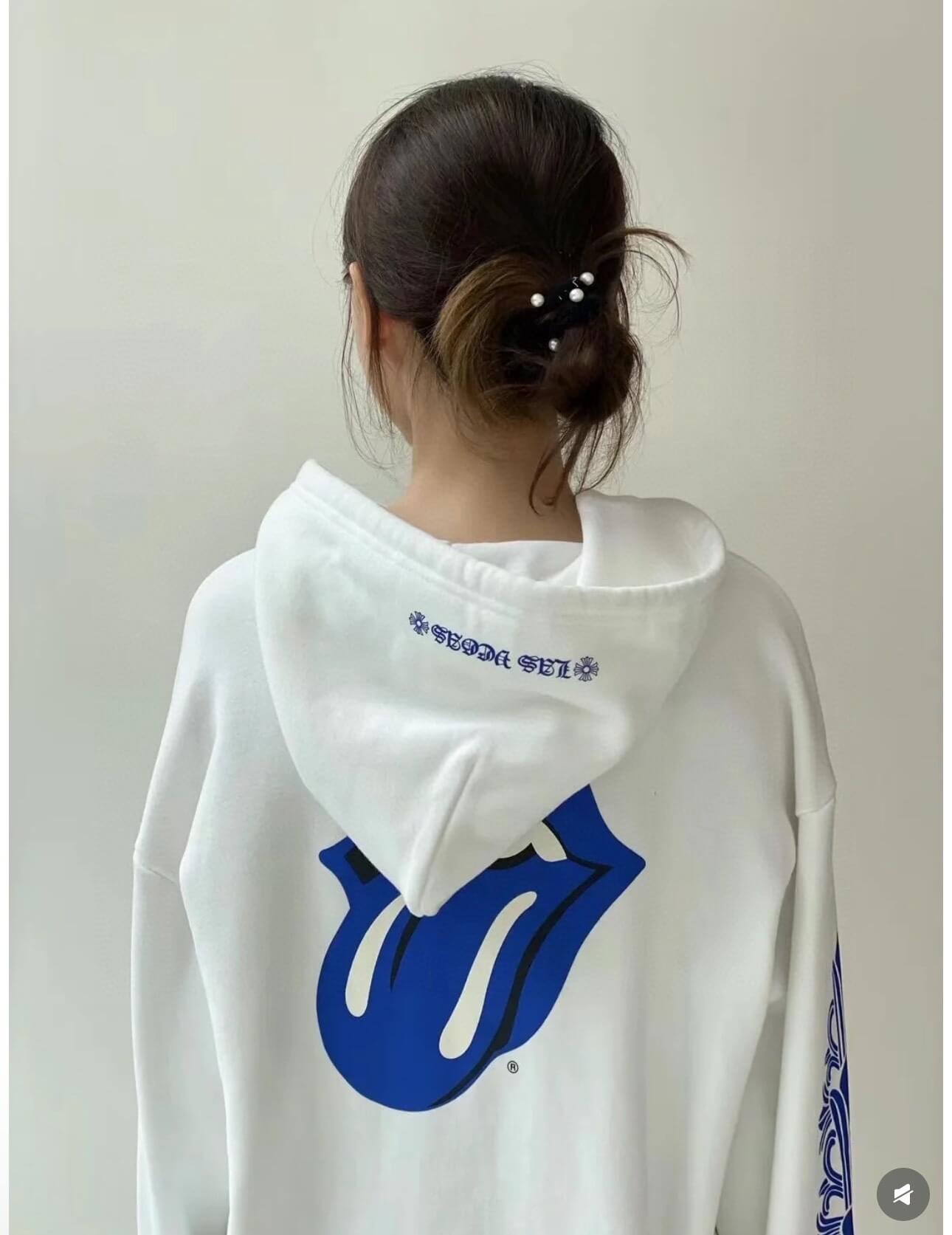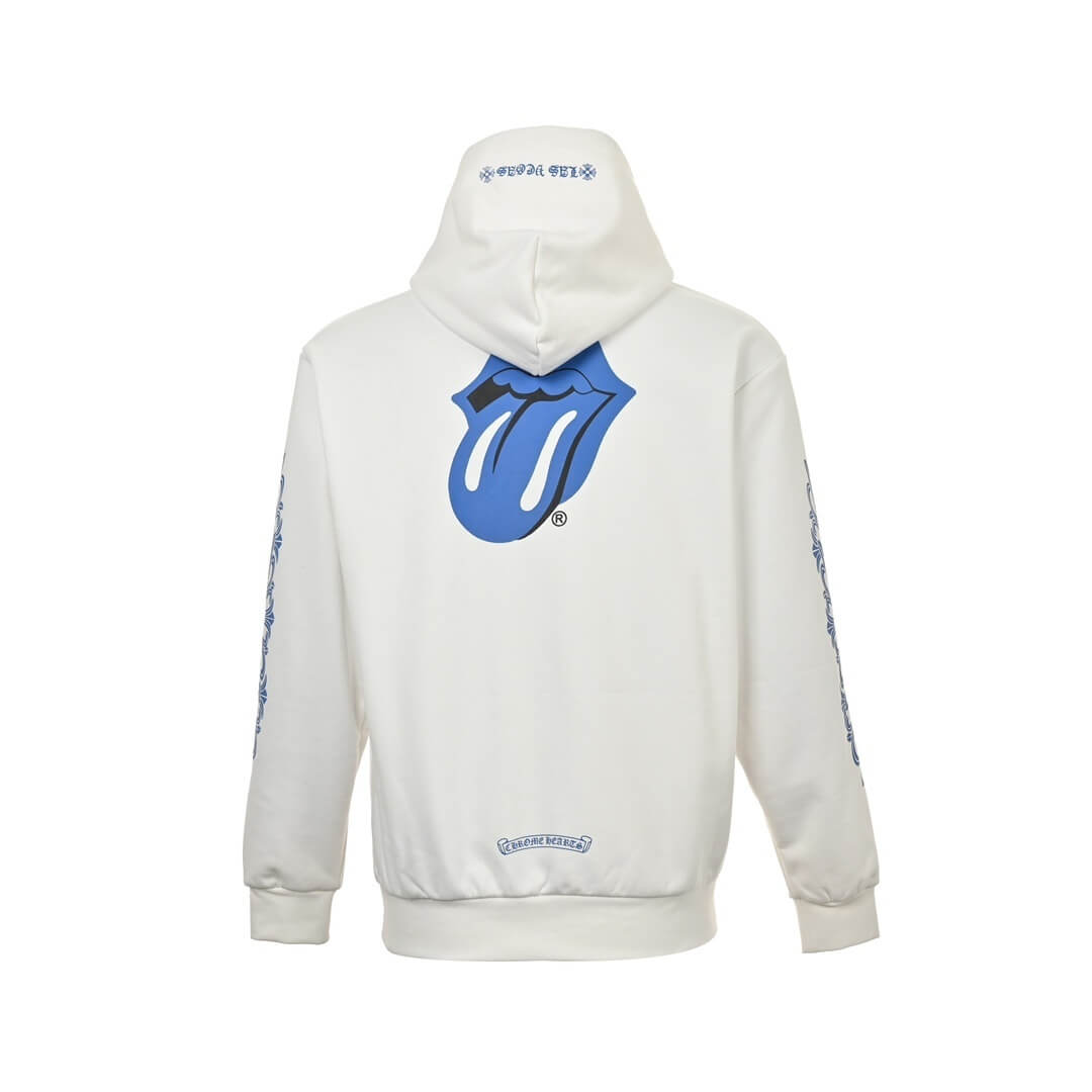 The Chrome Hearts Rolling Stones Lick Blue Hoodie (White) is a statement piece that merges two cultural icons into one bold design. Crafted from 430g washed cotton terry fabric, the hoodie delivers a substantial, premium feel with excellent durability and comfort for everyday wear.