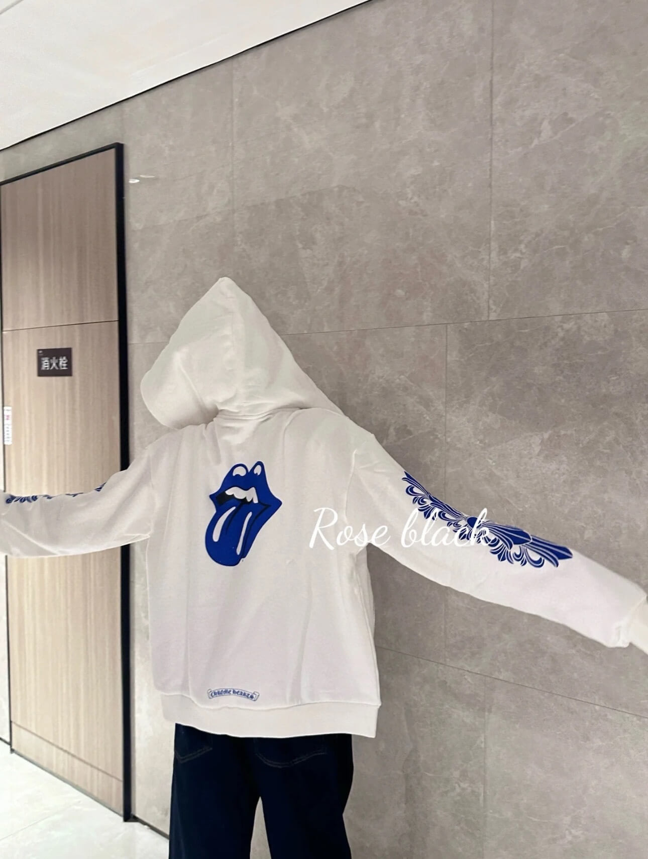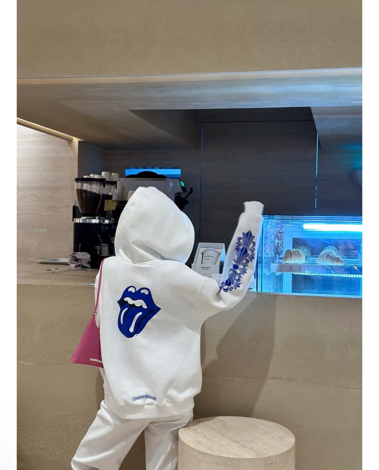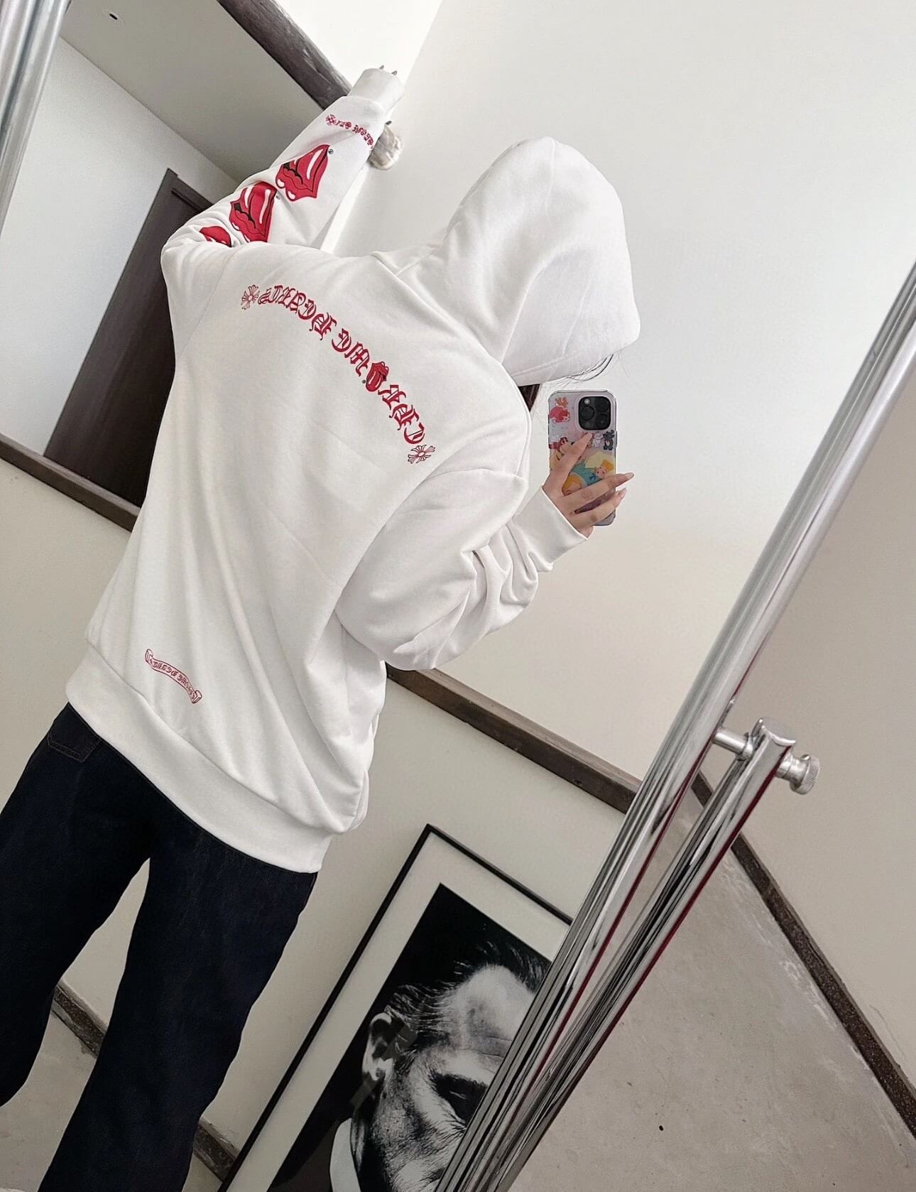 The Chrome Hearts Rolling Stones Lick Blue Hoodie (White) is a statement piece that merges two cultural icons into one bold design. Crafted from 430g washed cotton terry fabric, the hoodie delivers a substantial, premium feel with excellent durability and comfort for everyday wear.
