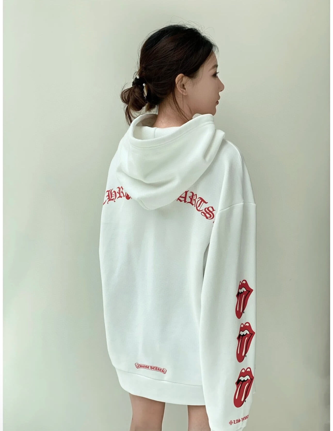 The clean white base allows every detail to stand out clearly. Signature elements include the oversized blue tongue graphic, scroll-style lettering accents, and carefully placed branding throughout. The hood features metal-reinforced drawstring eyelets, adding a refined, textured finish. Red tongue motifs are integrated into the chest logo, sleeve graphics, and back lettering, while Las Vegas lettering near the cuffs enhances the streetwear narrative.