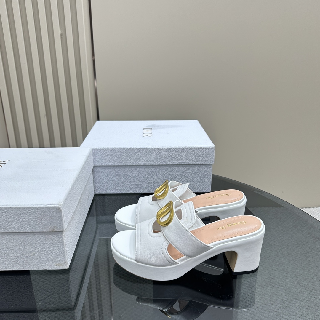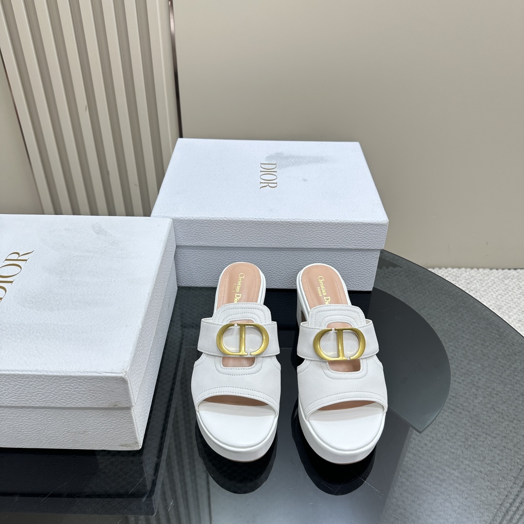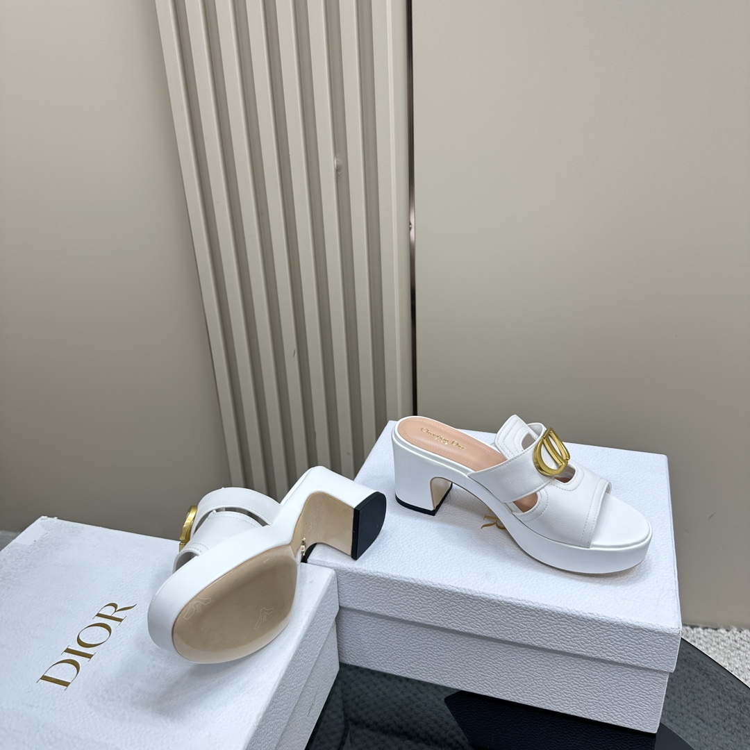The Dior 30 Montaigne Heeled Slide in white calfskin offers a crisp, polished look with elevated sophistication. Its smooth leather upper features the iconic gold-tone “CD” signature detail, set atop a wide, sculpted strap. A block heel and platform sole bring comfortable height, while the open-toe slide design ensures easy, refined wear.