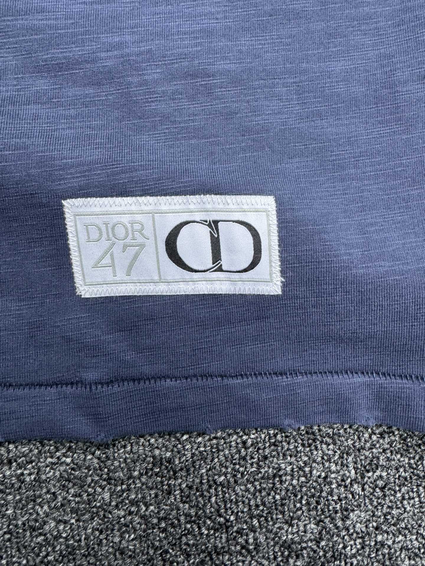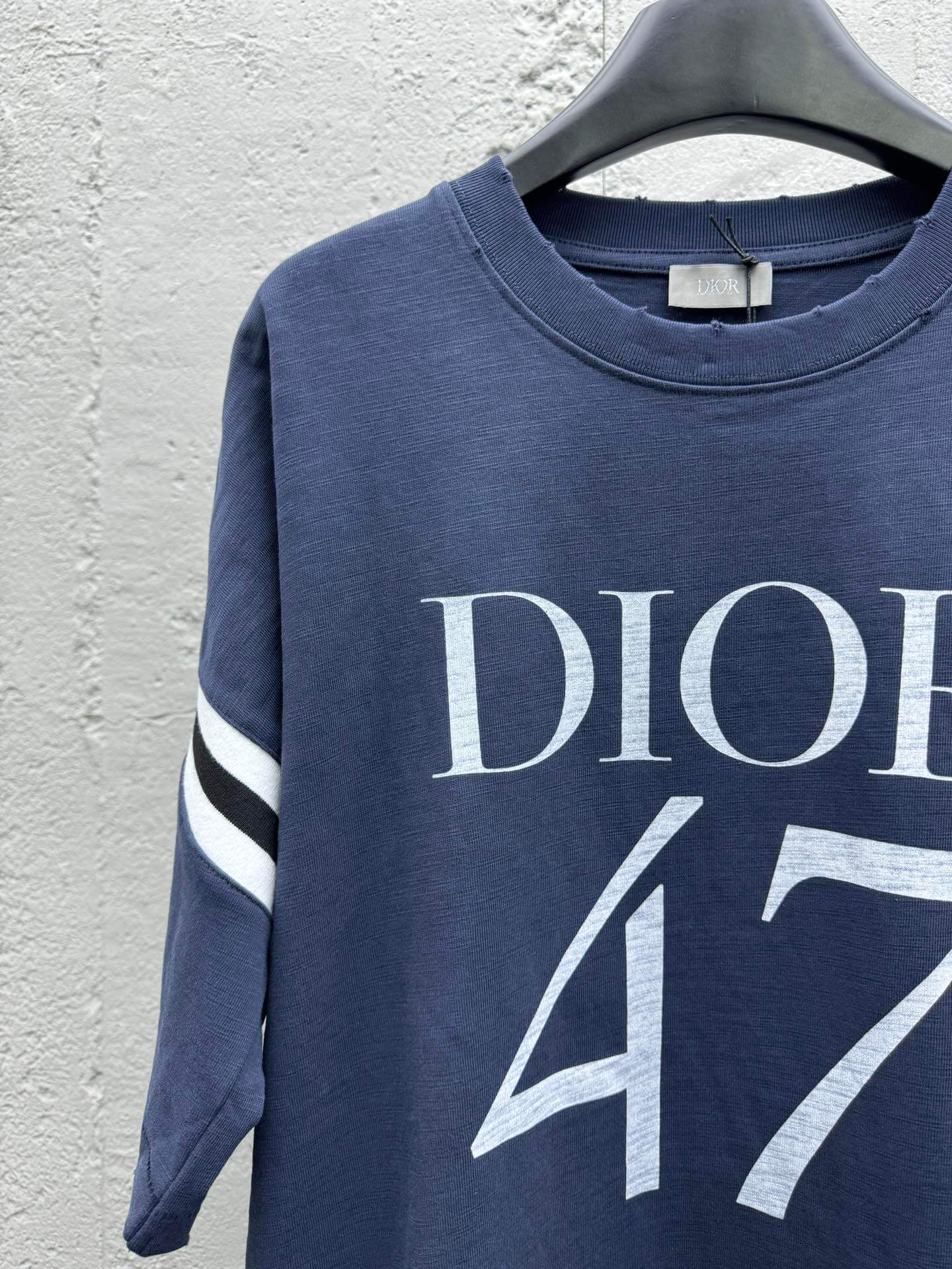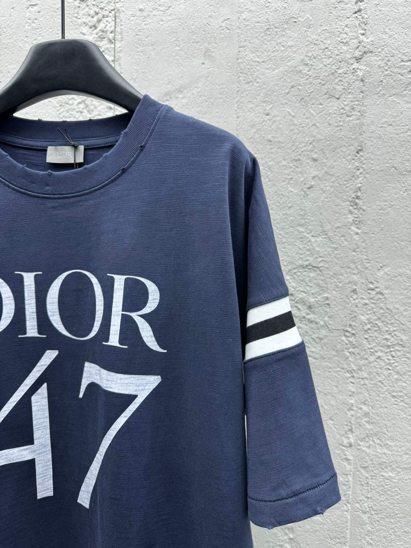 Heritage Branding: Features the iconic “DIOR 47” graphic in a high-contrast, crisp white print, celebrating the brand’s historic roots in a modern, varsity-inspired font.