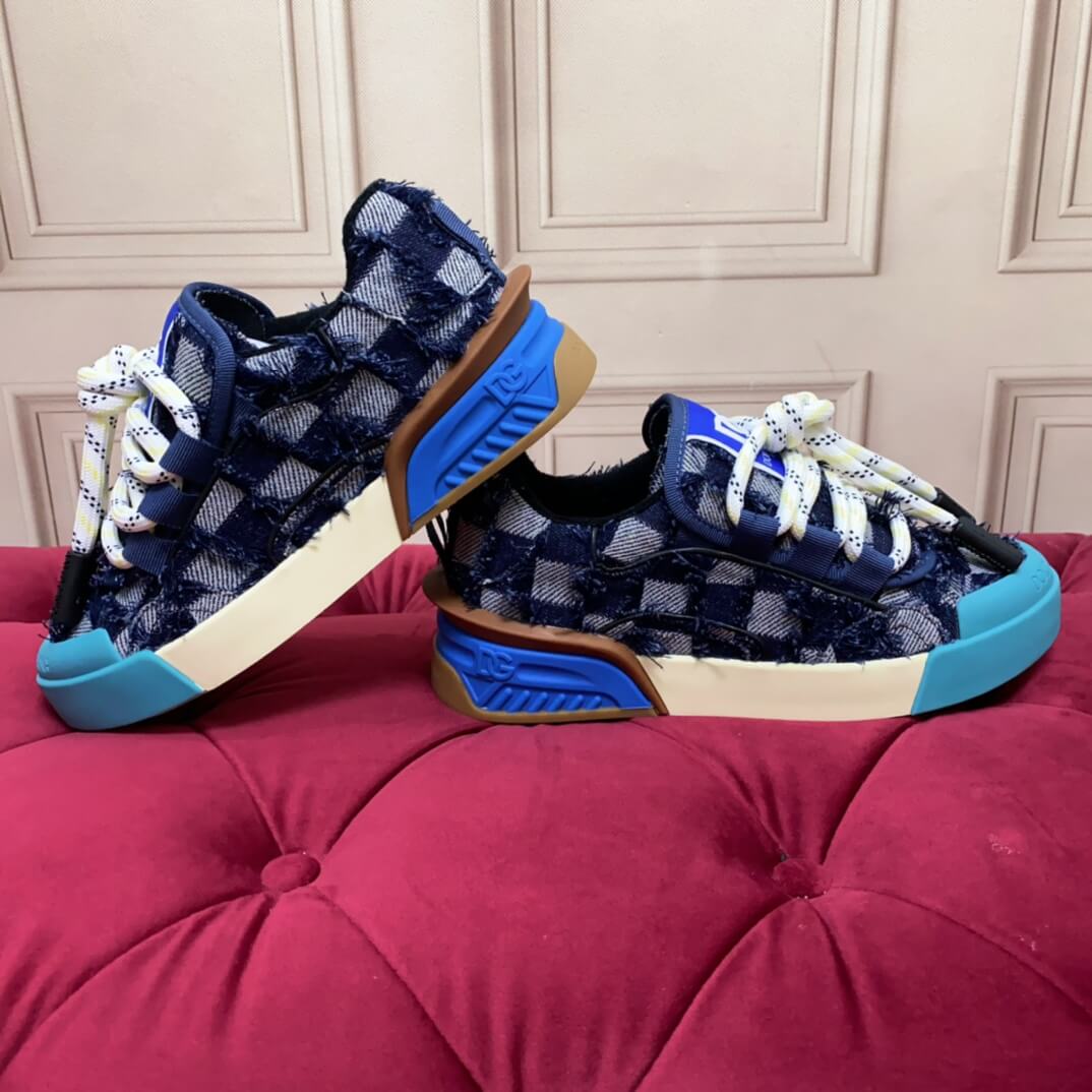 Step into vibrant craftsmanship with the Dior B25 Artisan Pop Sneakers — a bold fusion of classic textile and colorful modern flair. Showcasing a navy blue and white checkered tweed upper with raw, frayed edges, these sneakers are brought to life by thick cream and yellow rope laces and playful aqua toe caps. The midsole features a warm cream tone, contrasted by a caramel heel guard and vivid blue detailing, making this pair a standout choice for eclectic, fashion-forward dressers.