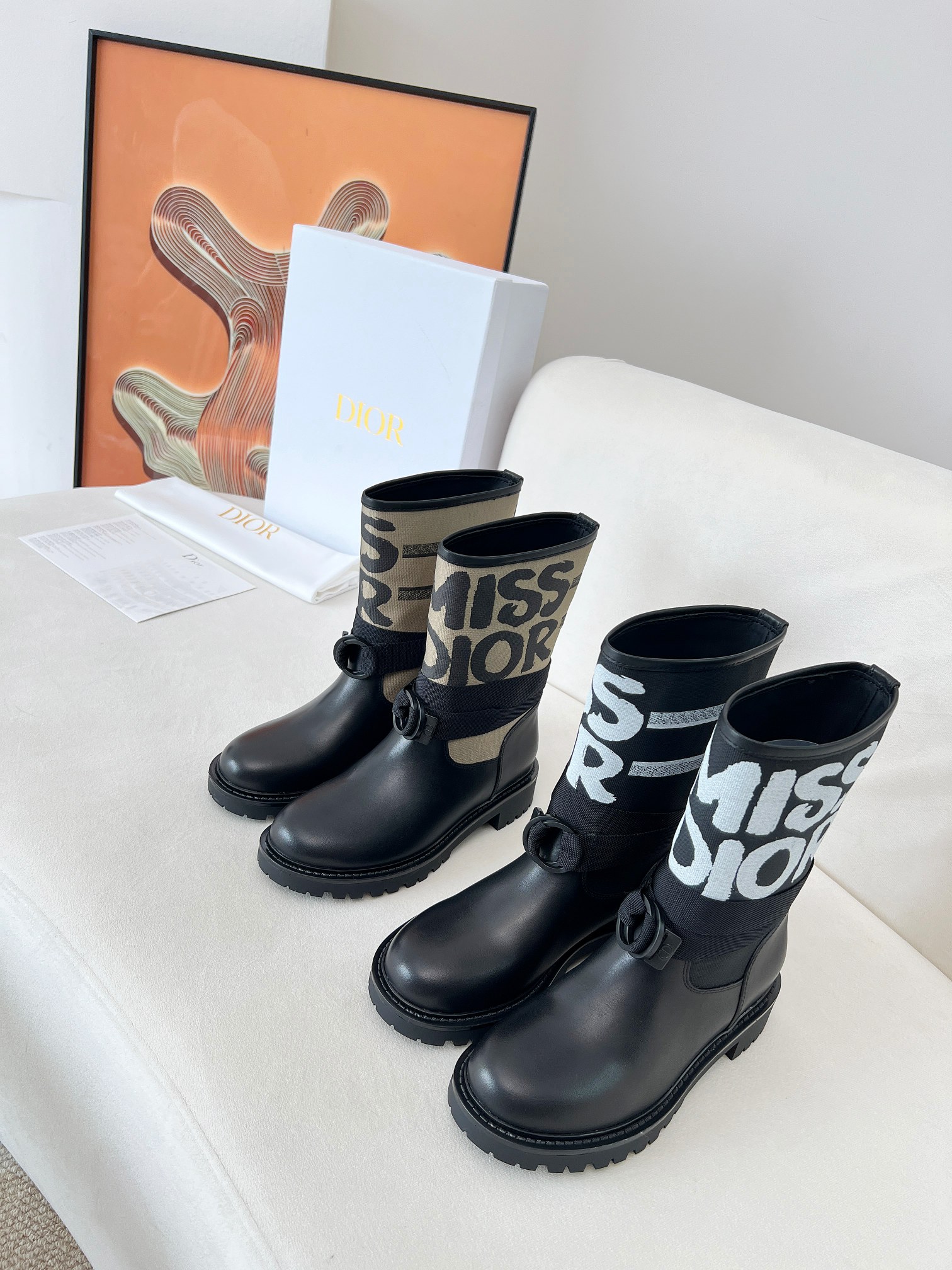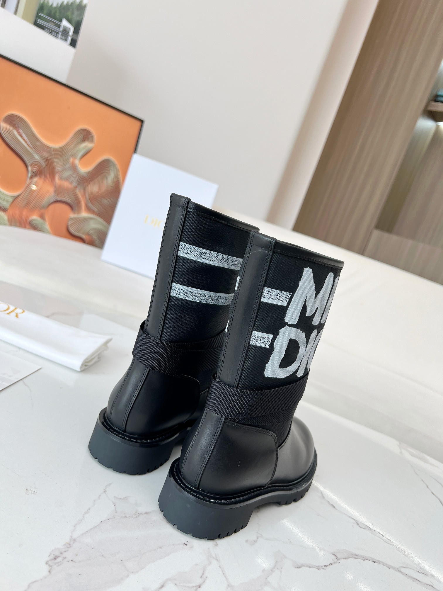 The Dior D-Major Ankle Boots offer a bold and contemporary twist with their sleek black leather base and striking canvas shaft. The upper is adorned with oversized Miss Dior lettering in a hand-painted style, creating a statement look that stands out. A sturdy lug sole provides excellent traction, making these boots both stylish and functional for everyday wear.