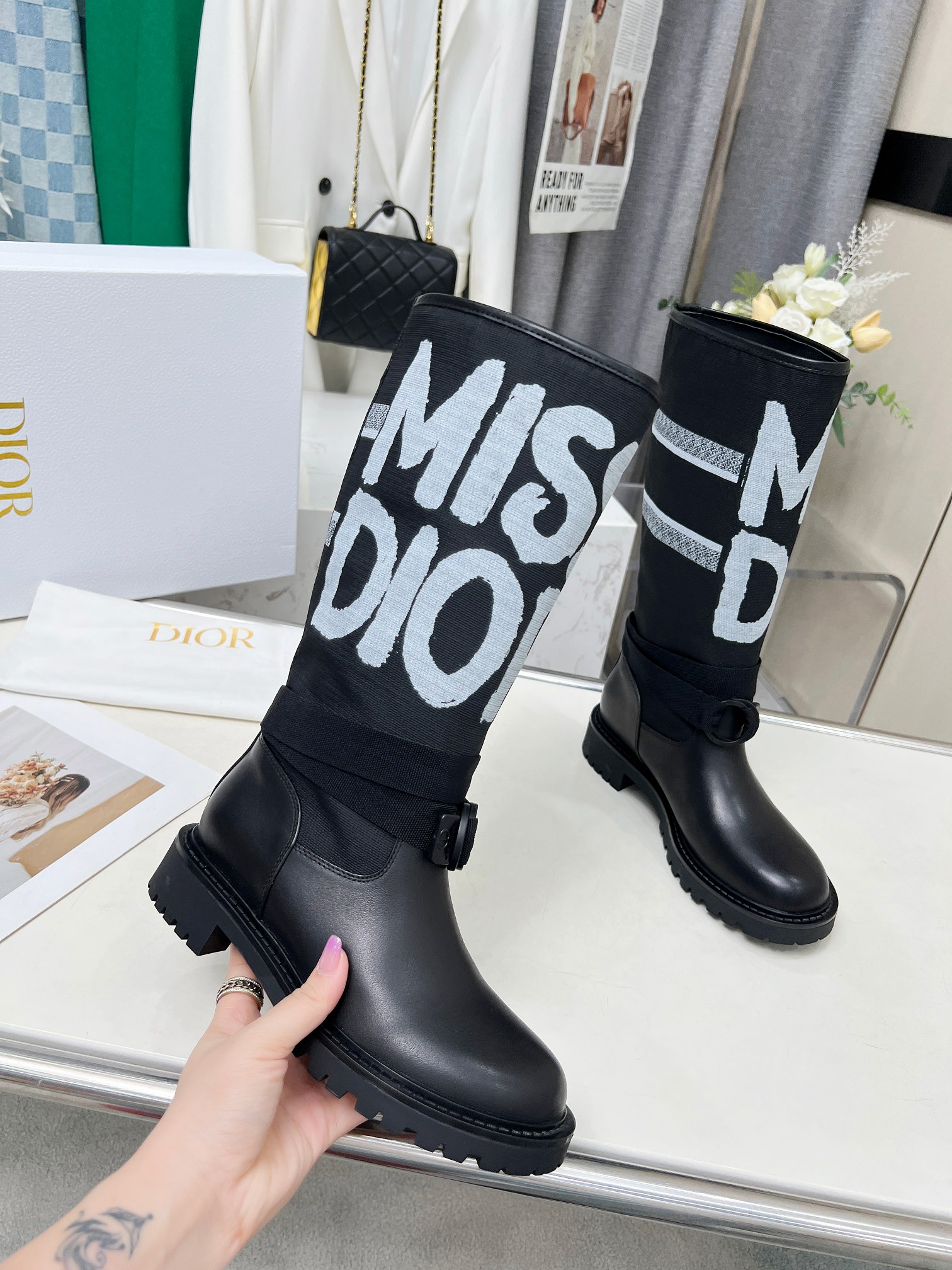 The Dior D-Major Boots make a bold fashion statement with their striking mix of smooth black leather and graphic-printed canvas. The tall shaft features an oversized Miss Dior lettering in a brushstroke design, creating an artistic and modern appeal. A durable lug sole ensures stability and comfort, making these boots ideal for both city streets and adventurous outings.