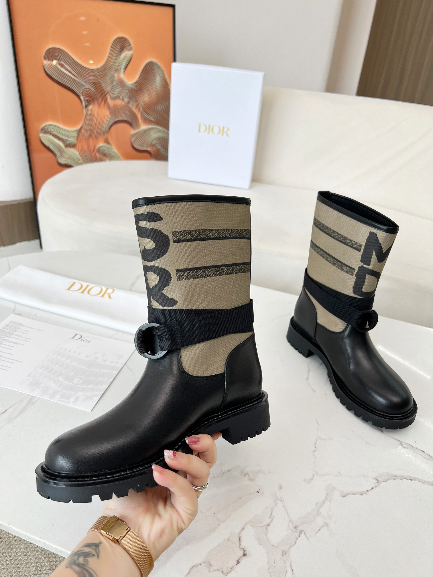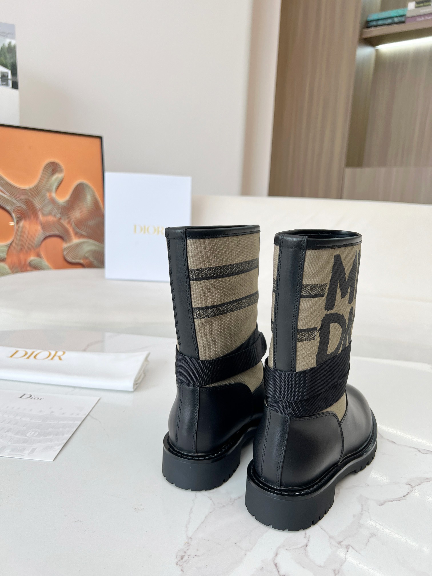 The Dior D-Major Ankle Boots deliver a striking blend of rugged charm and modern style. The smooth black leather base offers durability and structure, while the taupe canvas shaft is decorated with bold Miss Dior lettering for a statement-making look. A sturdy lug sole ensures excellent traction and all-day comfort, making these boots both stylish and practical.