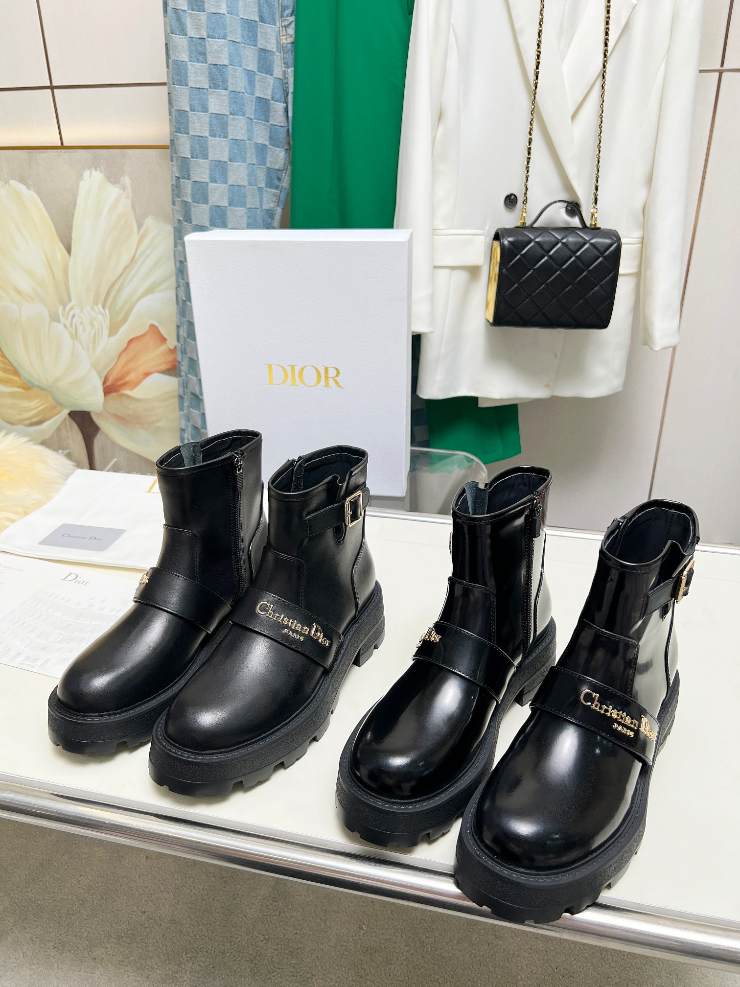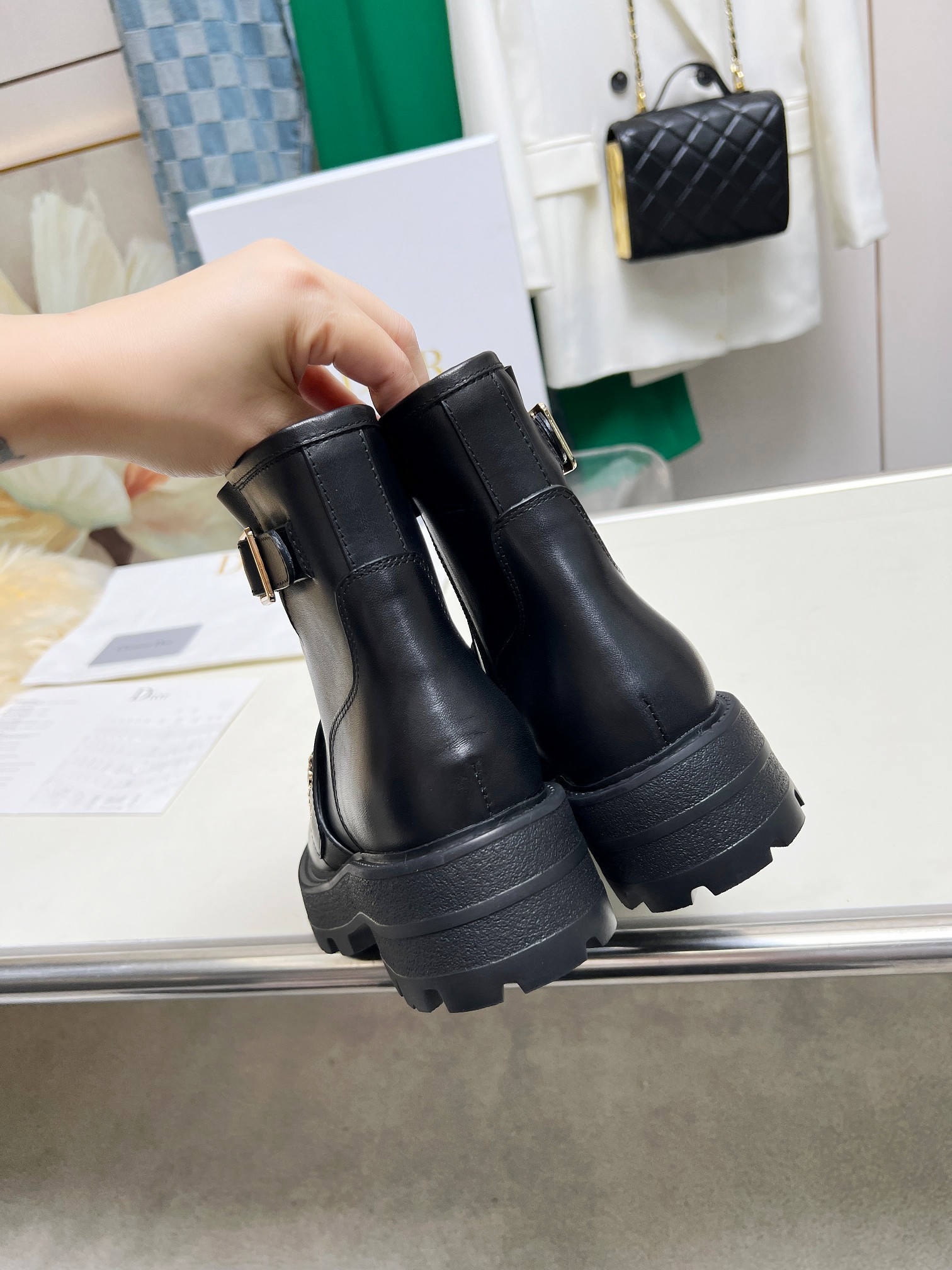 The Dior D-Quest Ankle Boots combine a bold aesthetic with functional design, crafted from smooth black leather for a sleek and polished look. The signature Christian Dior Paris logo strap across the front adds an iconic branding detail that enhances the boot’s refined appeal. A rugged lug sole provides excellent grip and durability, making these boots perfect for both style and practicality.