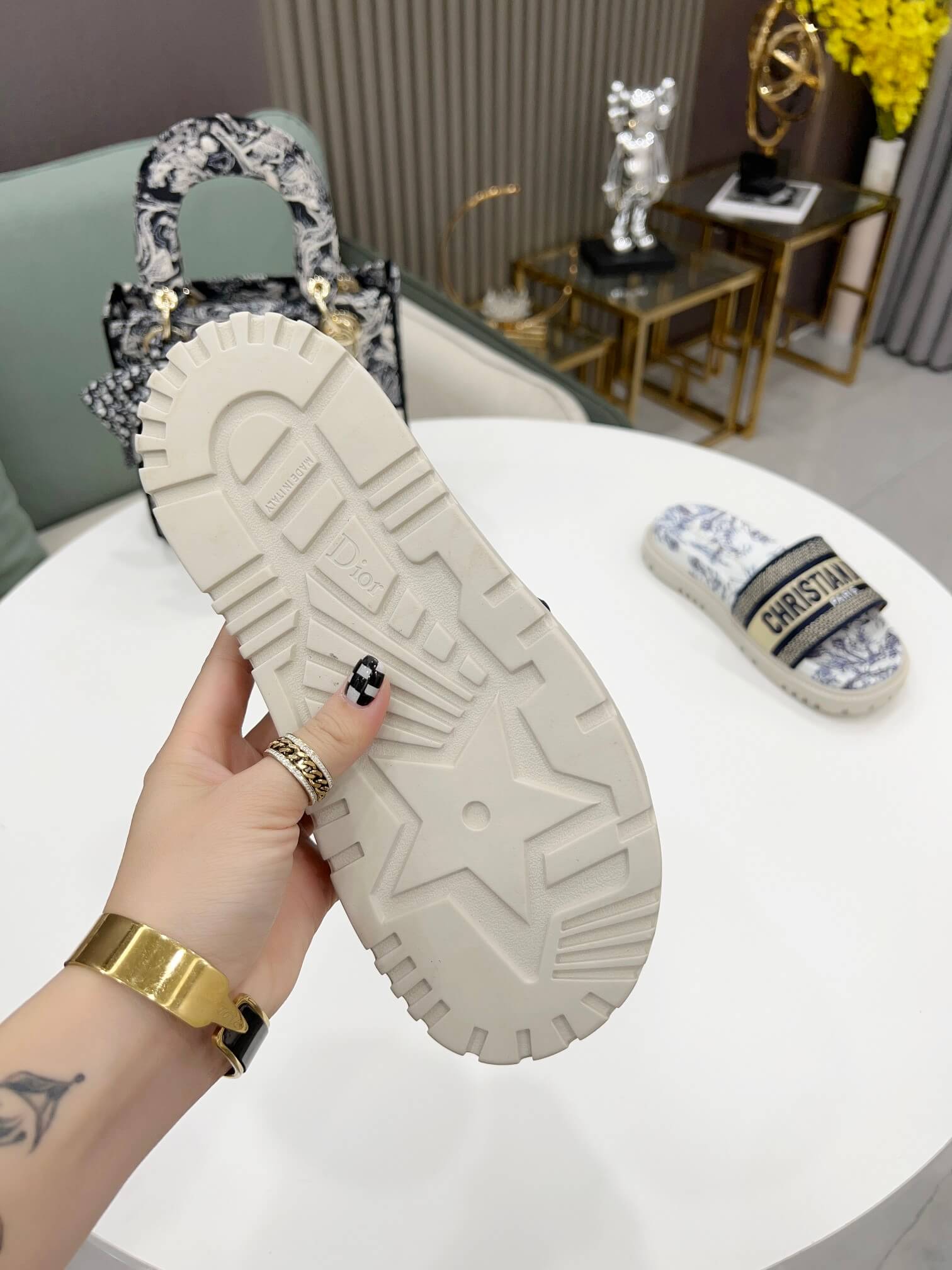 Step into timeless elegance with the Dior D-Way Platform Slides in Navy Blue and White Toile de Jouy. Featuring a beautifully illustrated insole with intricate toile patterns, these slides are topped with a bold navy “Christian Dior” embroidered strap for a refined yet modern aesthetic. The lightweight platform sole delivers effortless comfort and subtle height, making them perfect for resort getaways, relaxed summer days, or adding a touch of sophistication to casual outfits.