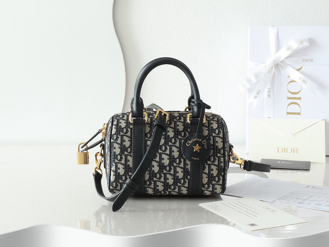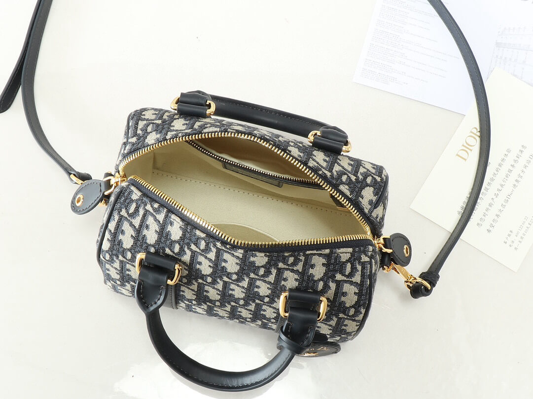 The Dior Mini Boston Bag in Oblique Canvas is a refined blend of classic elegance and modern luxury. Showcasing the signature Dior Oblique jacquard fabric in navy blue, this structured mini bag is enhanced with smooth leather trims and gold-tone hardware for a polished finish.