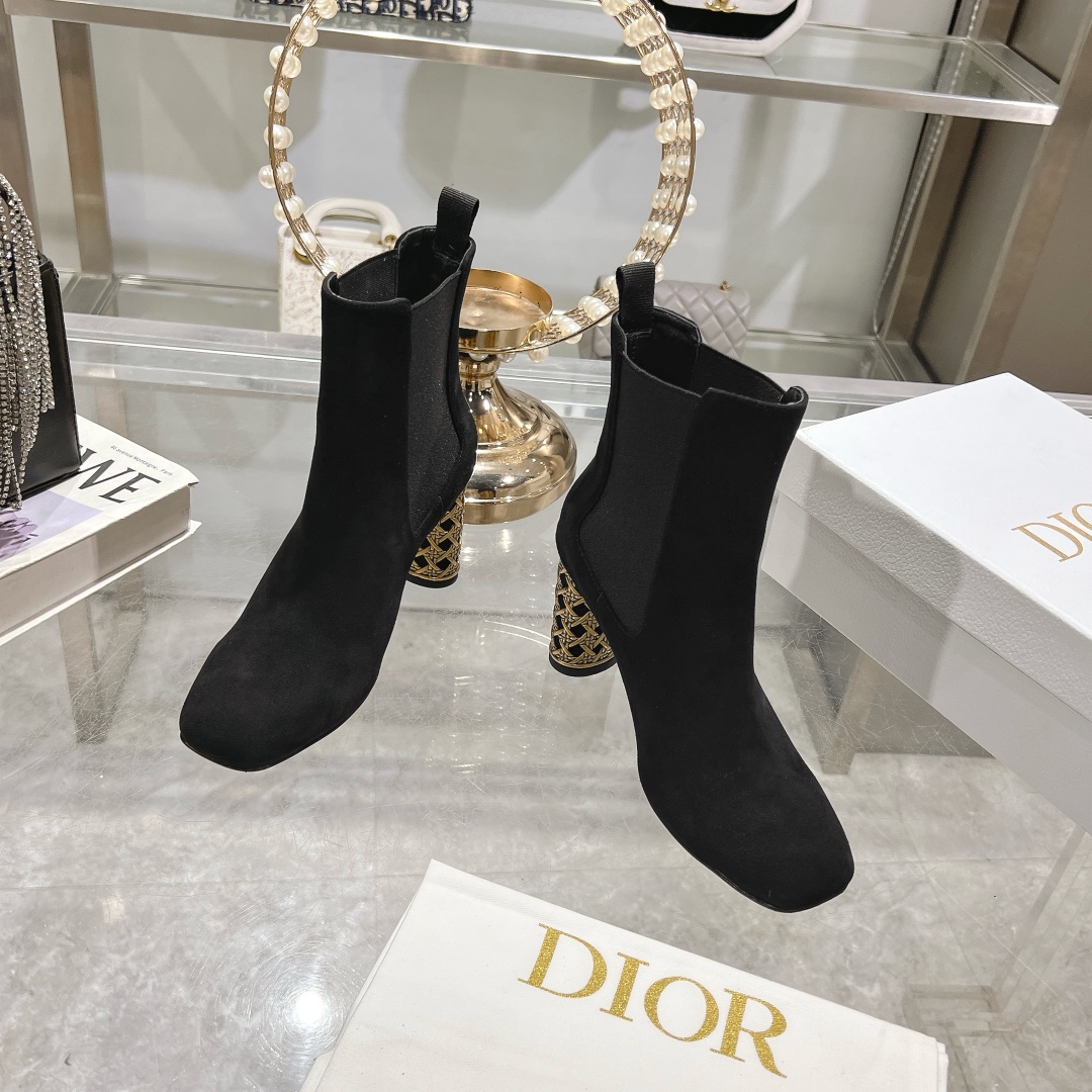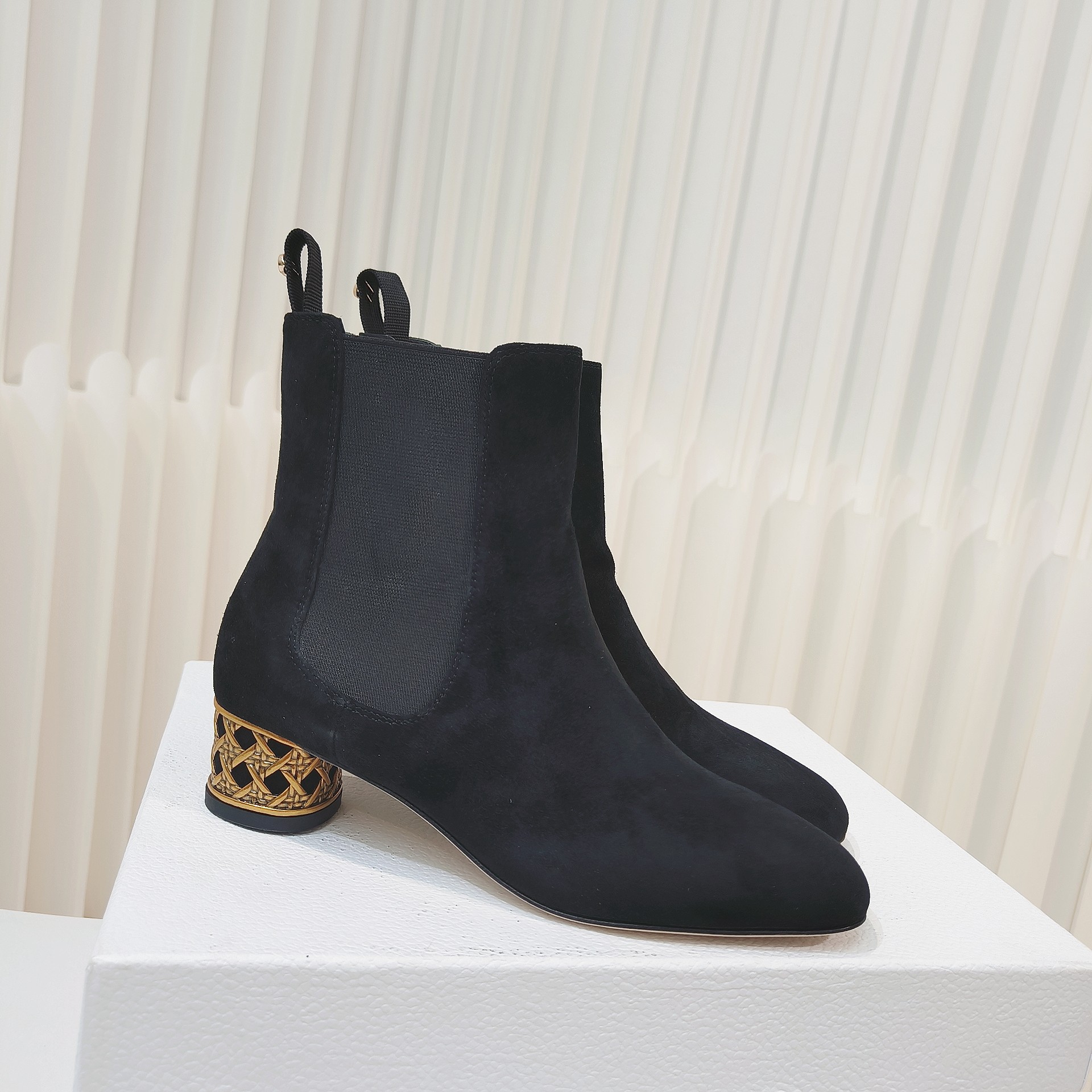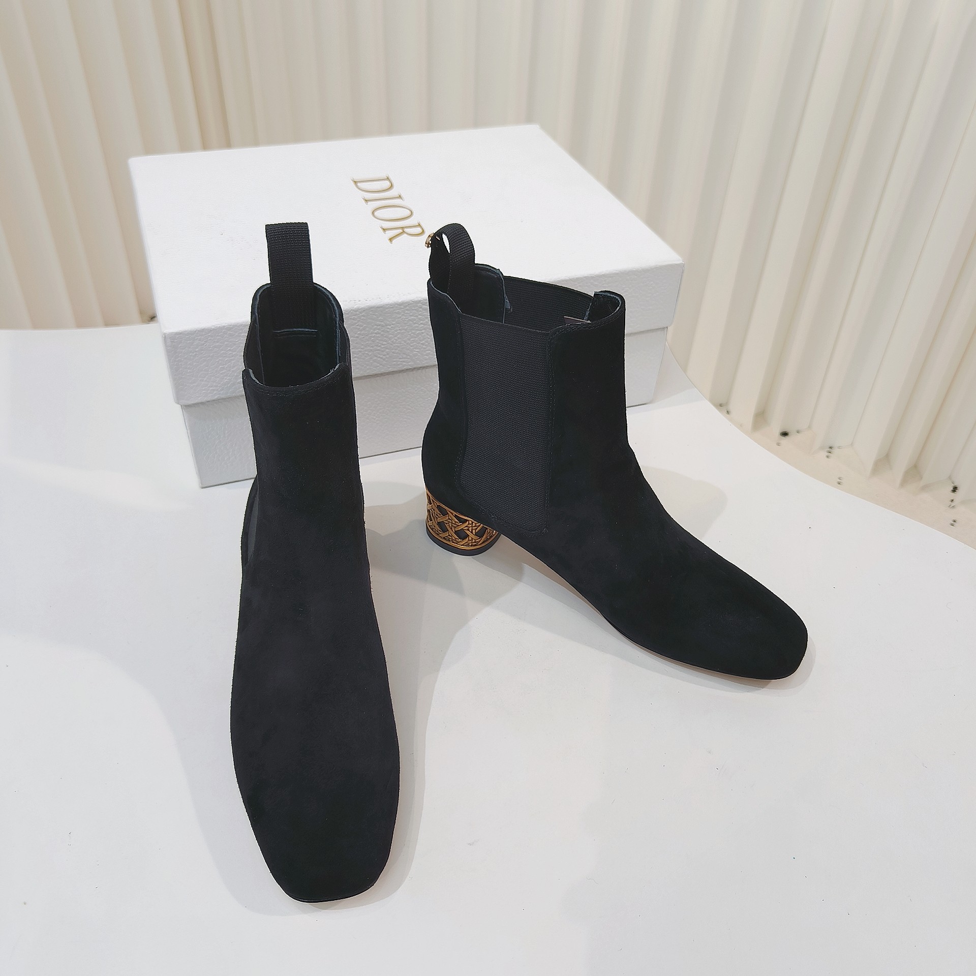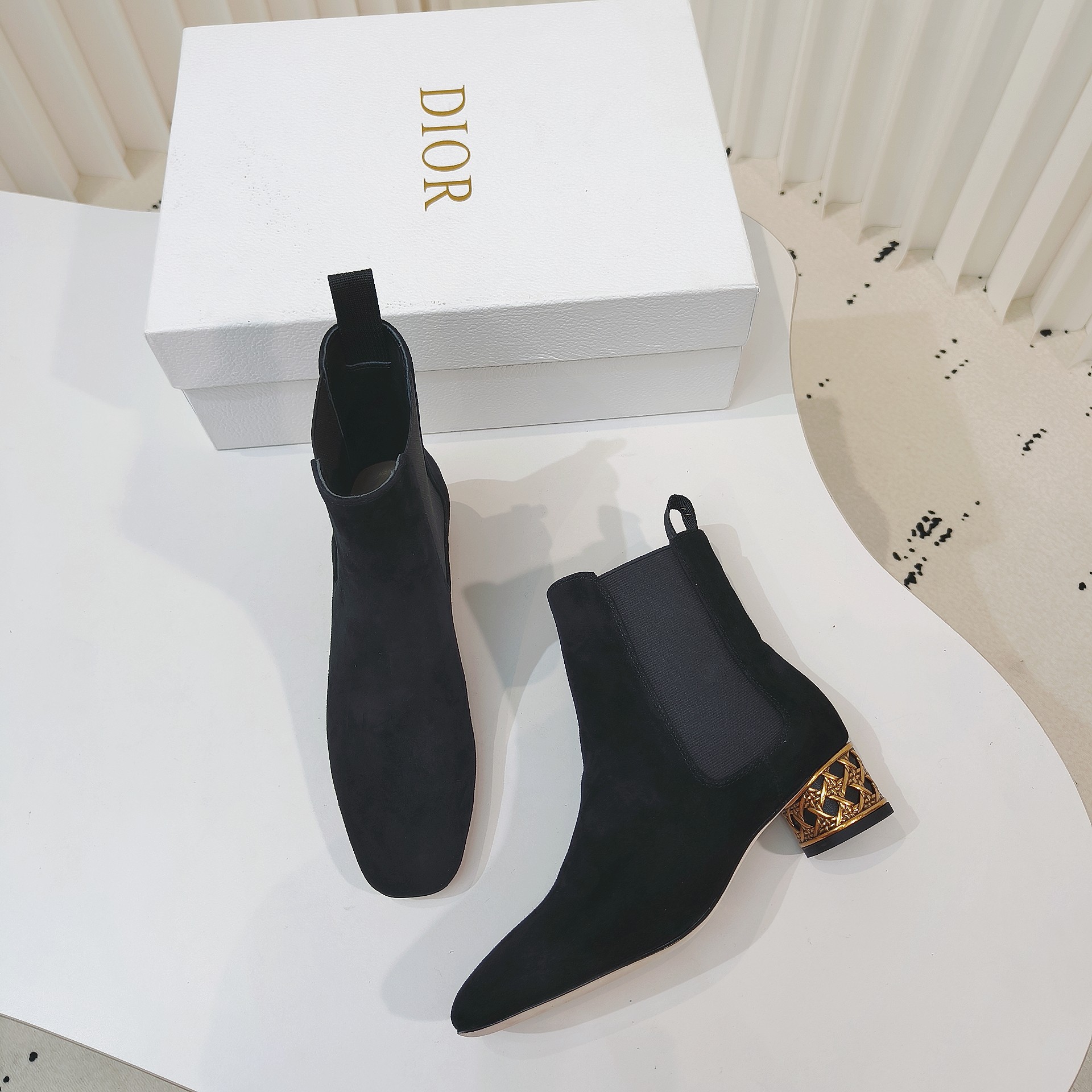 The Dior Icon Ankle Boots offer a sleek and refined take on contemporary footwear with their smooth black suede construction. Featuring a pointed toe, these boots create an elongated silhouette that exudes understated elegance.
