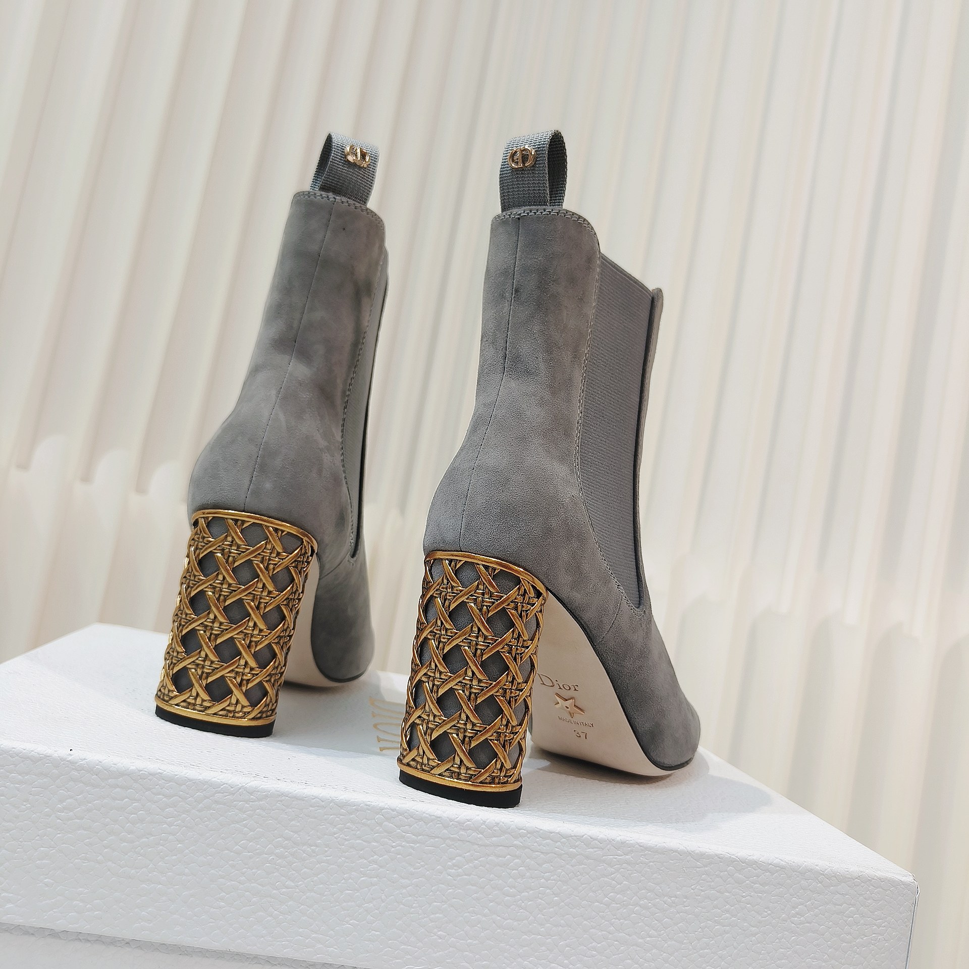 A striking gold-tone lattice block heel adds a touch of artistry, elevating the design with a signature Dior aesthetic. Dual pull-tabs at the back allow for easy wear, maintaining the sleek and structured look. The sturdy yet stylish high heel offers both stability and height, making these boots a versatile choice for polished day-to-night styling.