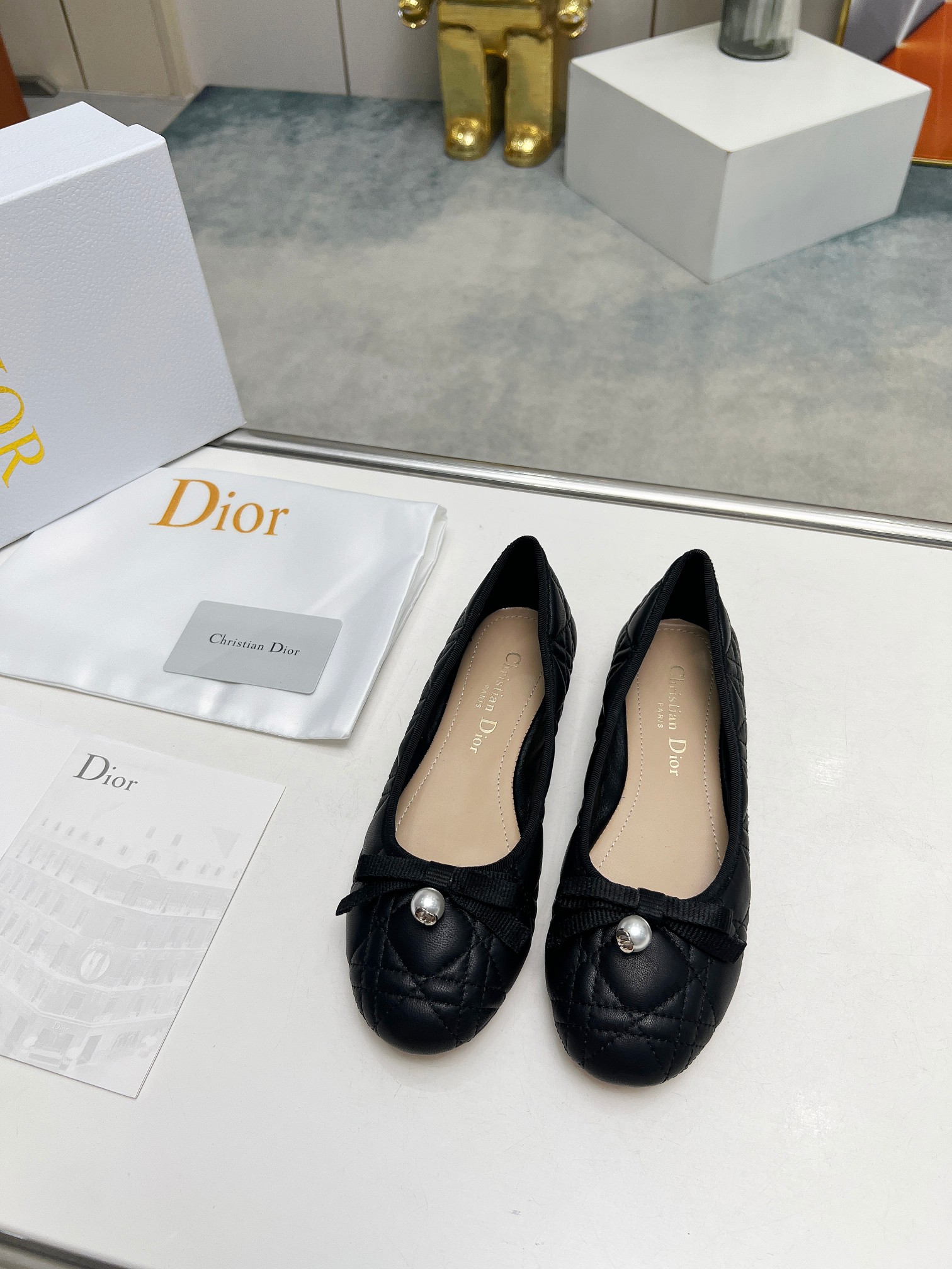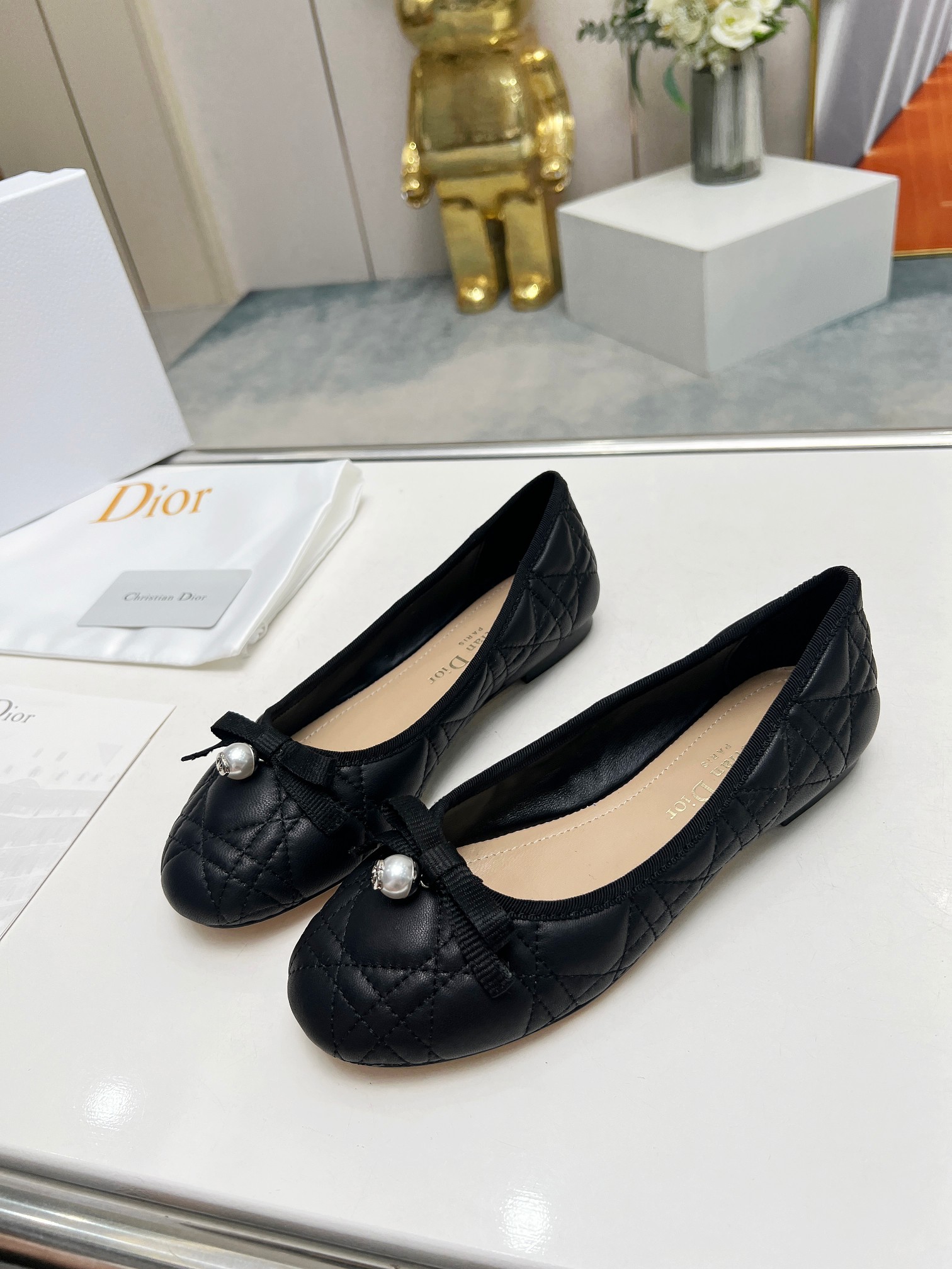 Crafted from luxurious black calfskin, these Dior J’Adior ballet flats feature the signature Cannage quilted stitching for a timeless look. The rounded toe is adorned with a delicate grosgrain ribbon bow, accented by a refined pearl charm for an extra touch of elegance.