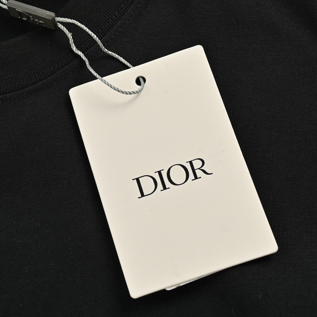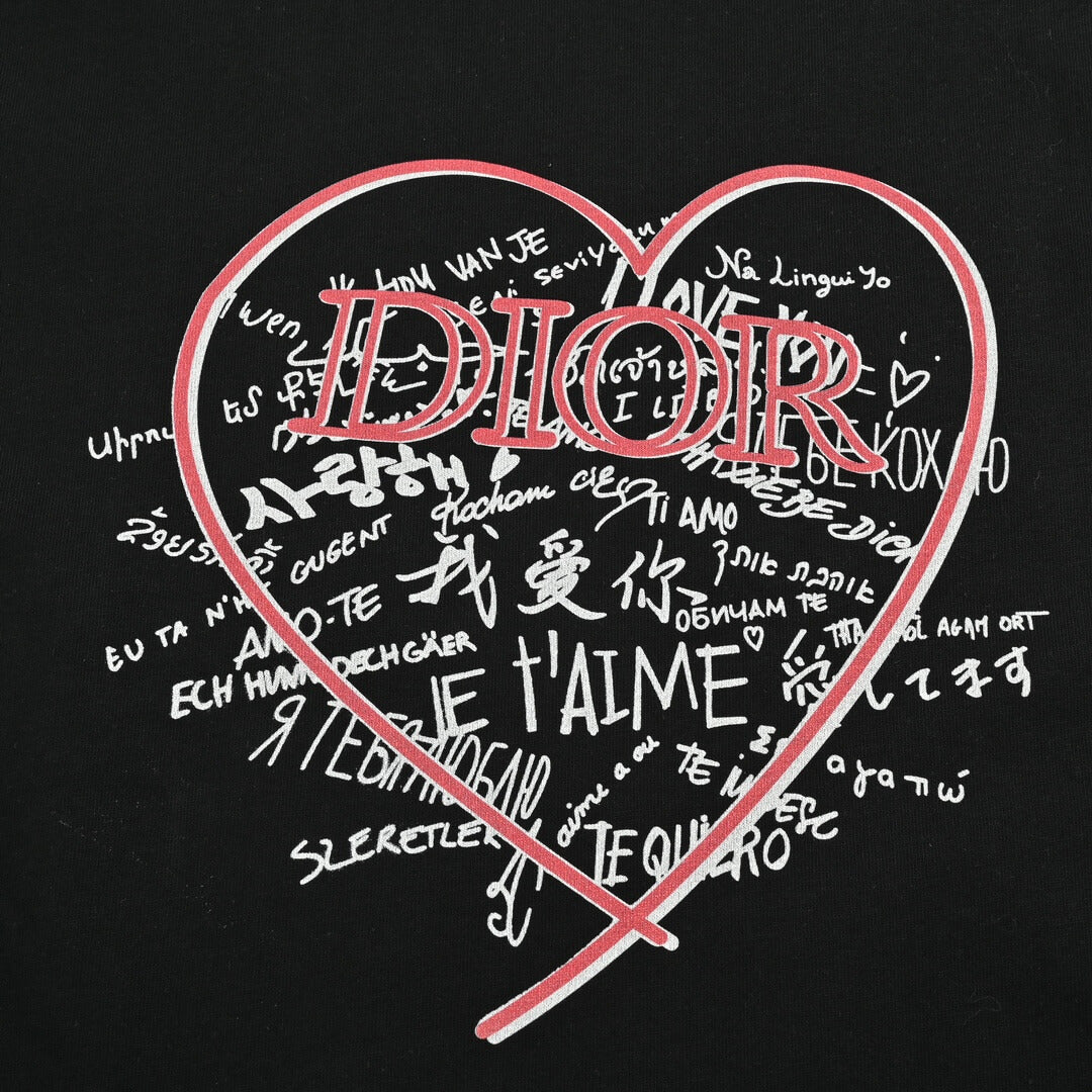 Express your affection with this stylish black Dior love print T-shirt. Featuring a vibrant pink heart outline encompassing the “Dior” logo and various “love” related phrases in different languages, this tee exudes a romantic and artistic charm. Crafted from soft and breathable cotton fabric, it offers a comfortable fit, making it a wonderful choice for the warmer seasons. Pair it with your favorite bottoms for a casual yet expressive look.