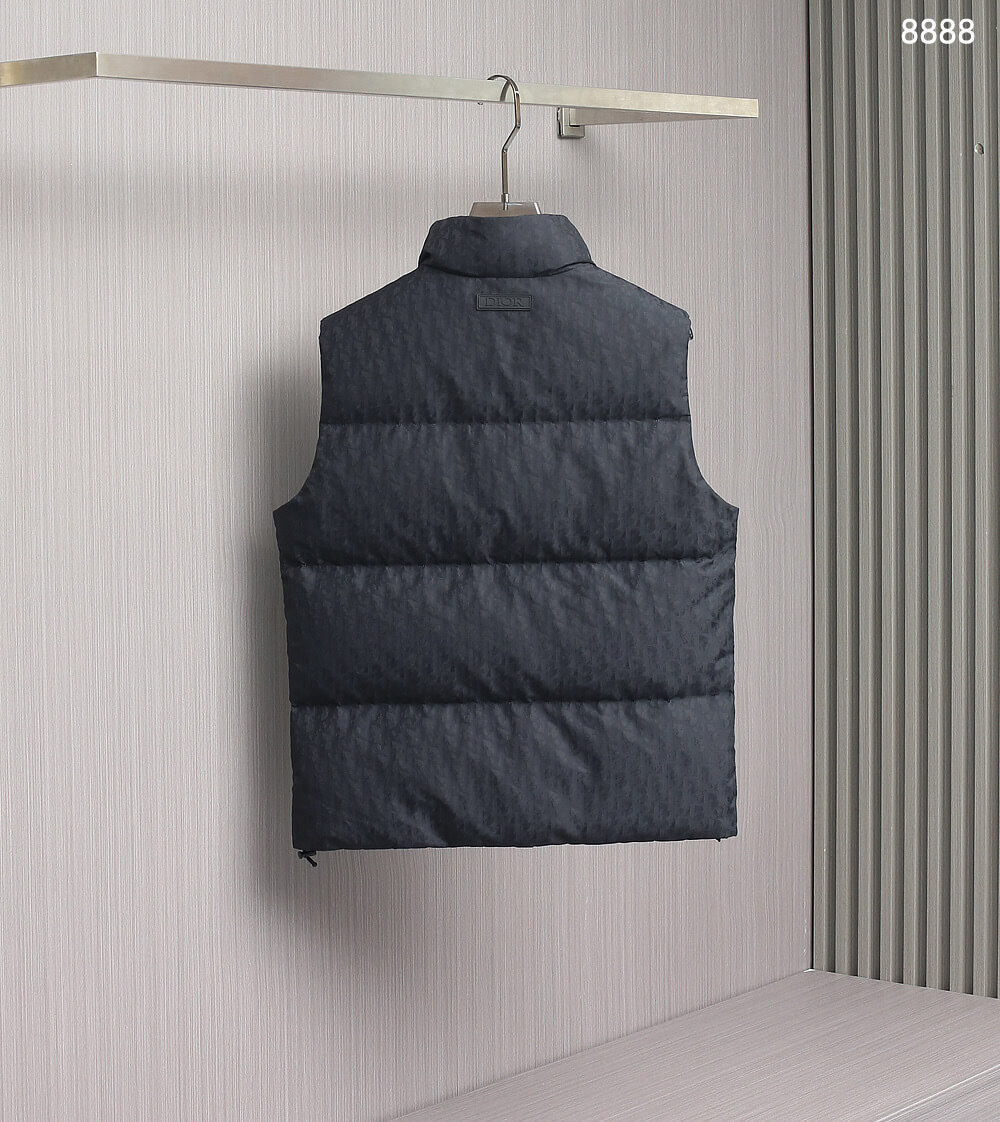 The Dior Oblique Lightweight Puffer Vest in black is a quintessential piece of modern luxury outerwear. It provides the necessary core insulation of a puffer without the bulk, making it an extremely practical garment. The signature Oblique pattern subtly elevates the technical fabric, ensuring that even this functional item carries a distinct luxury identity. Its clean lines, simple snap-button placket, and high stand collar make it versatile enough to be dressed up over formal trousers or down with casual streetwear.